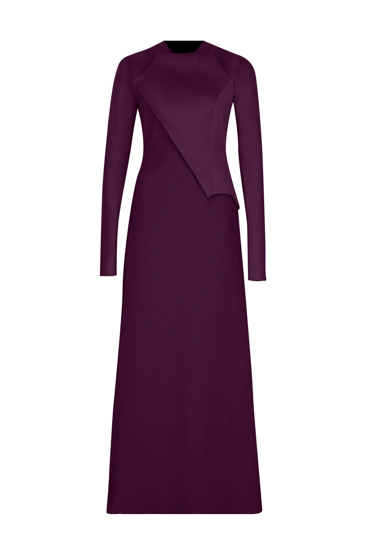 A refined minimalist silhouette elevated by sculptural satin paneling that creates a striking asymmetric composition across the bodice. The long, clean sleeves and smooth round neckline balance the architectural detailing, while the full-length skirt flows with understated elegance. A modern, gallery-inspired evening piece for formal events where sophistication is expressed through structure and simplicity.