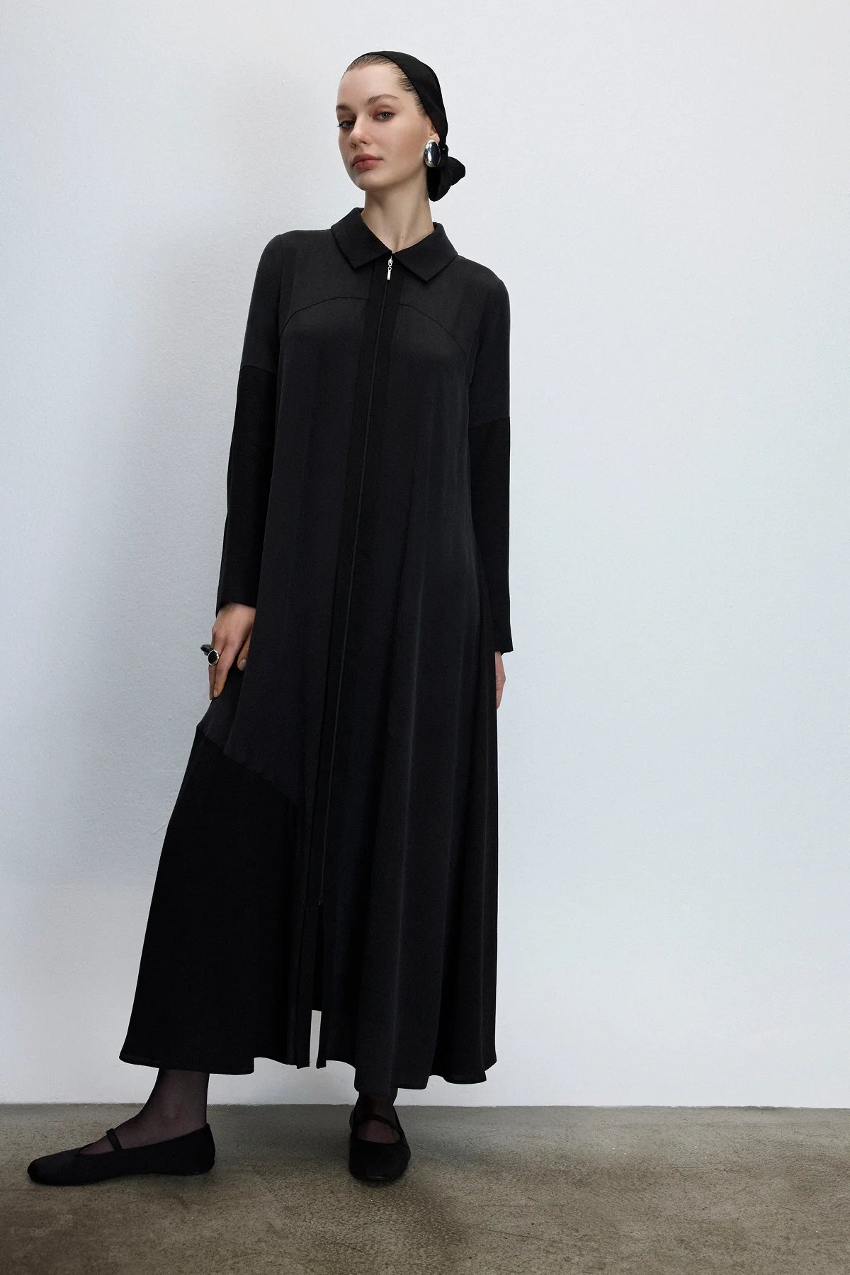 A refined, contemporary abaya designed with a clean shirt collar and a full-length front zipper. The fluid A-line silhouette drapes elegantly, while subtle tonal paneling adds depth and movement without overpowering the minimalist design. A versatile piece that transitions effortlessly from everyday wear to elevated modest styling.