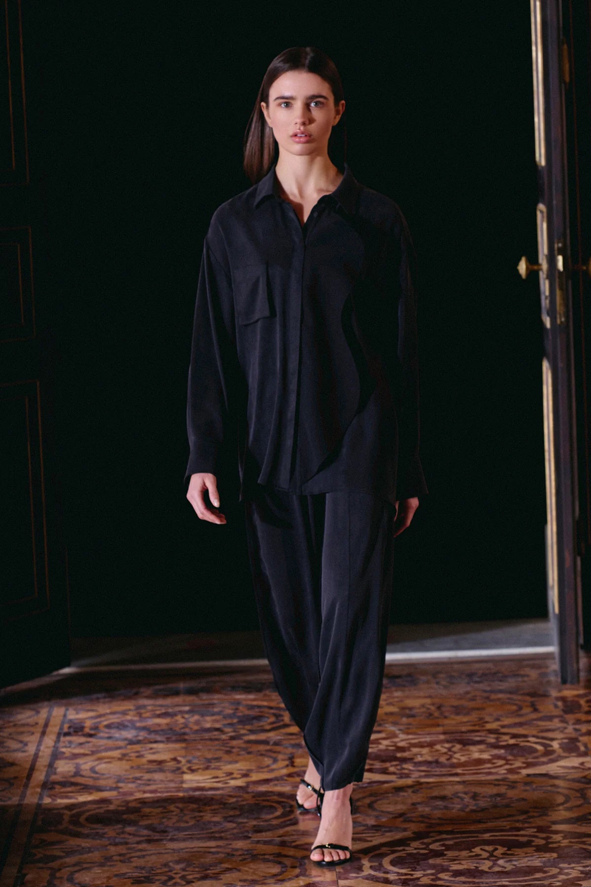 A relaxed, premium co-ord set crafted from soft Tencel, offering fluid drape and elevated minimalism. The long-sleeve shirt features an oversized silhouette with a clean collar and front flap pocket, while the matching trousers fall loosely with a tapered hem for effortless movement. An understated yet refined ensemble suited for both daywear and elegant evening styling.