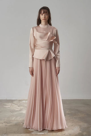 Asymmetric Draped Satin Long Evening Dress with Stone Embellishments - Beige
