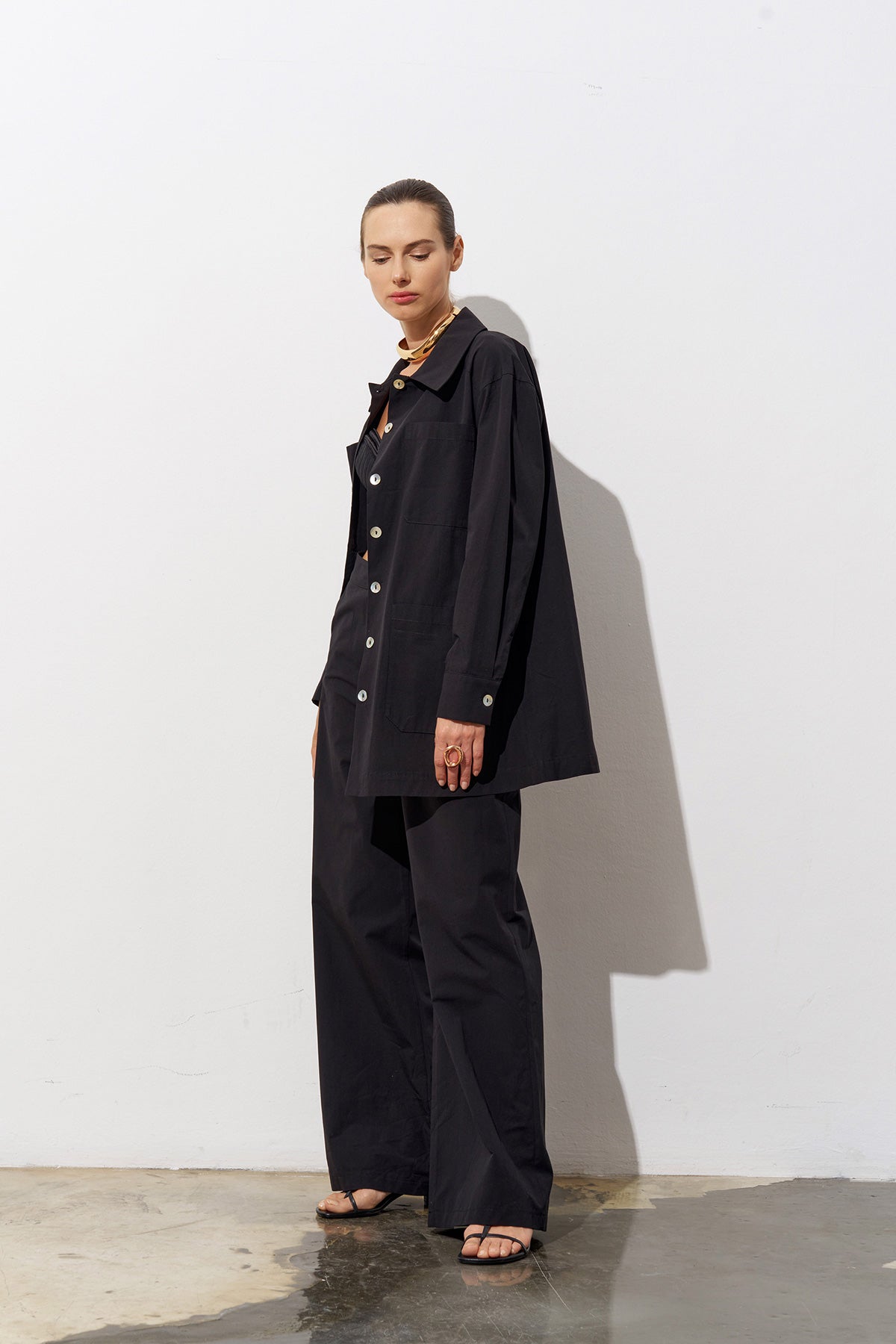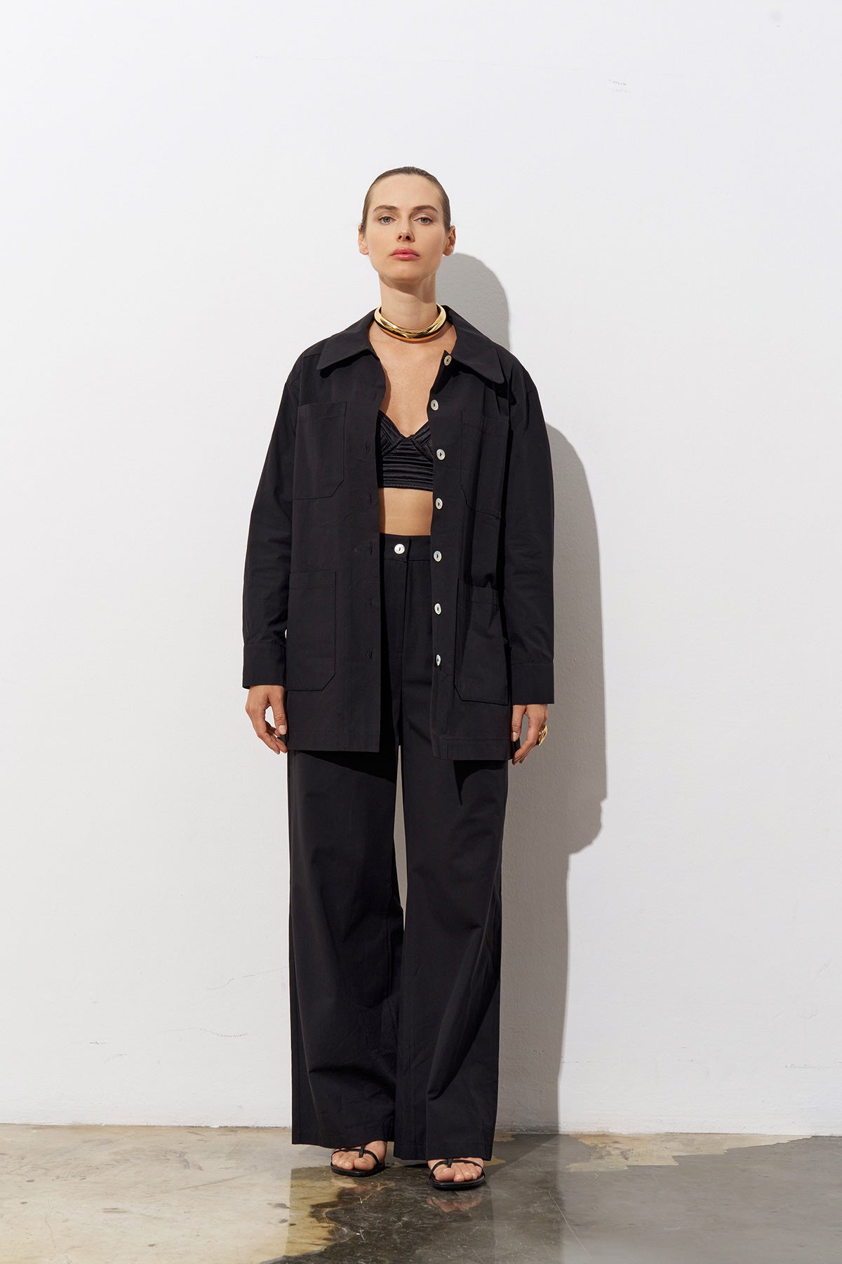 Designed for those who embrace vibrant energy and effortless style, the Gilly two-piece set in black offers a modern take on refined casualwear. The top features a button-up shirt-jacket silhouette with long sleeves and spacious front pockets, exuding contemporary ease. The wide-leg trousers provide relaxed movement, making the ensemble perfect for both workdays and weekends.