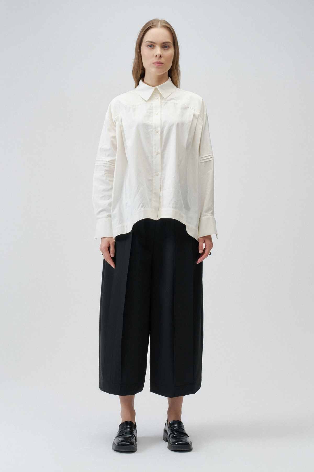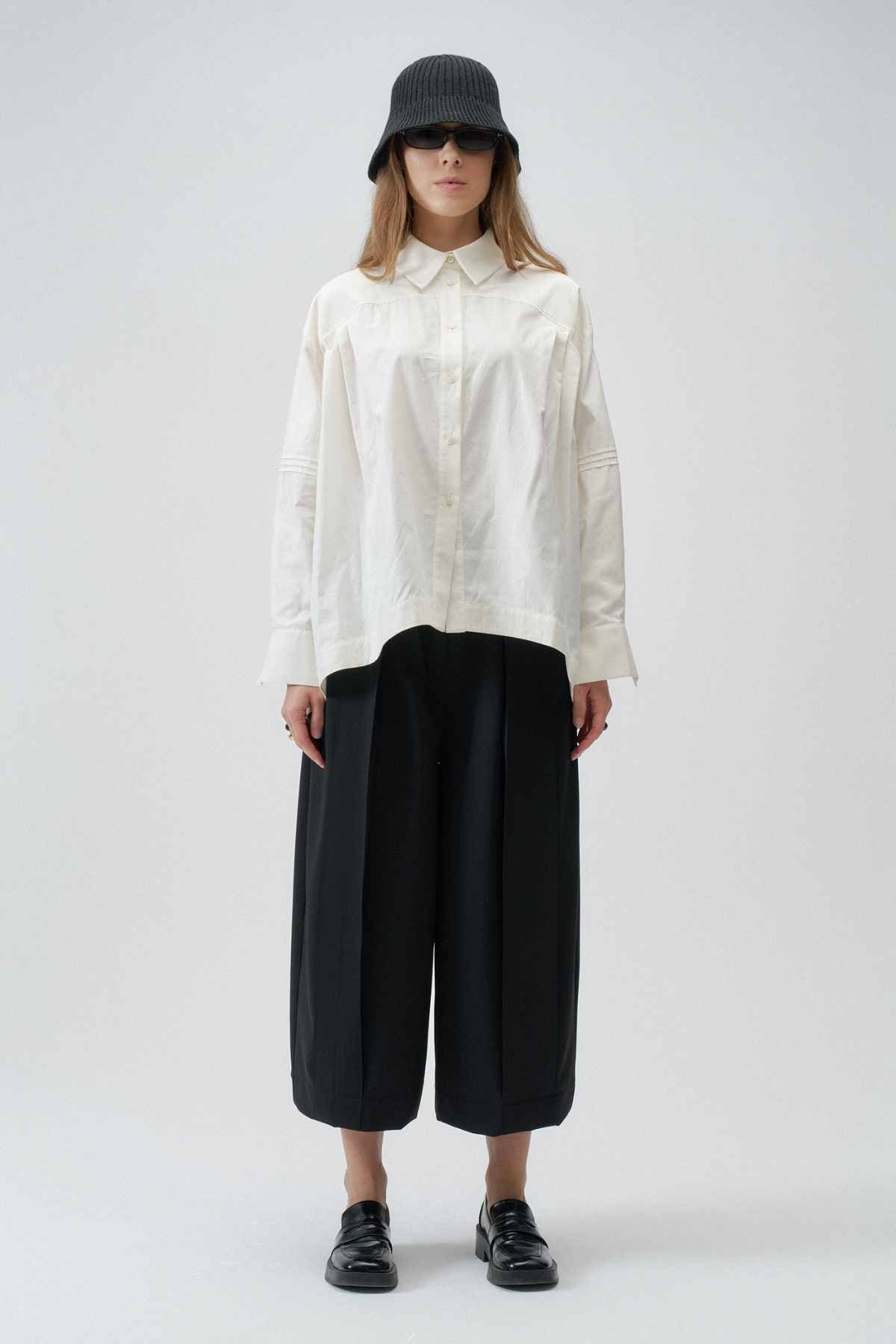 The Moon Poplin Shirt captures the serenity of moonlight through its sculptural folds and soft structure. Crafted from a refined cotton blend, this piece features delicate pleats along the yoke and fine pintuck detailing on the sleeves, lending a sense of volume and artistry. Its relaxed oversized silhouette flows effortlessly, offering a harmonious balance of strength and grace — a modern ode to understated luxury.