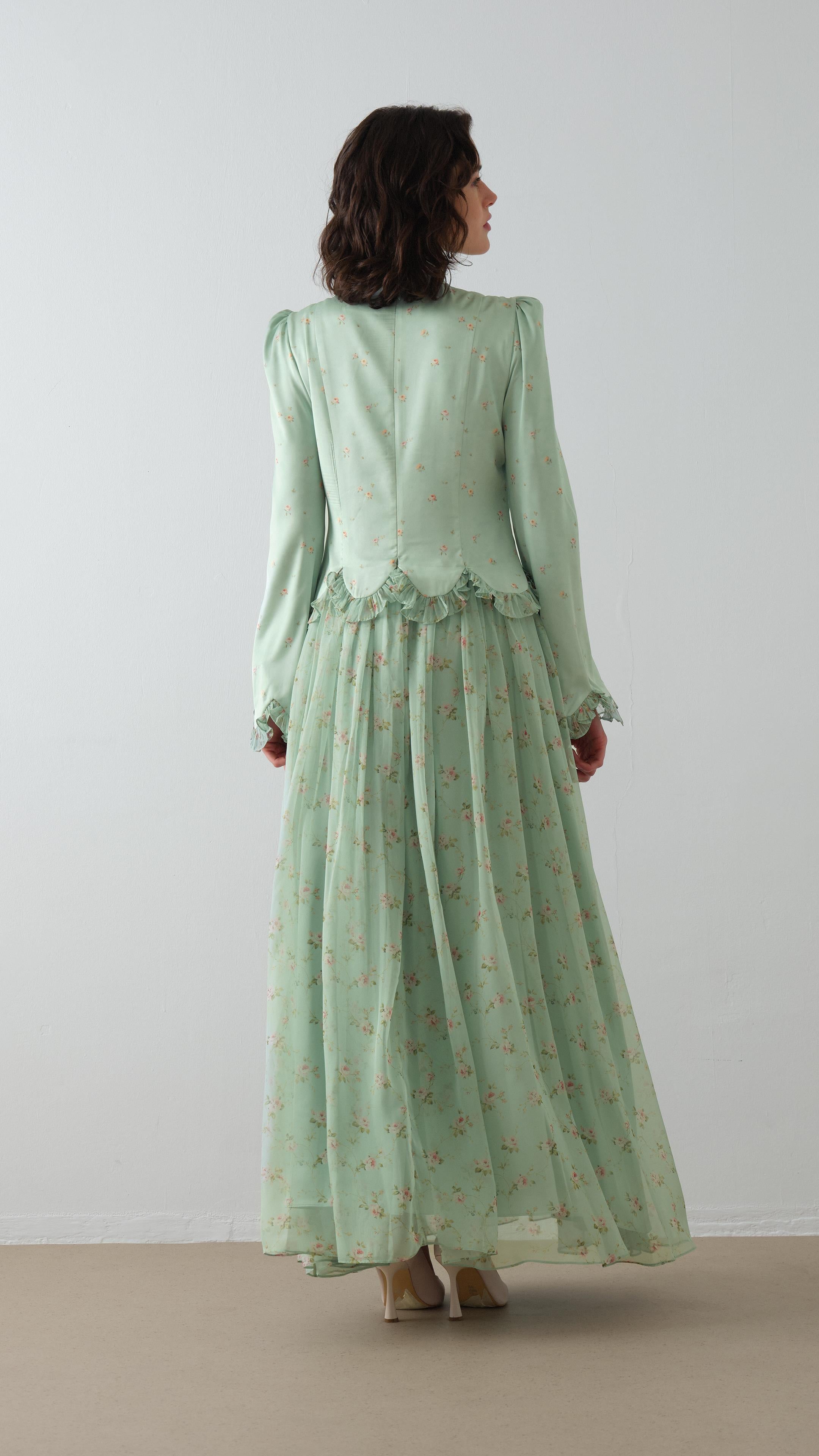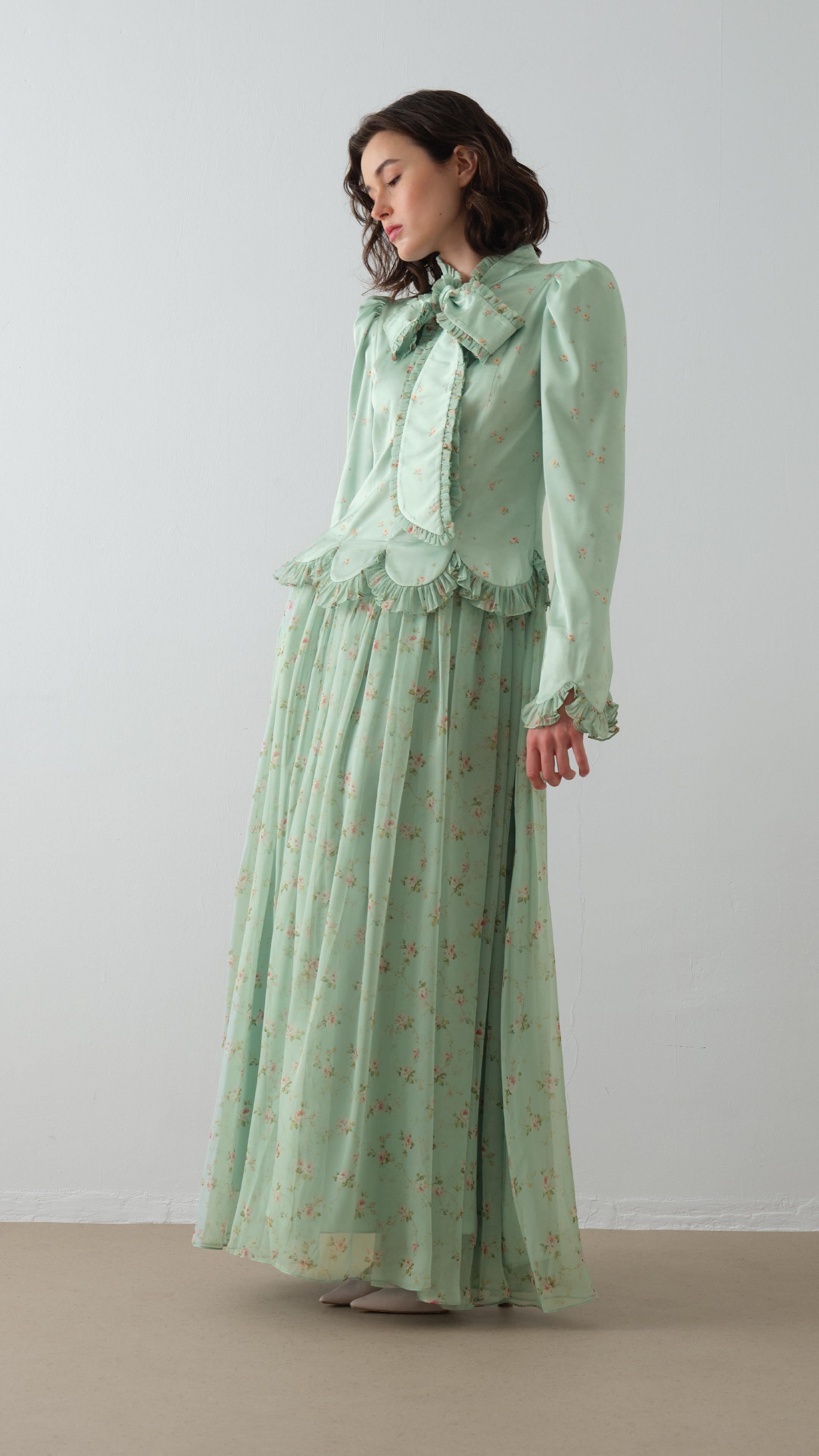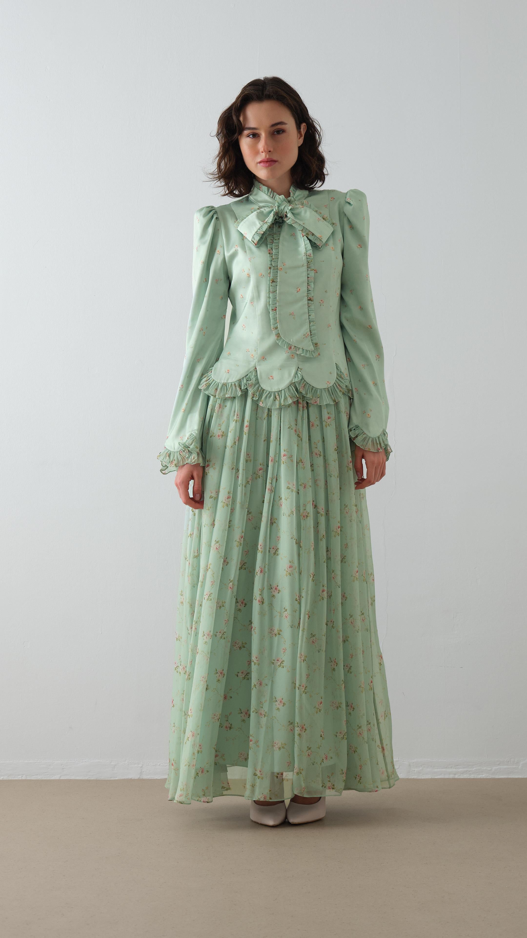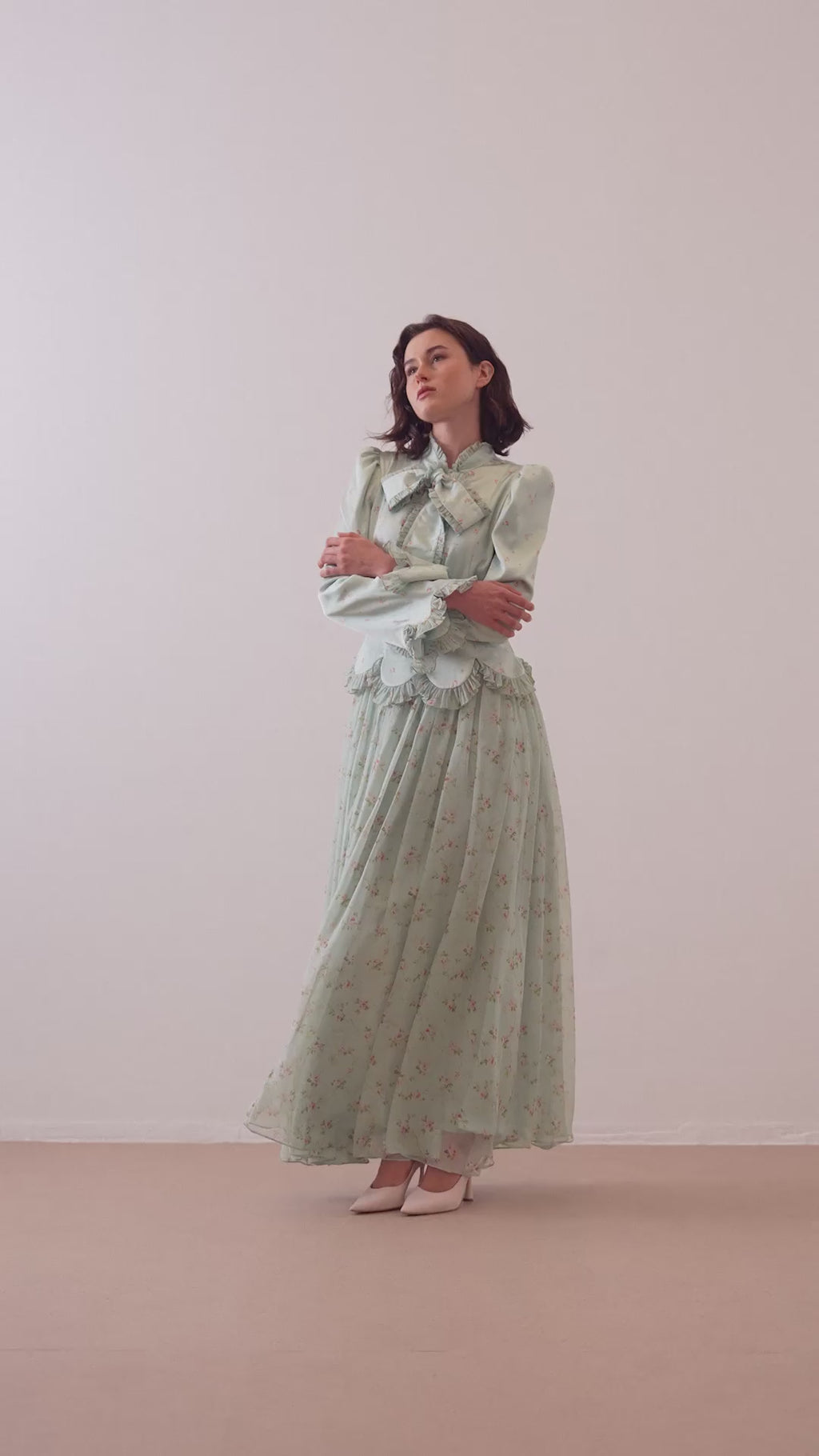 This bow-neck floral maxi dress channels timeless elegance with a touch of vintage romance. Designed in mint green with delicate floral motifs, it features a dramatic bow tie at the neckline and ruffled detailing along the bodice for a refined finish. Voluminous puff sleeves with lace-trimmed cuffs complement the flowing pleated skirt, creating graceful movement. Crafted from lightweight polyester, this dress is a statement piece reminiscent of period film elegance, perfect for special occasions.
