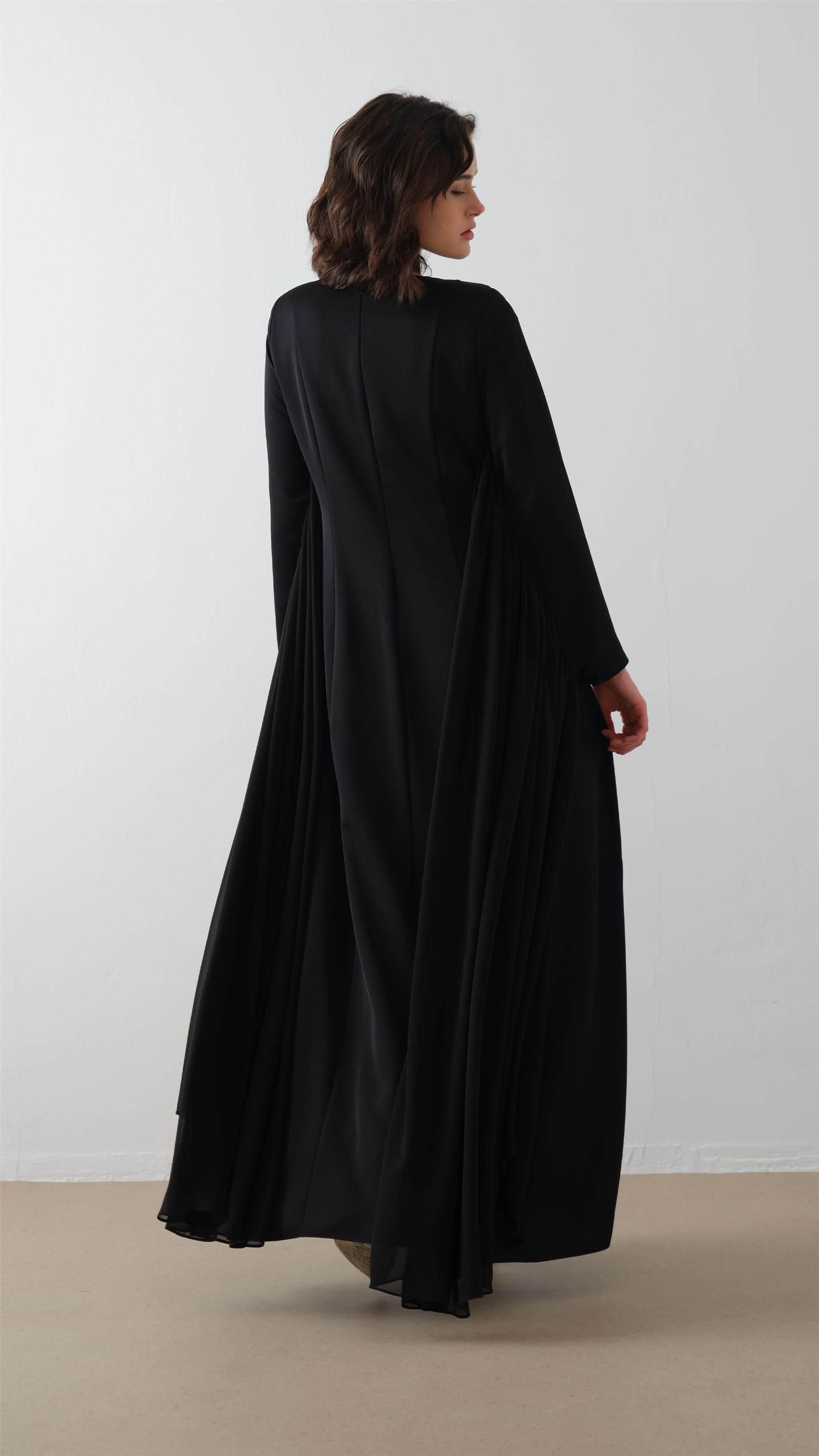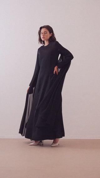 With its elegant crew neckline and flowing cape sleeves, this refined dress is a graceful choice for special occasions. The minimal silhouette is elevated by soft draping and an airy back panel, bringing timeless poise to your wardrobe.