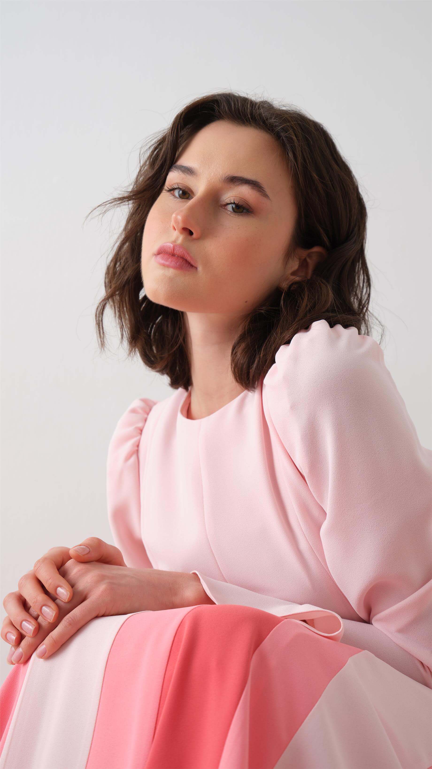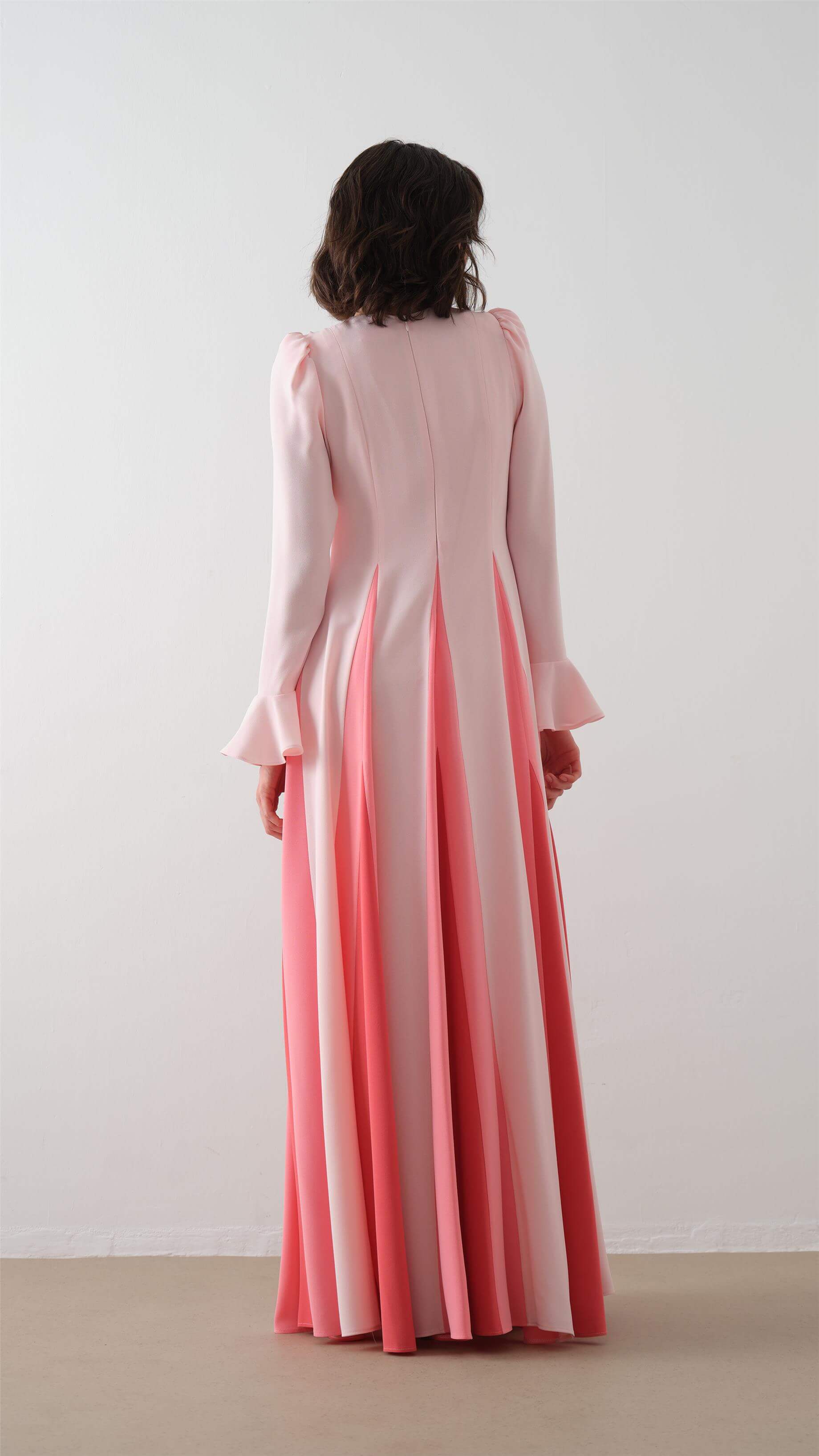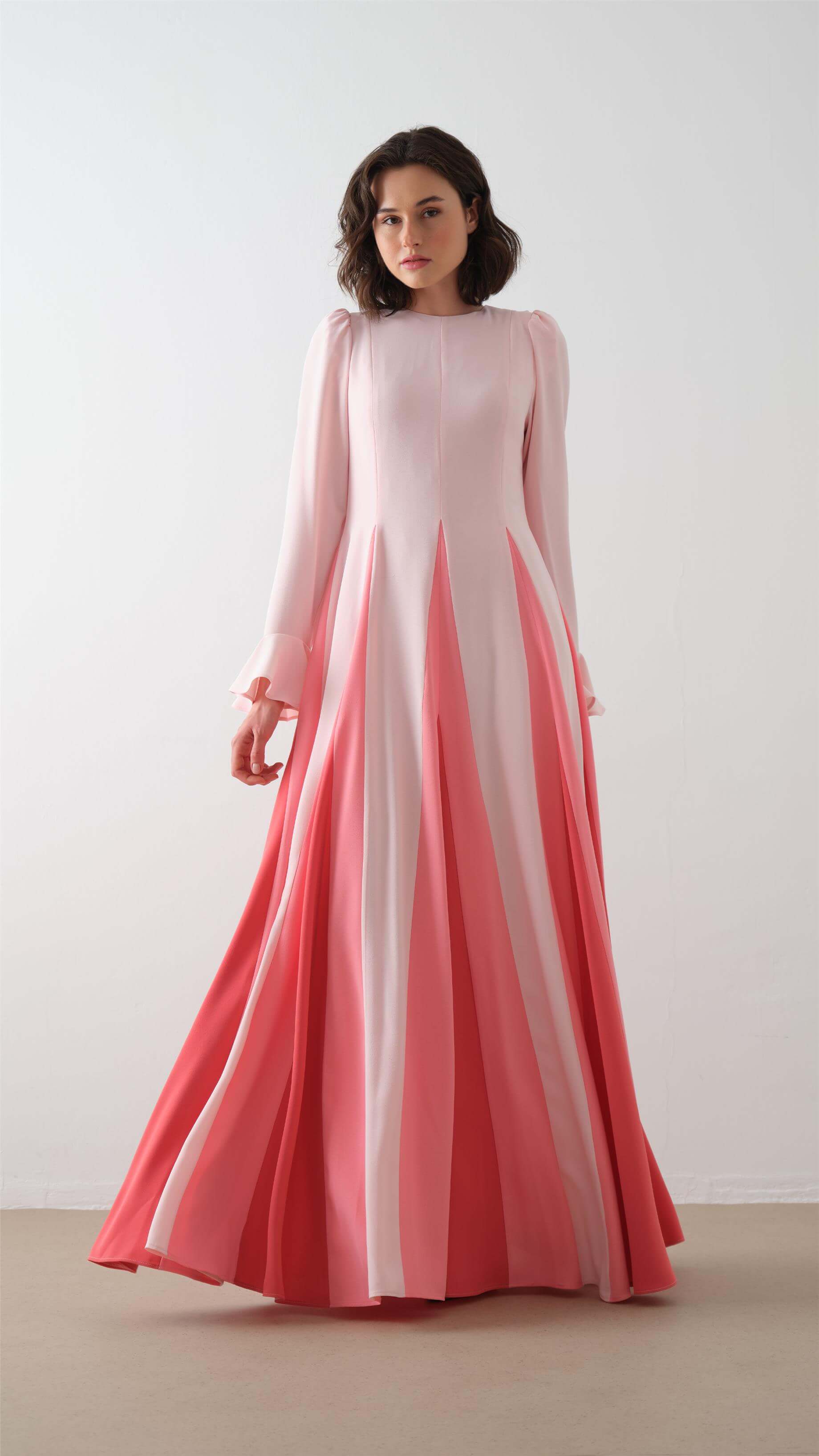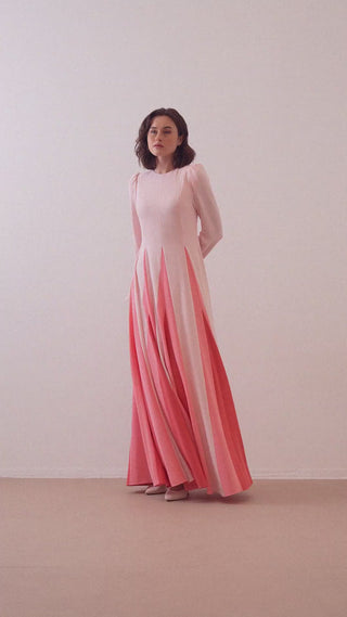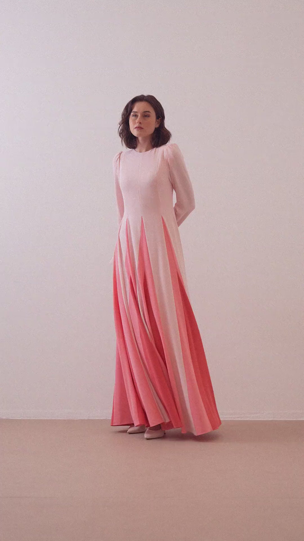 This contrast-panel maxi dress is designed to captivate with bold color blocking and fluid movement. The structured beige bodice flows into a voluminous skirt, animated by striking red panels that bring depth and energy to the silhouette. Subtle puffed shoulders and flared cuffs add a refined touch, while the clean crew neckline balances the dramatic skirt. Crafted from lightweight polyester, it’s a standout choice for evening gatherings and special occasions.