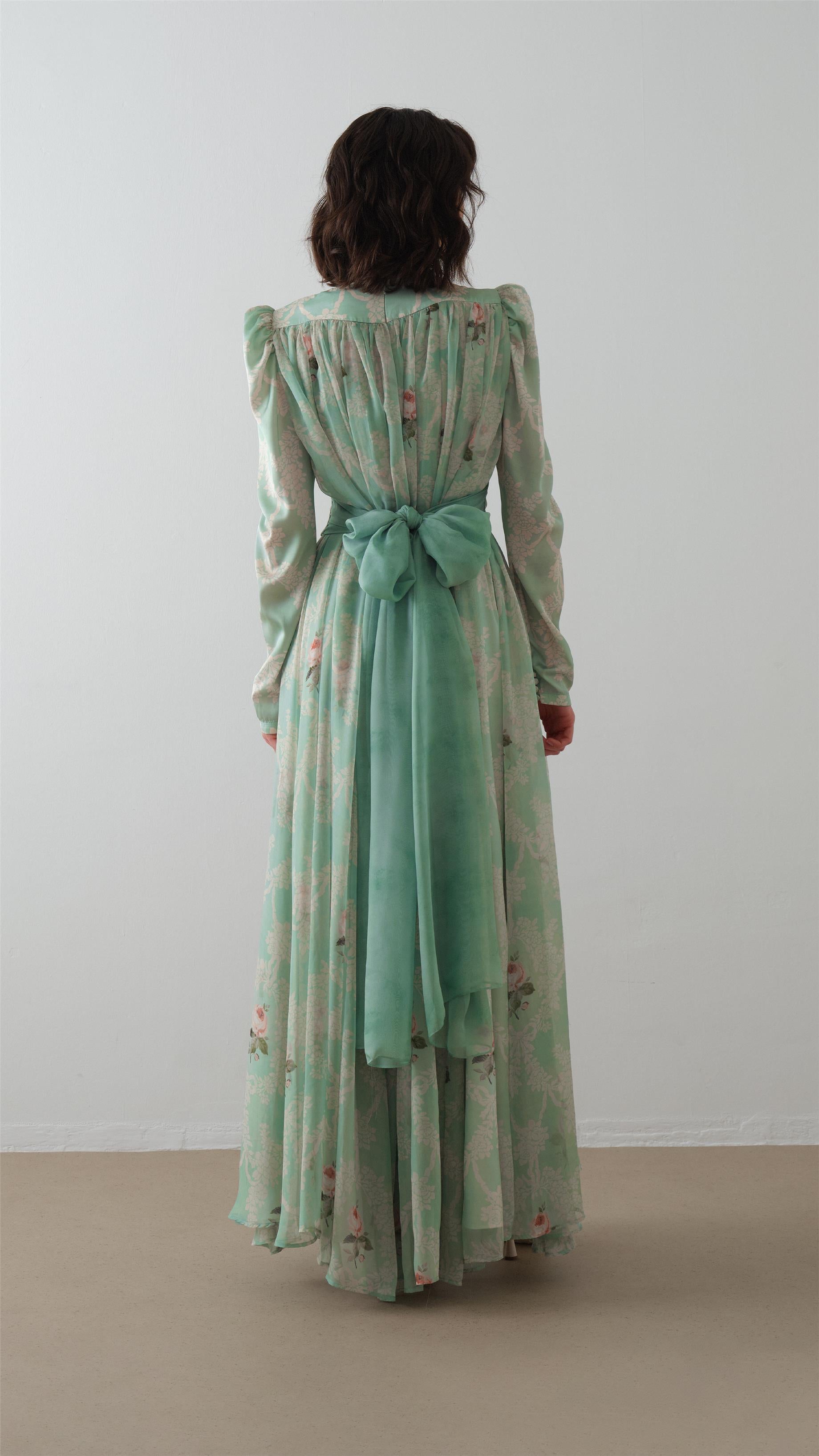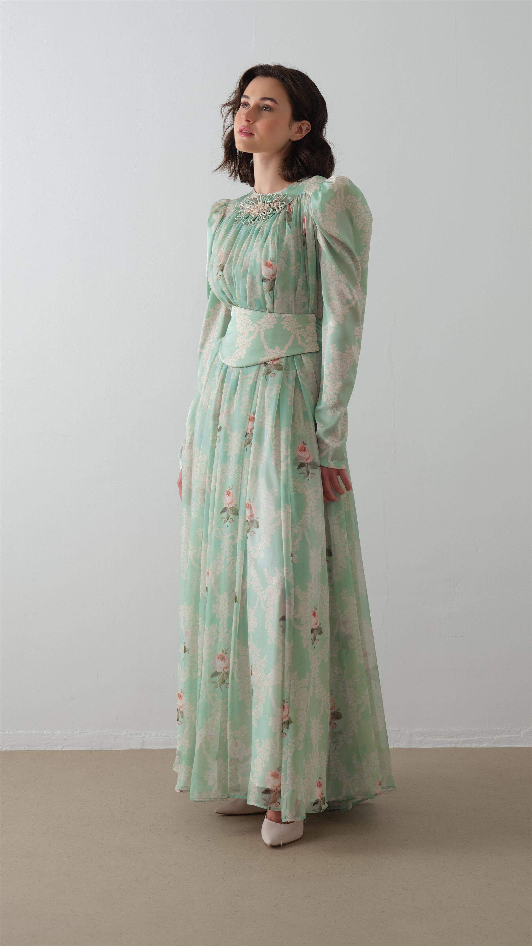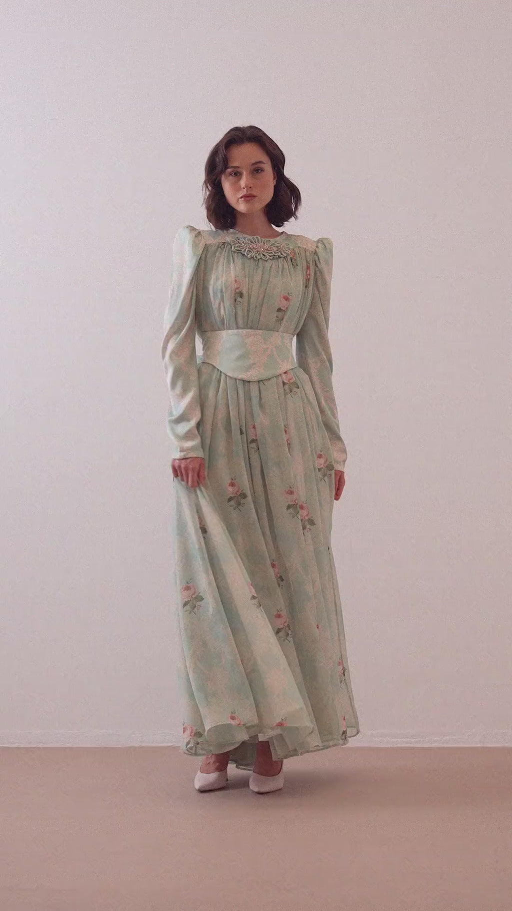 A romantic maxi dress defined by a corset-style waistline and a softly gathered bodice. An ornamental floral detail at the neckline enhances its elegance, while the back-tie corset creates shape and structure. Crafted from lightweight polyester, the flowing skirt offers graceful movement, making it a refined choice for evening occasions.