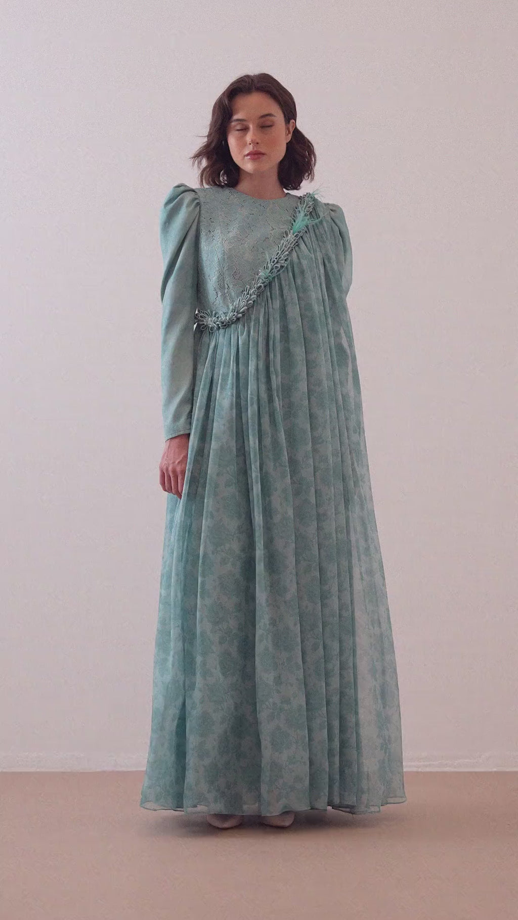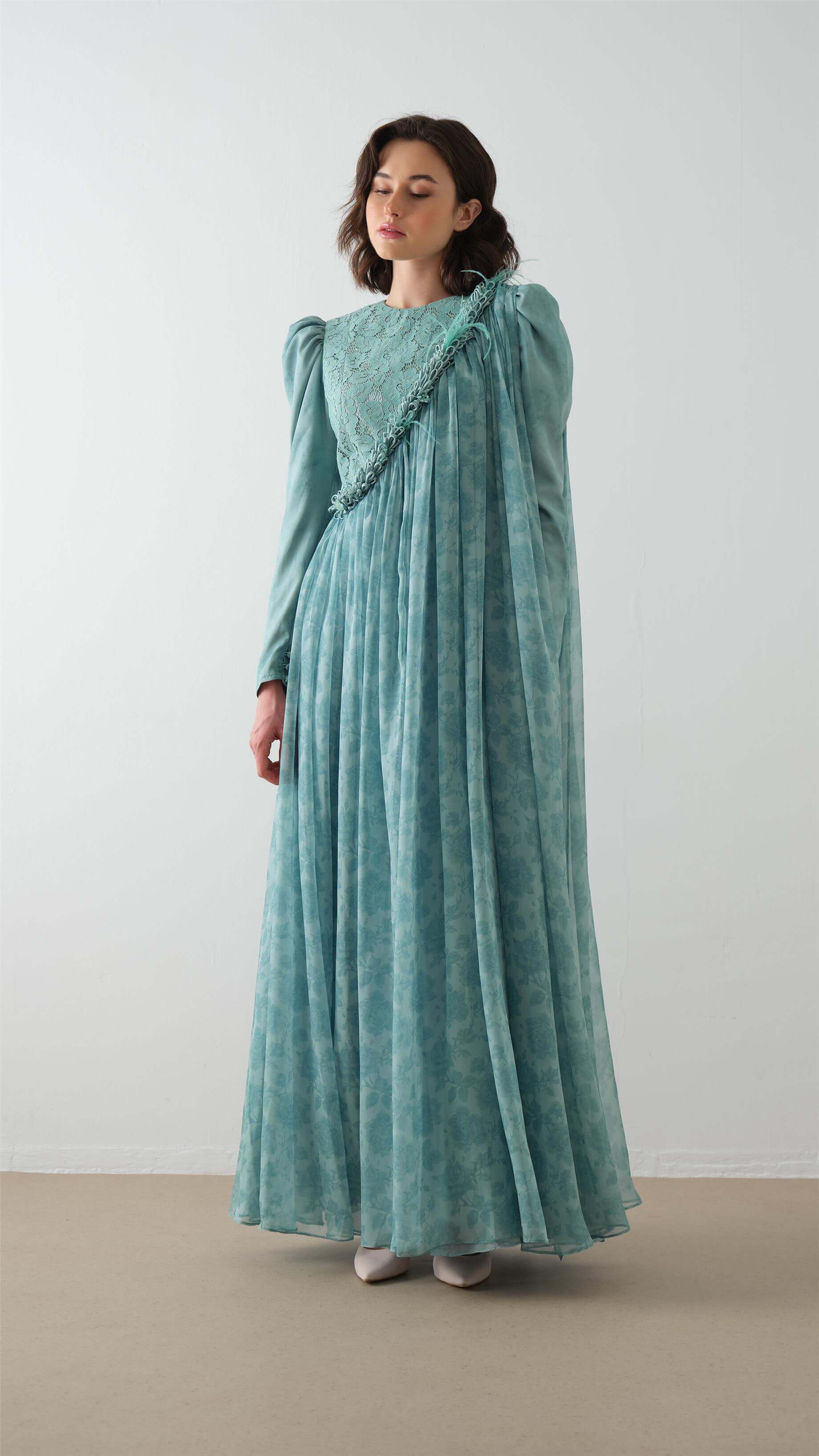 This lace-detailed cape maxi dress is a show-stopping design defined by elegance and drama. The structured lace bodice is adorned with a cross-body floral appliqué that seamlessly flows into a sheer cape drape from the shoulder. Crafted in muted green, the voluminous skirt reveals a delicate floral texture beneath its semi-sheer layers, moving gracefully with every step. Perfect for special occasions, this piece embodies timeless sophistication with a modern edge.