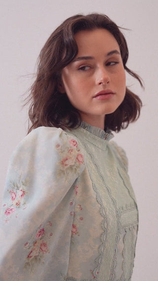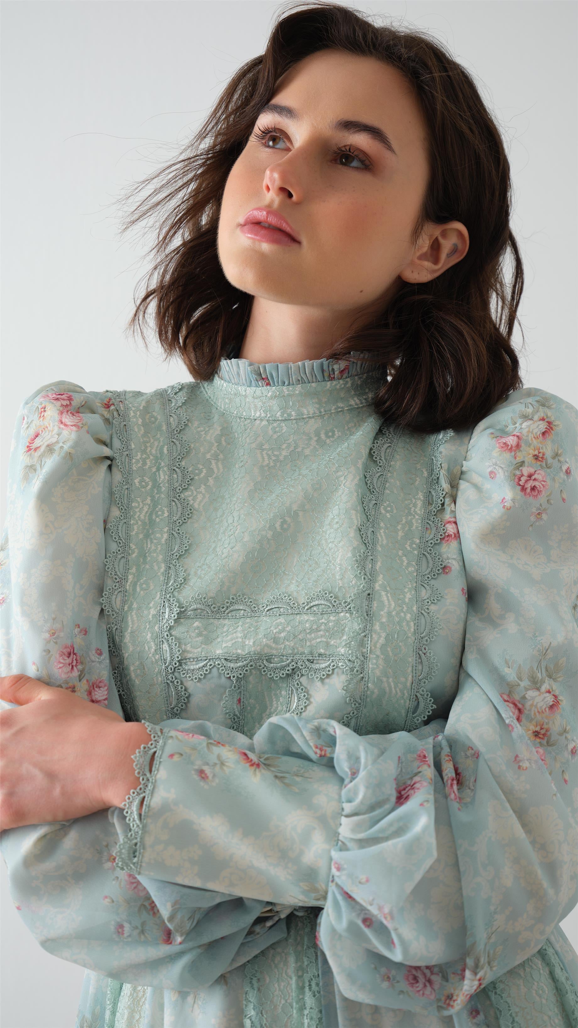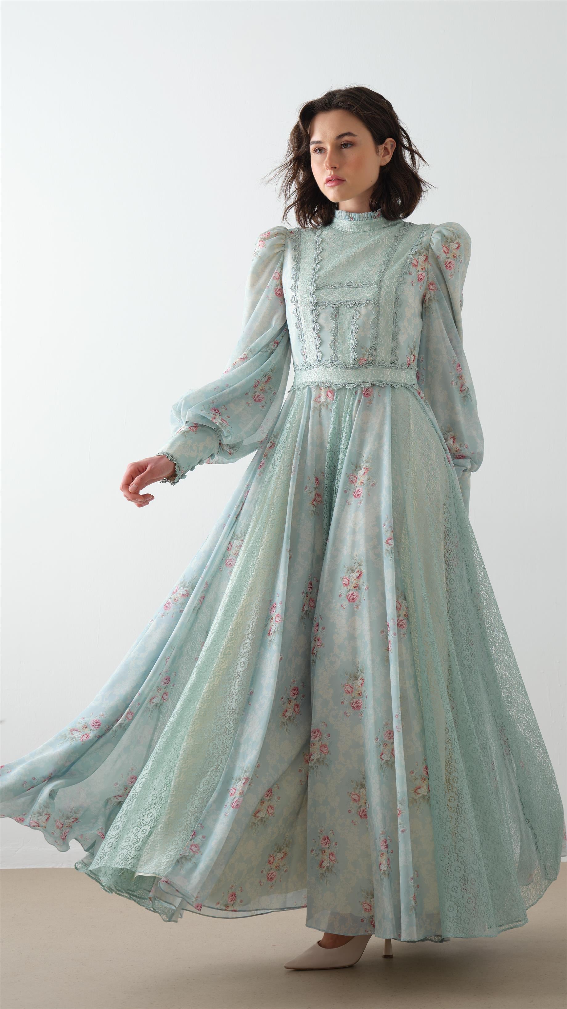 Fit: Structured bodice with puff shoulders and lace-trimmed cuffs; flowing skirt with lace panels for added elegance.