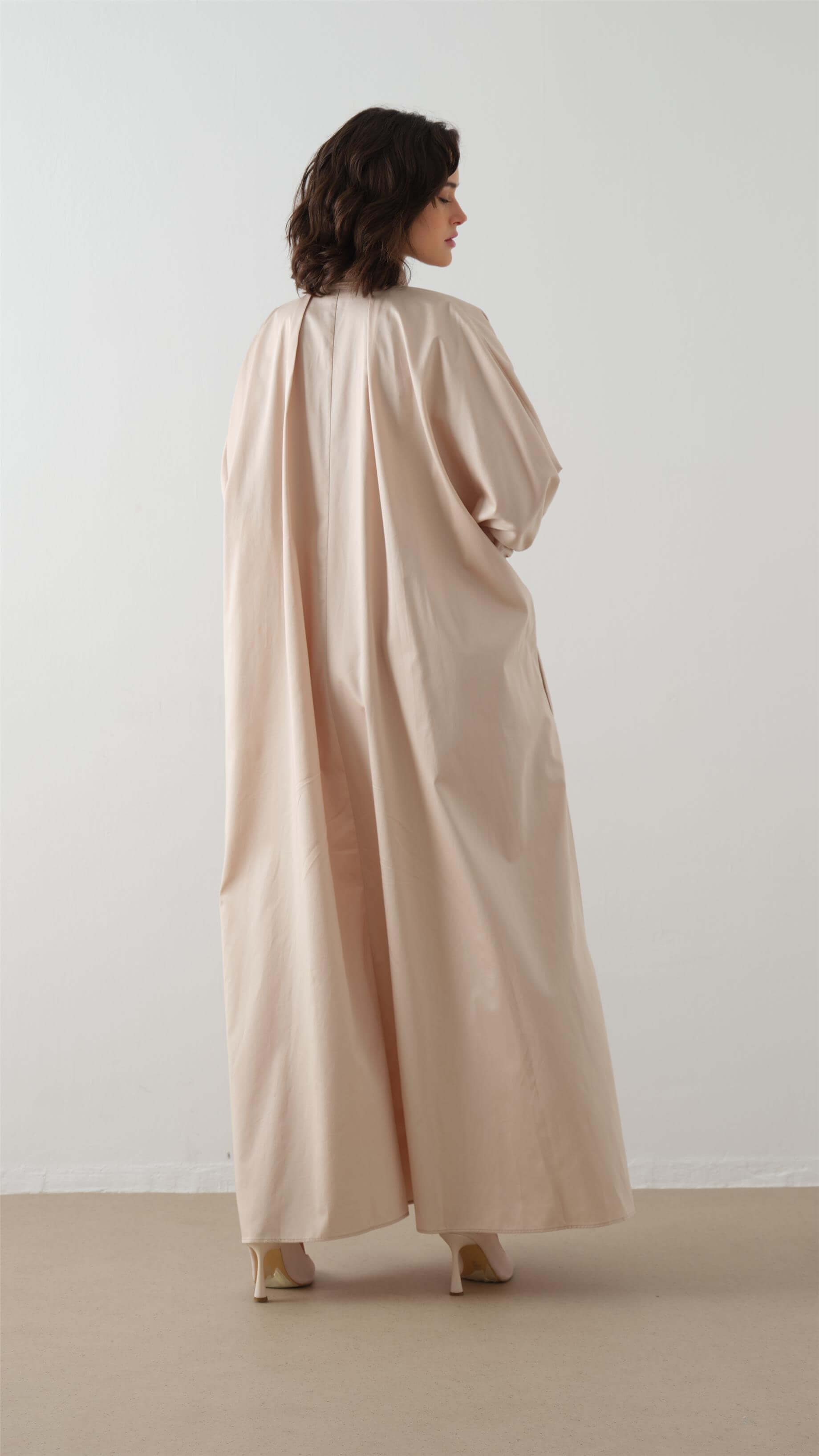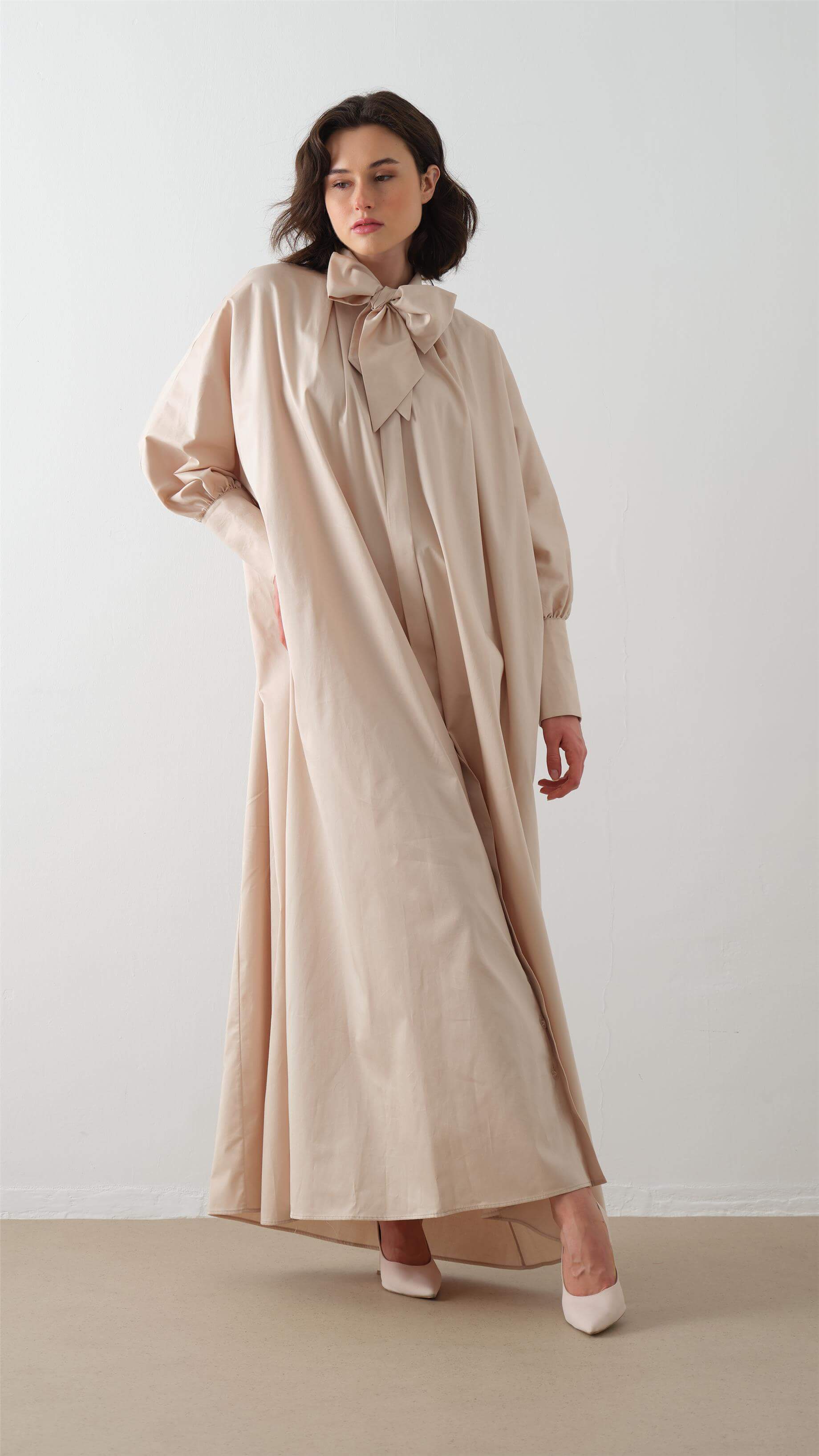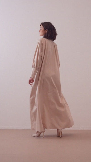 This poplin shirt dress combines effortless comfort with understated elegance. Crafted from 100% cotton in a soft beige tone, it features a relaxed, flowing silhouette enhanced by a refined bow-tie detail at the collar. The wide balloon sleeves with buttoned cuffs add volume and balance to the clean lines of the maxi length. Lightweight and breathable, this dress offers everyday ease while maintaining a polished, timeless look.
