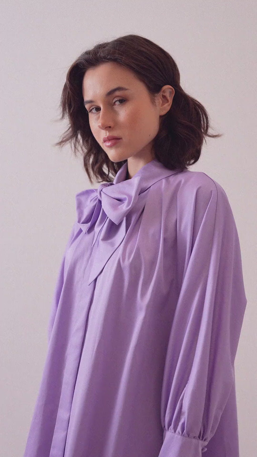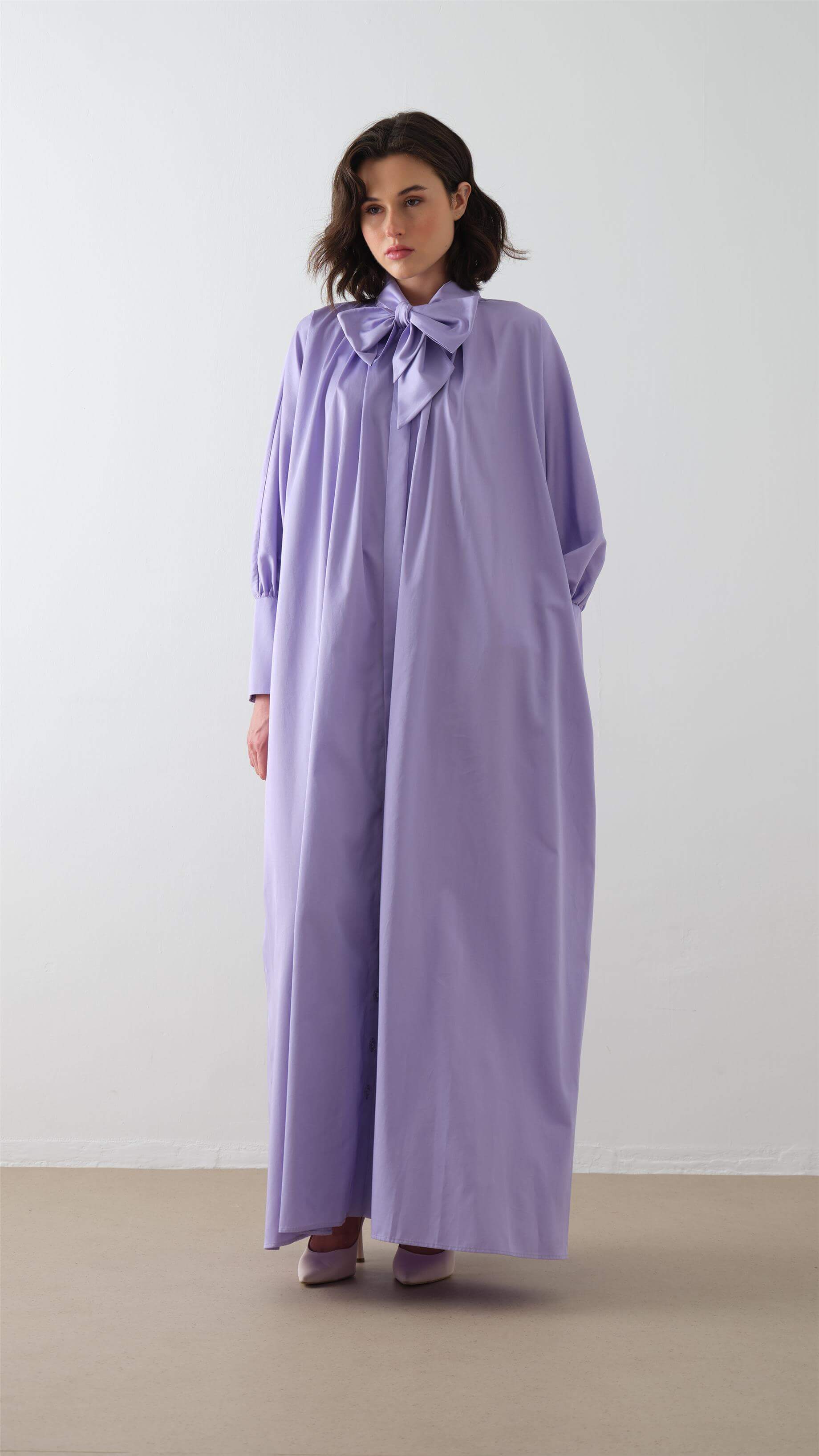 Fit: Relaxed shirt-dress silhouette with bow-tie neckline and long balloon sleeves. Designed for comfort and ease.