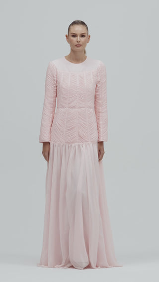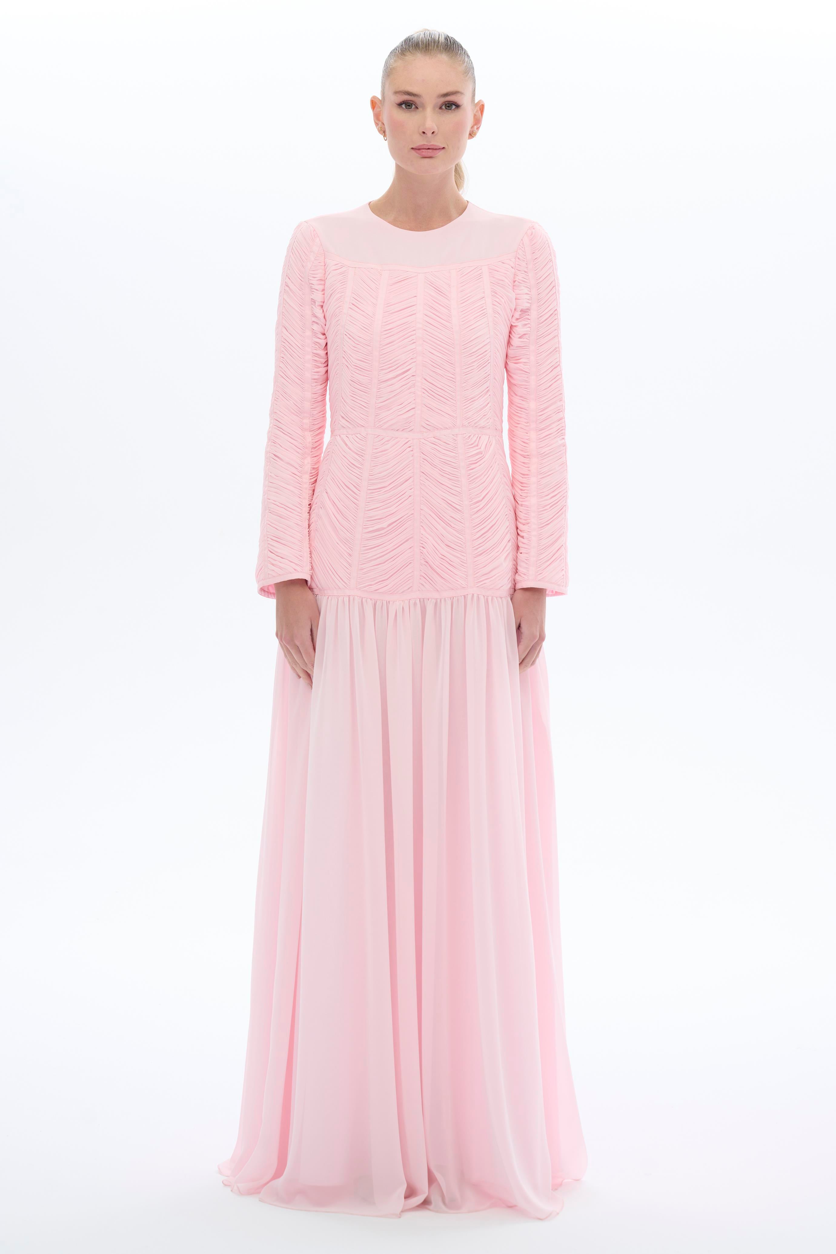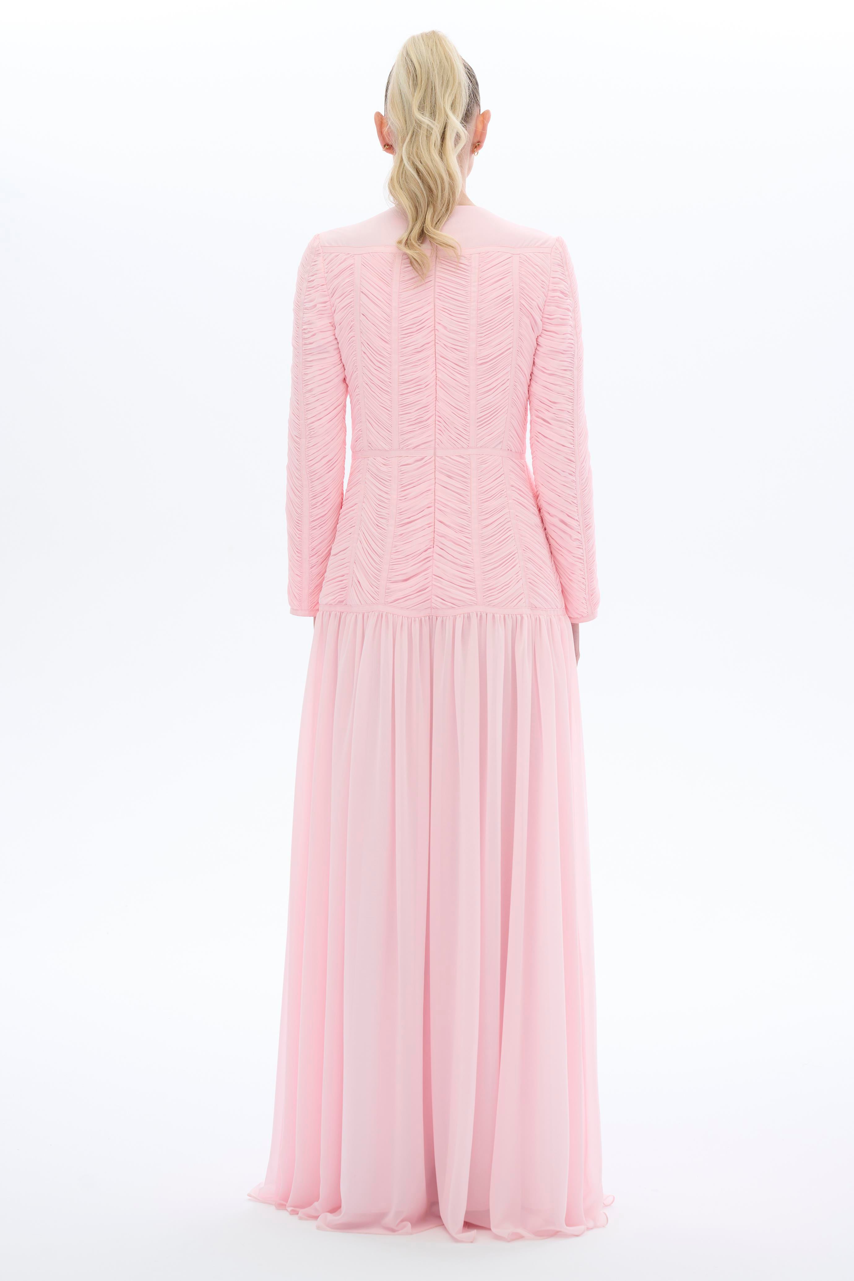 A graceful chiffon maxi dress with a ruched bodice and round neckline. The gathered detailing adds texture and elegance, while the flowing skirt creates light, effortless movement. Crafted for refined occasions, this piece balances comfort with sophistication.