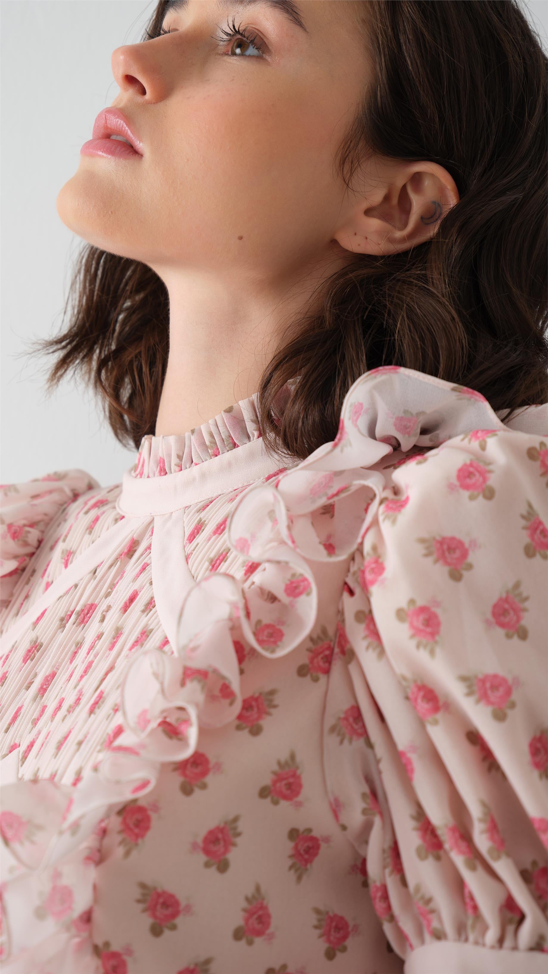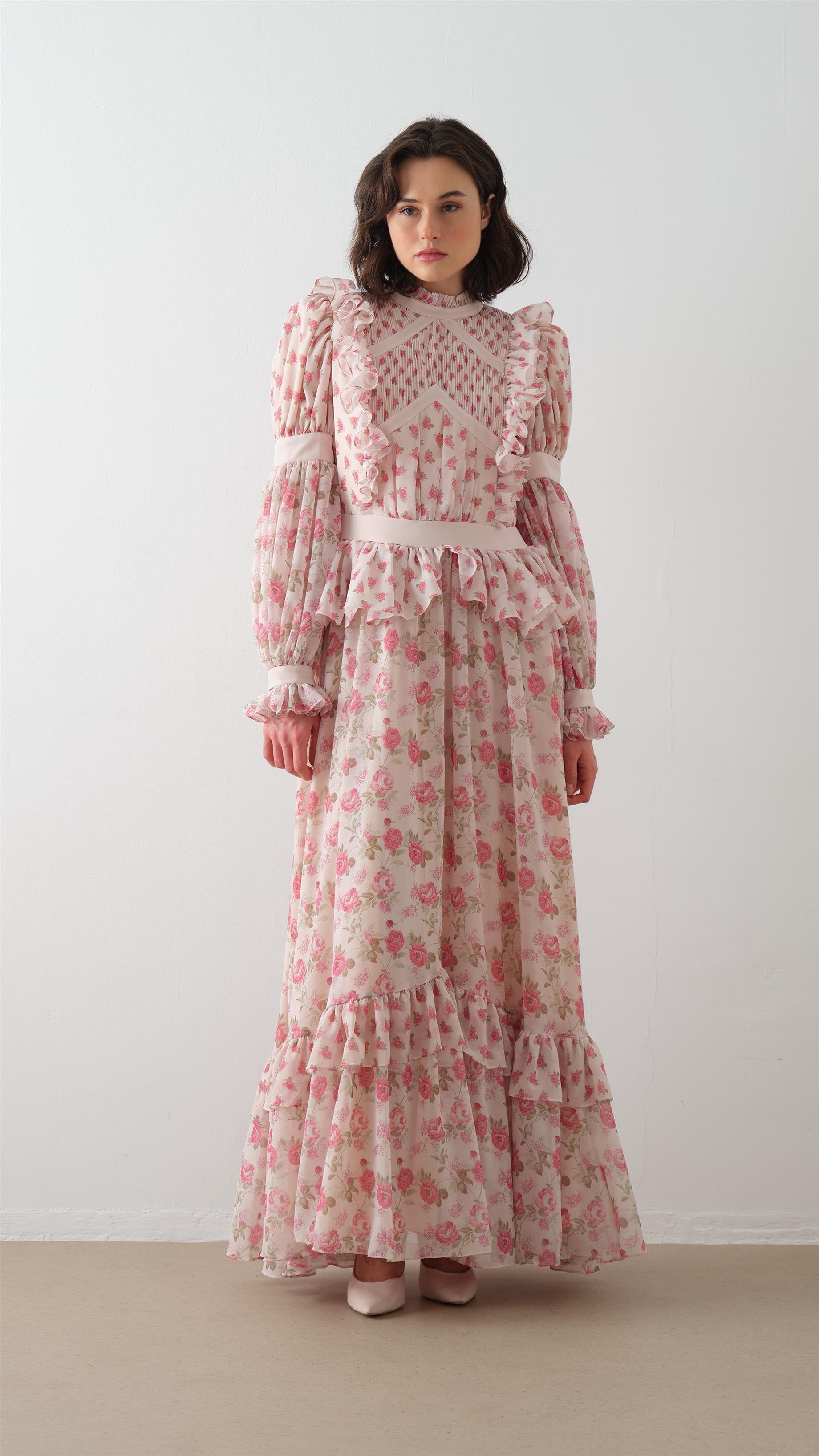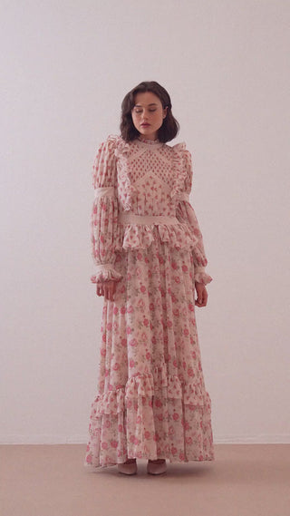 This maxi dress blends vintage-inspired romance with modern femininity. The paneled bodice features delicate stripe pleating, complemented by voluminous balloon sleeves finished with ruffled cuffs. A gathered ruffle accent at the waist creates soft structure, while the flowing skirt cascades into a tiered hemline with playful movement. Crafted from lightweight polyester with an all-over floral motif, it offers effortless elegance for both daytime gatherings and evening occasions.