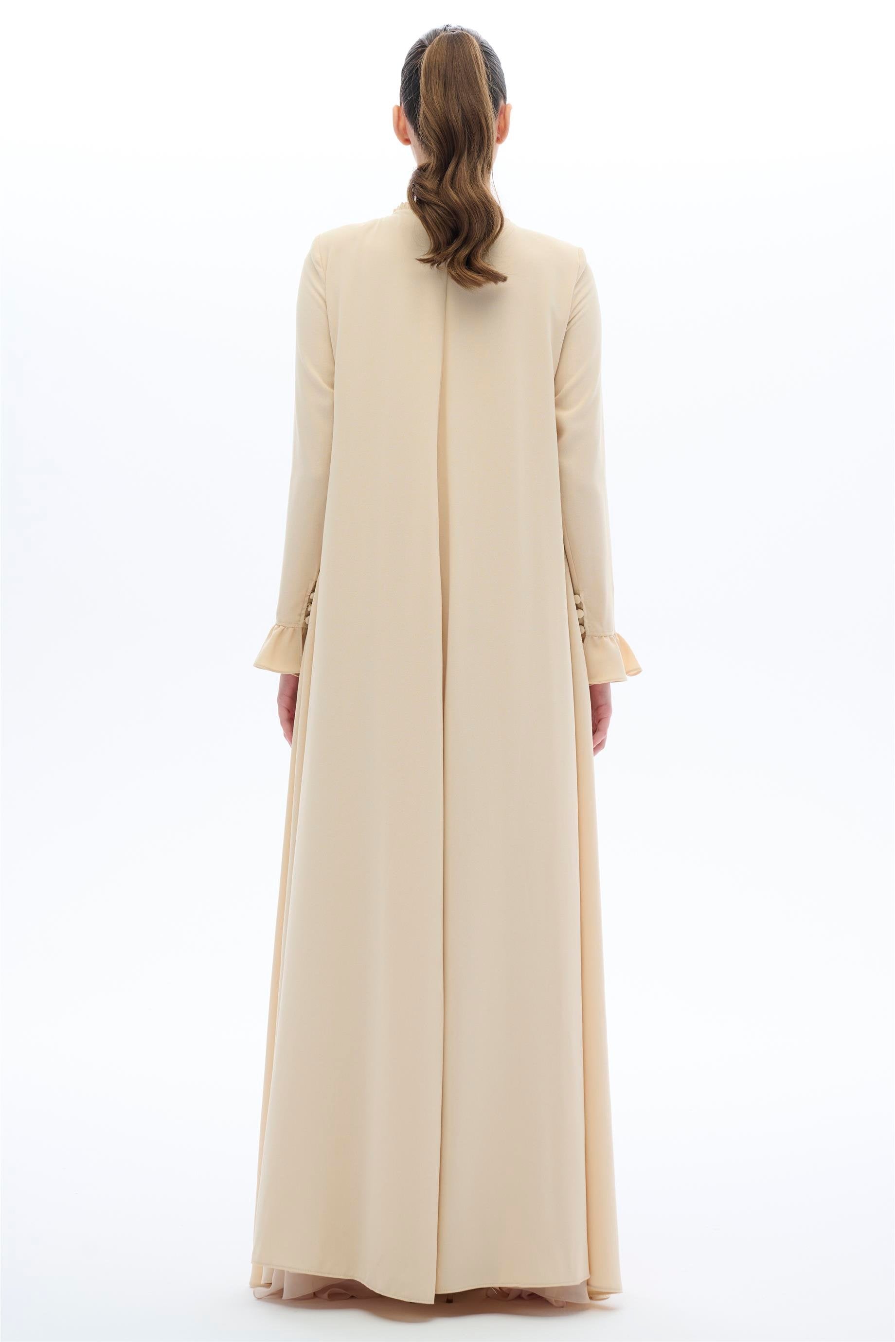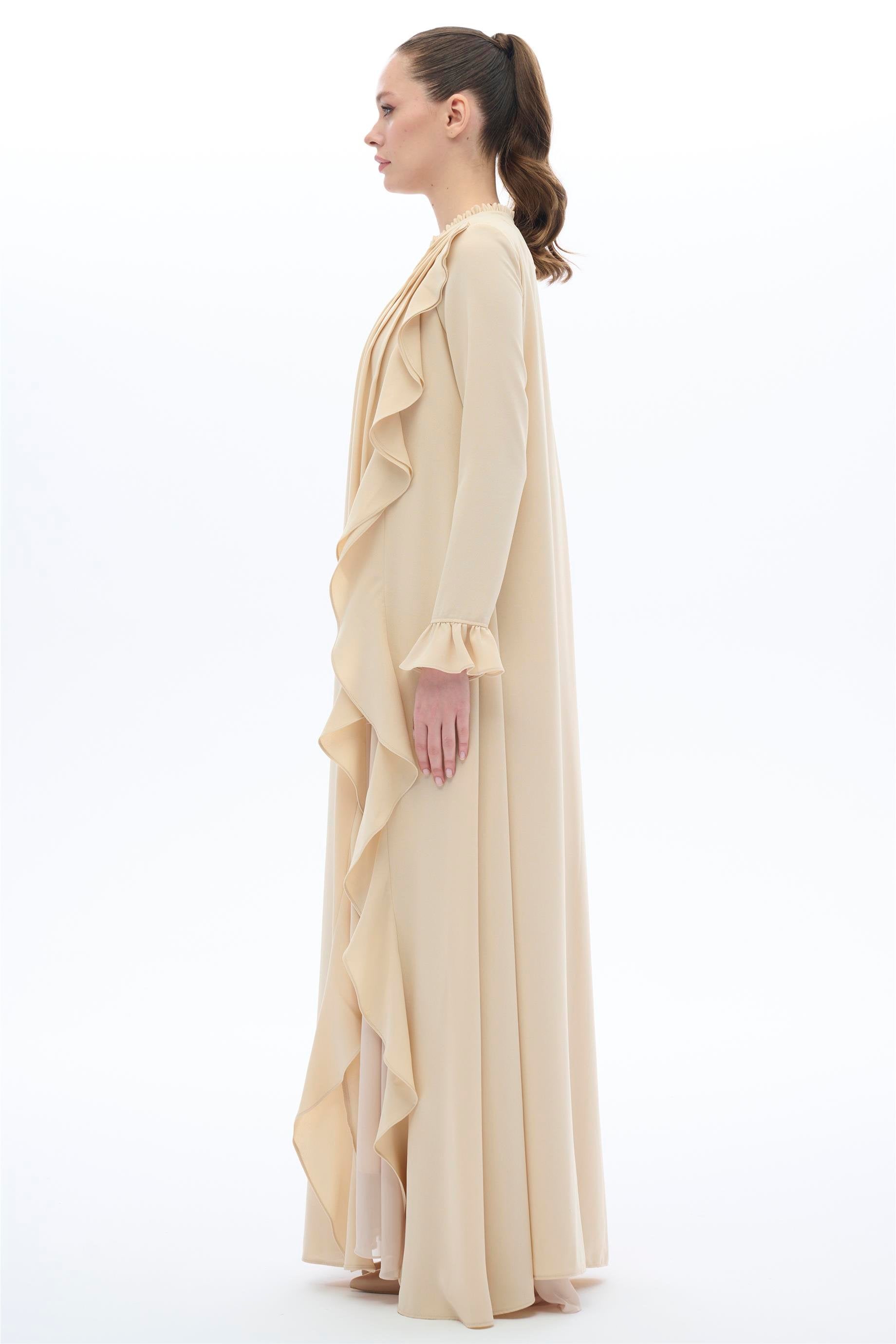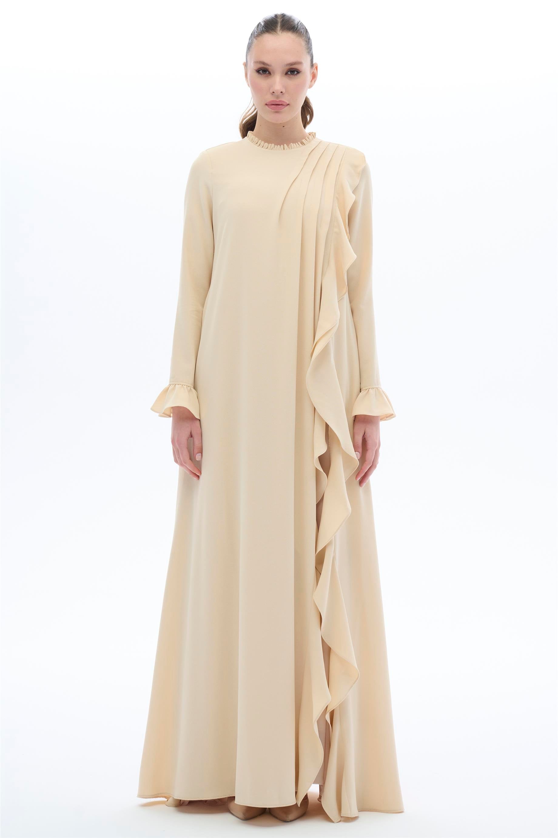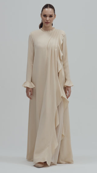 A sophisticated maxi dress defined by its cascading ruffle panel that flows diagonally from the shoulder to the hem. The high neckline with subtle gathers and softly flared cuffs add refined detail, while the fluid silhouette ensures graceful movement.