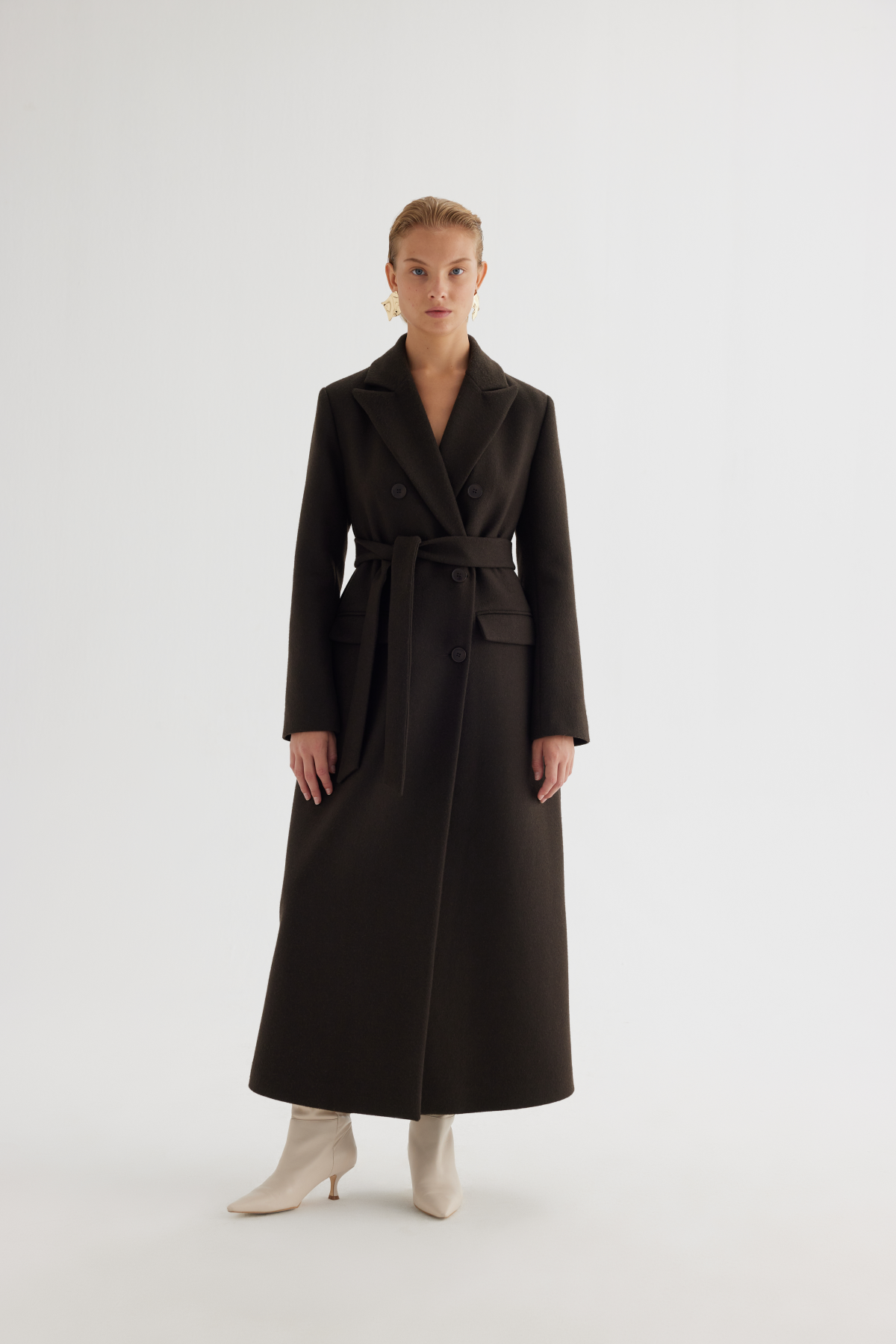 A timeless expression of tailored sophistication, this long coat combines classic craftsmanship with modern structure. Crafted from a rich wool blend, it features a double-breasted front with tonal buttons, a notched lapel collar, and a detachable belt that cinches the waist for a refined silhouette. Fully lined for comfort and structure, this piece elevates cold-weather dressing with quiet luxury and enduring style.
