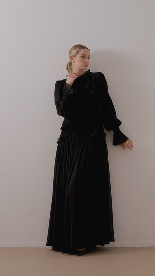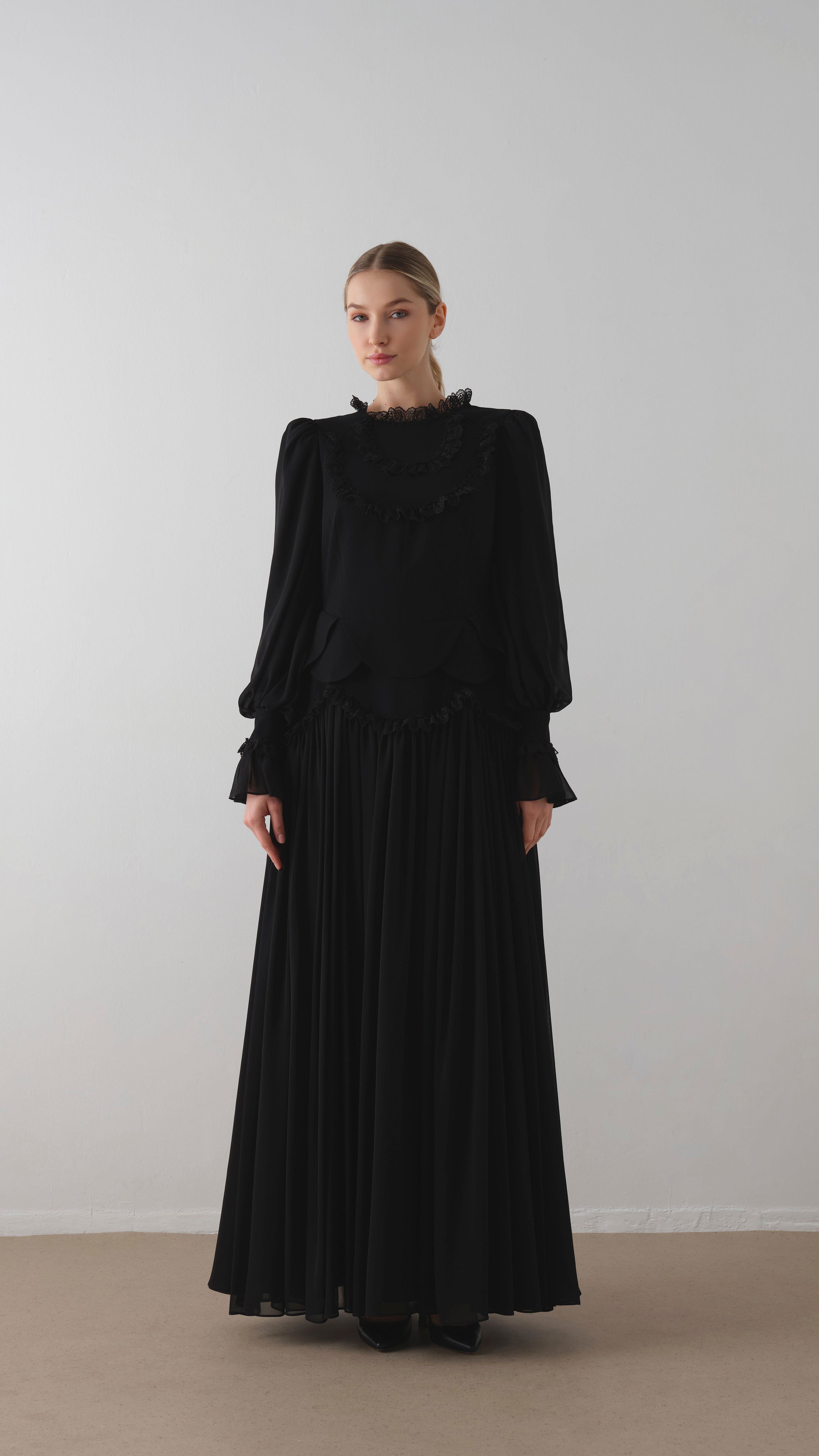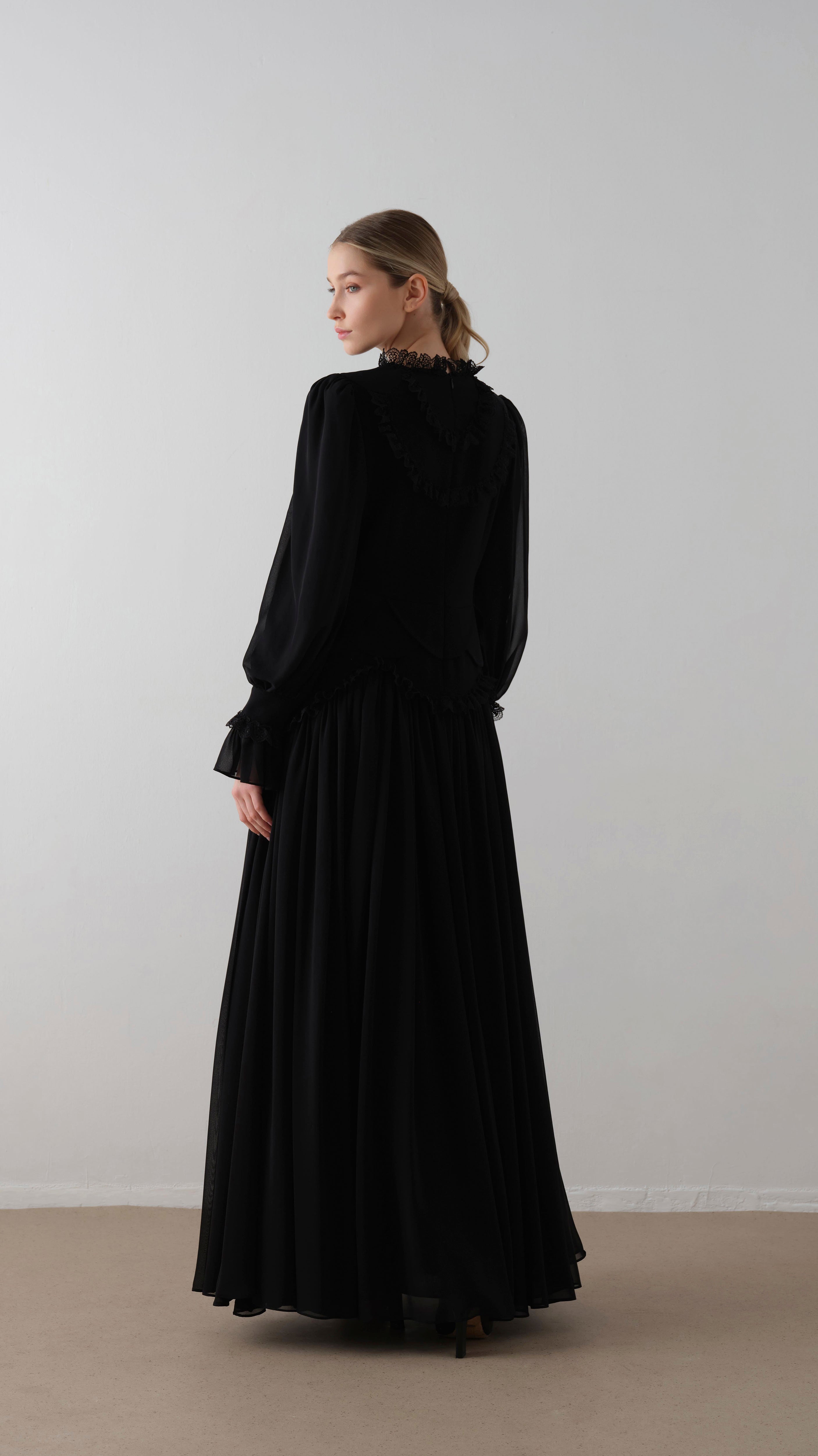 Lace-Trimmed Layered Crepe Dress – Black