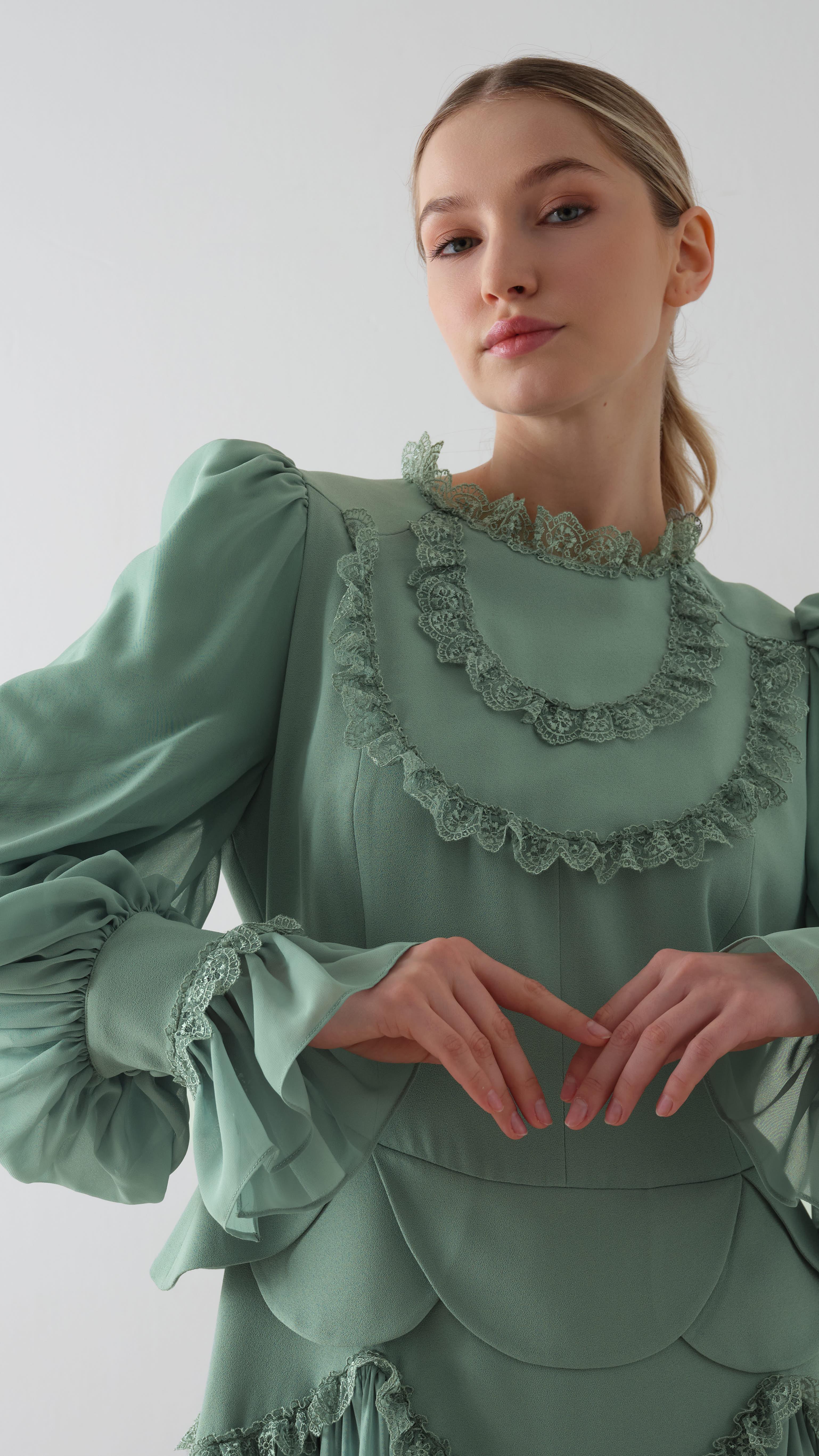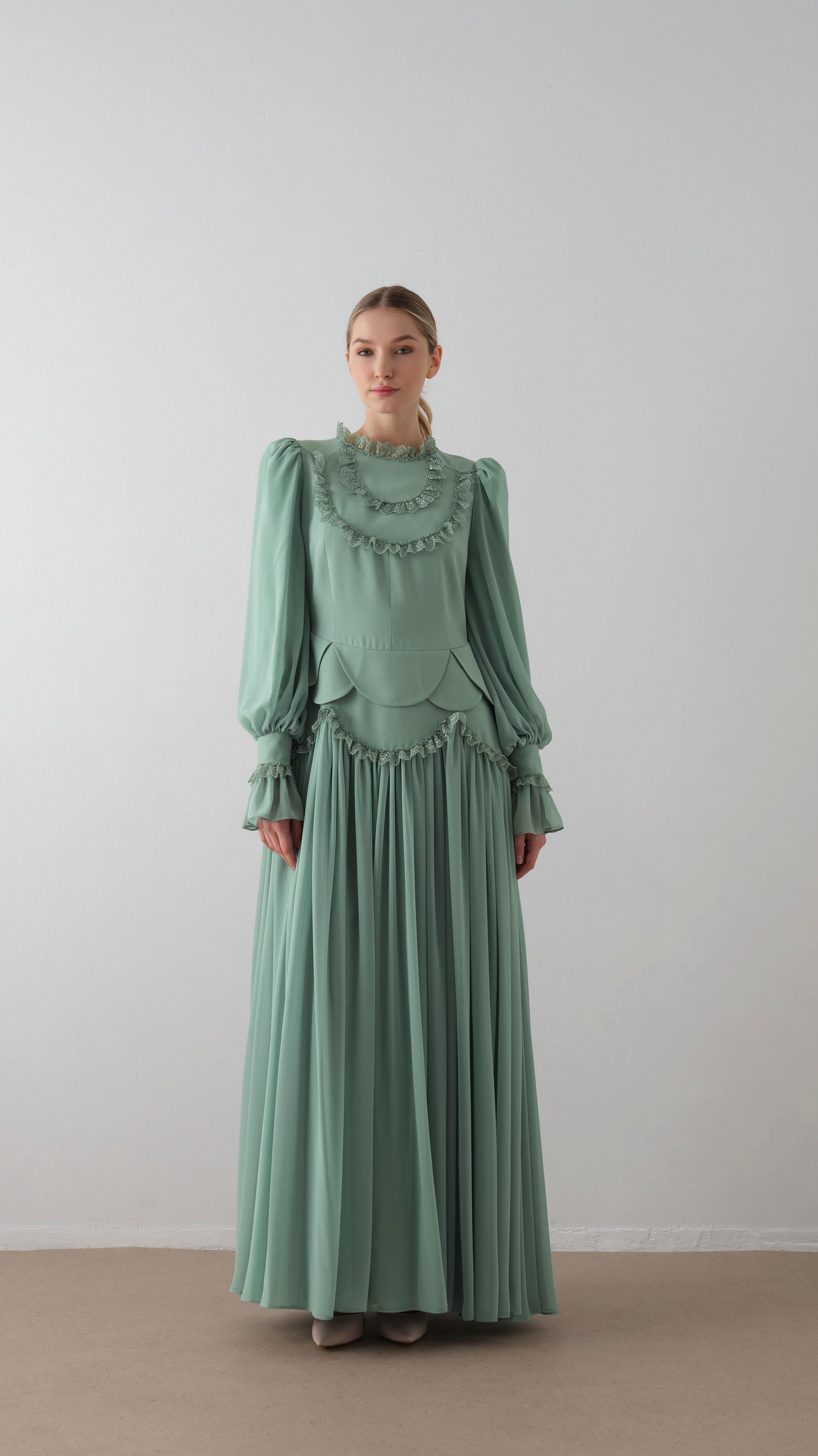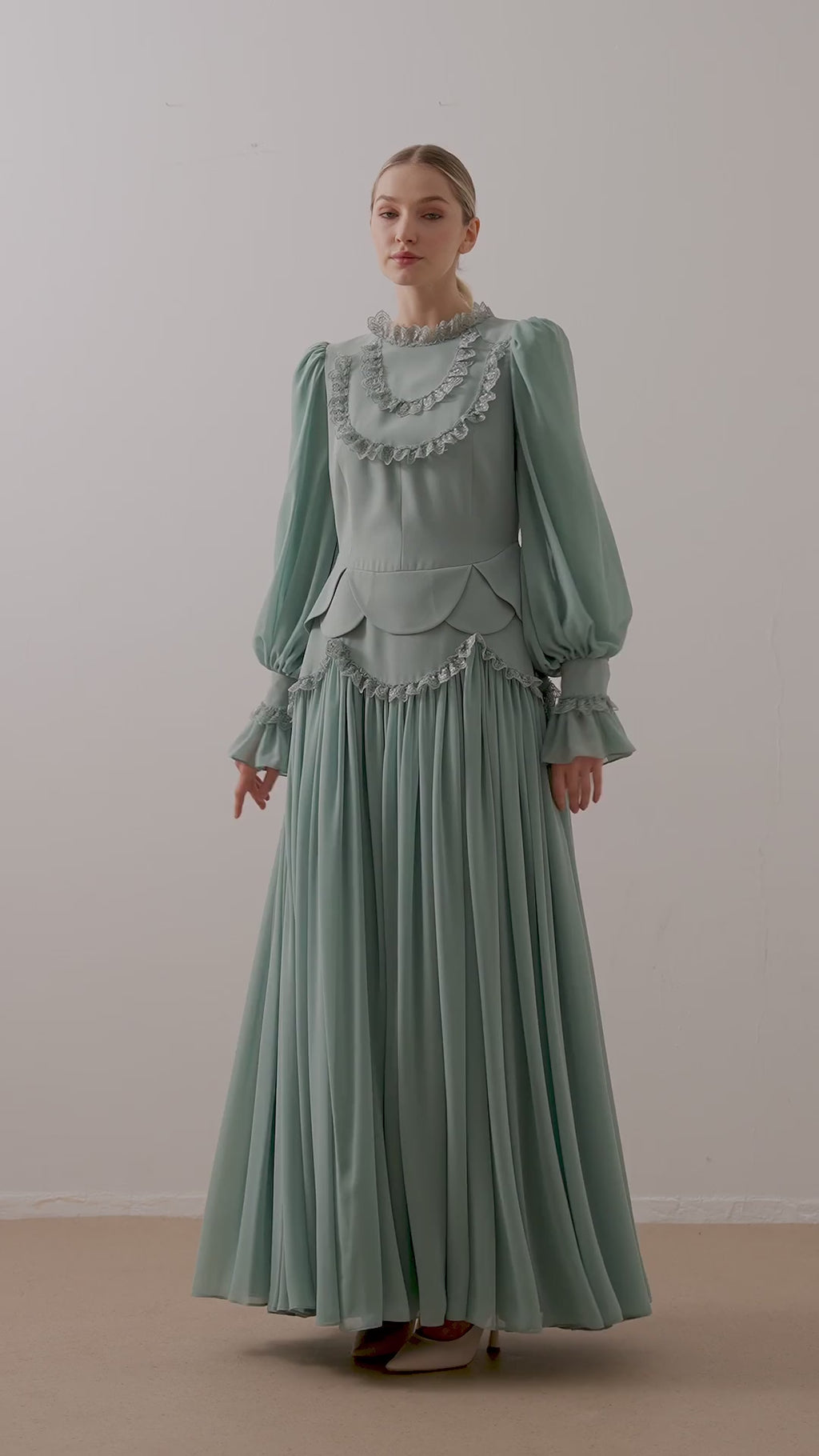 A romantic and graceful design that captures timeless femininity. This mint green maxi dress features a fitted crepe bodice with layered detailing at the waist and cuffs, accented by delicate lace trims. The chiffon skirt flows elegantly with every movement, offering a soft and ethereal look perfect for formal occasions or evening gatherings.