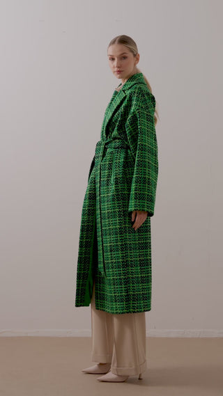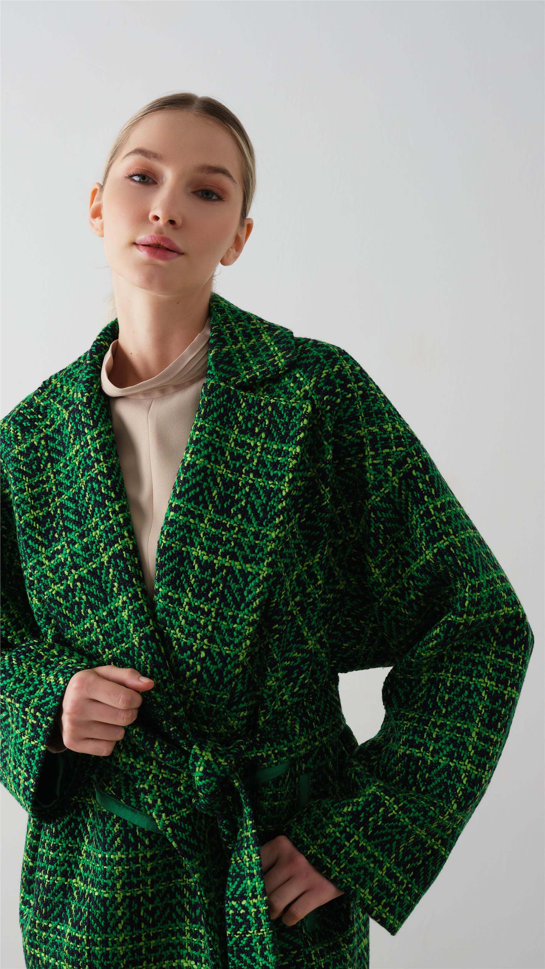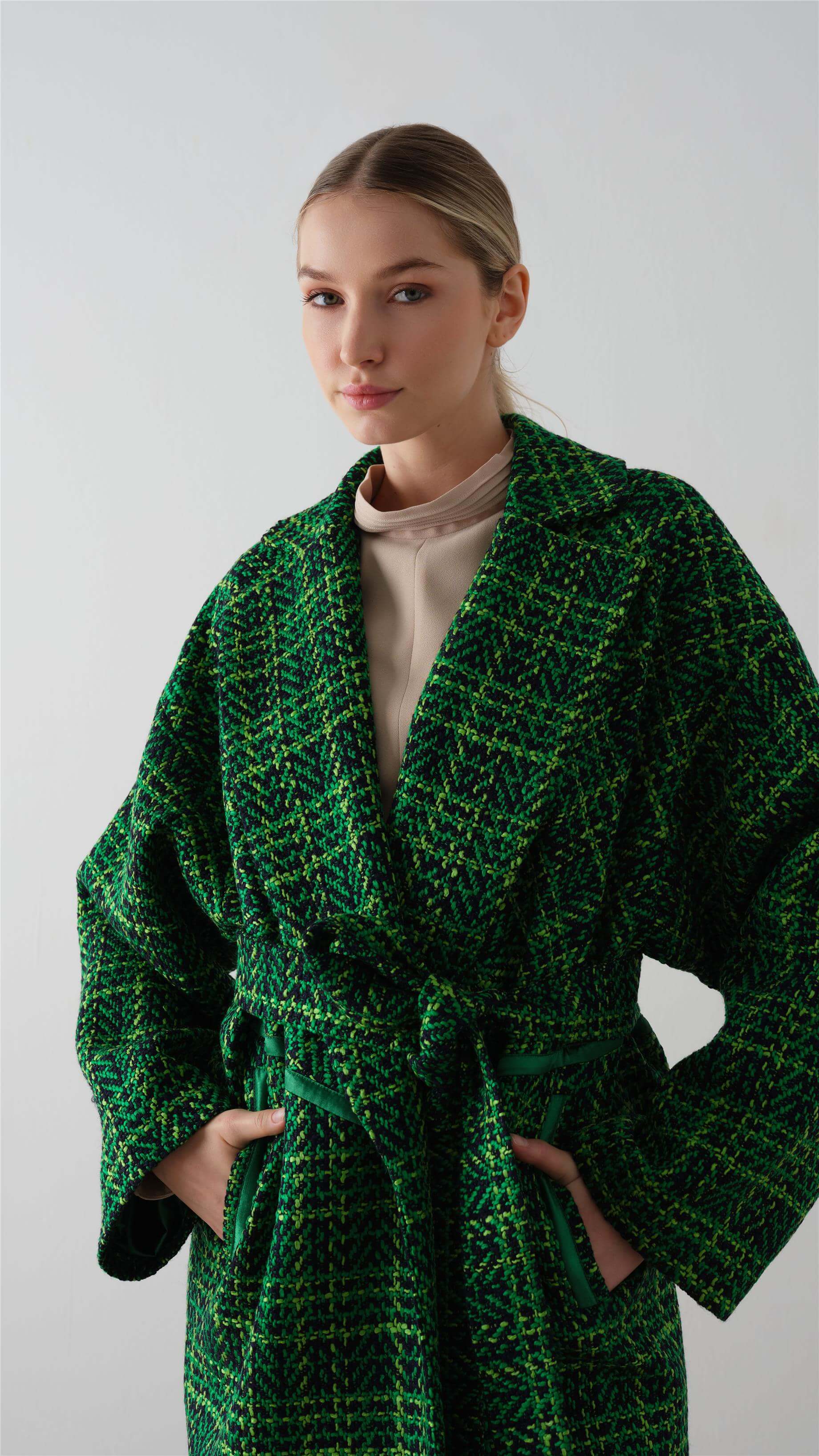 Effortlessly chic and tailored for the modern modest wardrobe, this oversized checkered wool coat features a notched lapel collar, belt tie, and dropped shoulders for a relaxed yet structured silhouette. The textured weave in rich green tones adds depth and warmth, making it a standout piece for fall and winter layering.