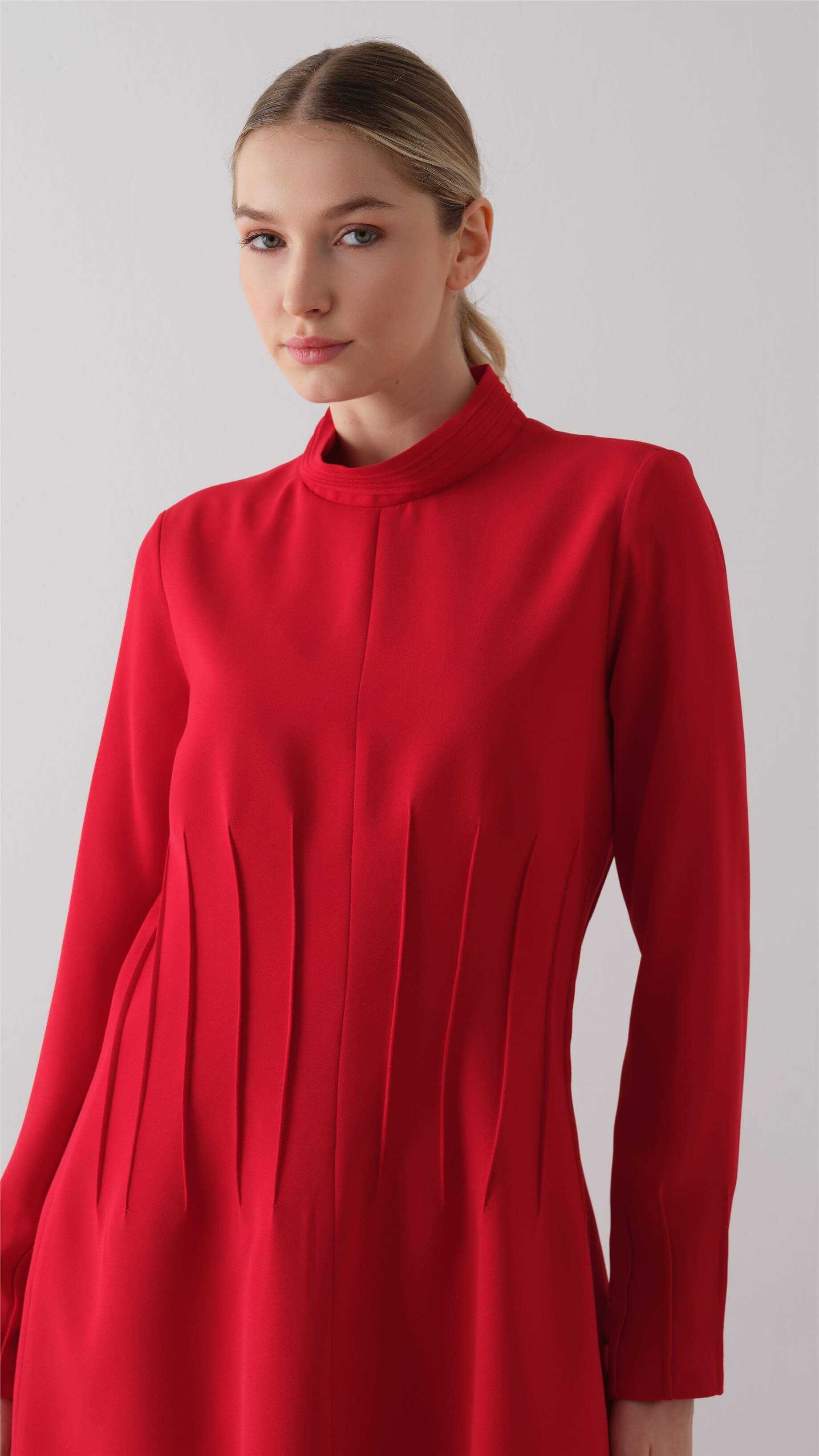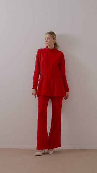 A refined and modern co-ord set designed for sophisticated everyday elegance. The top features a high neckline and delicate vertical pleat details for a sculpted silhouette, paired with wide-leg crepe trousers that elongate the frame. Perfect for polished daywear or understated evening styling.