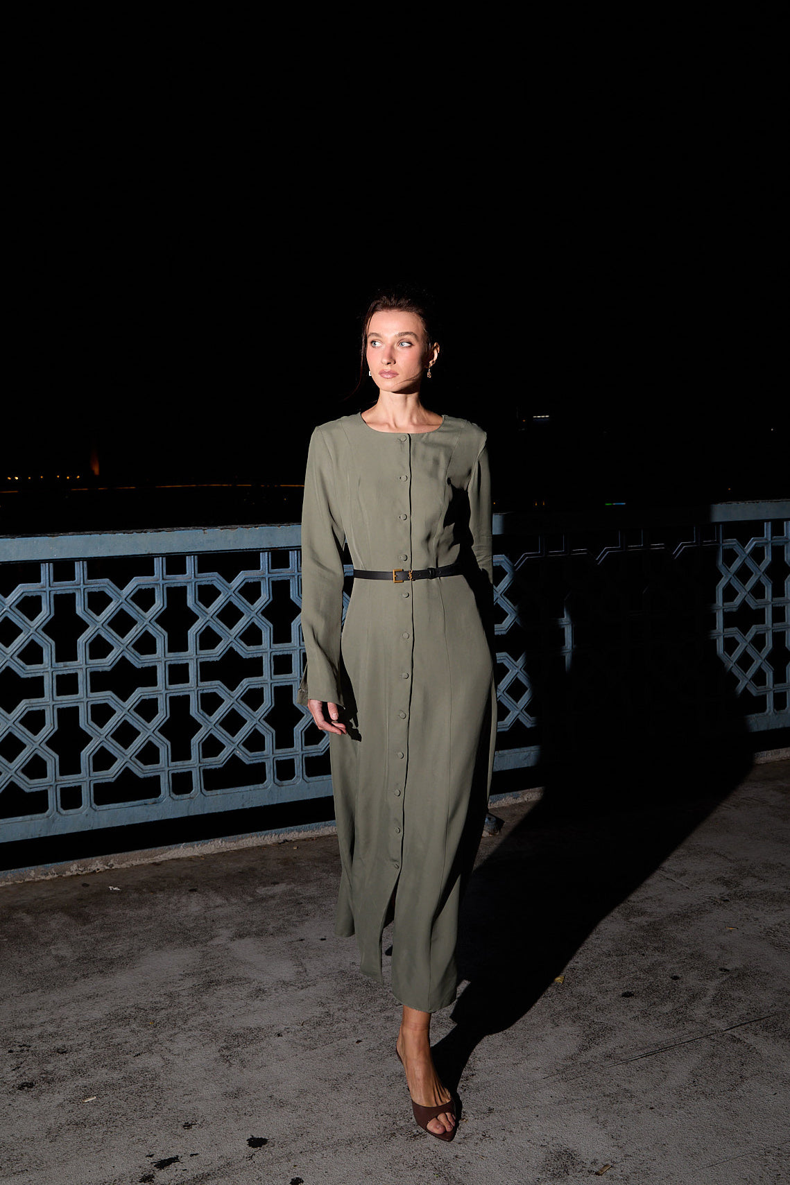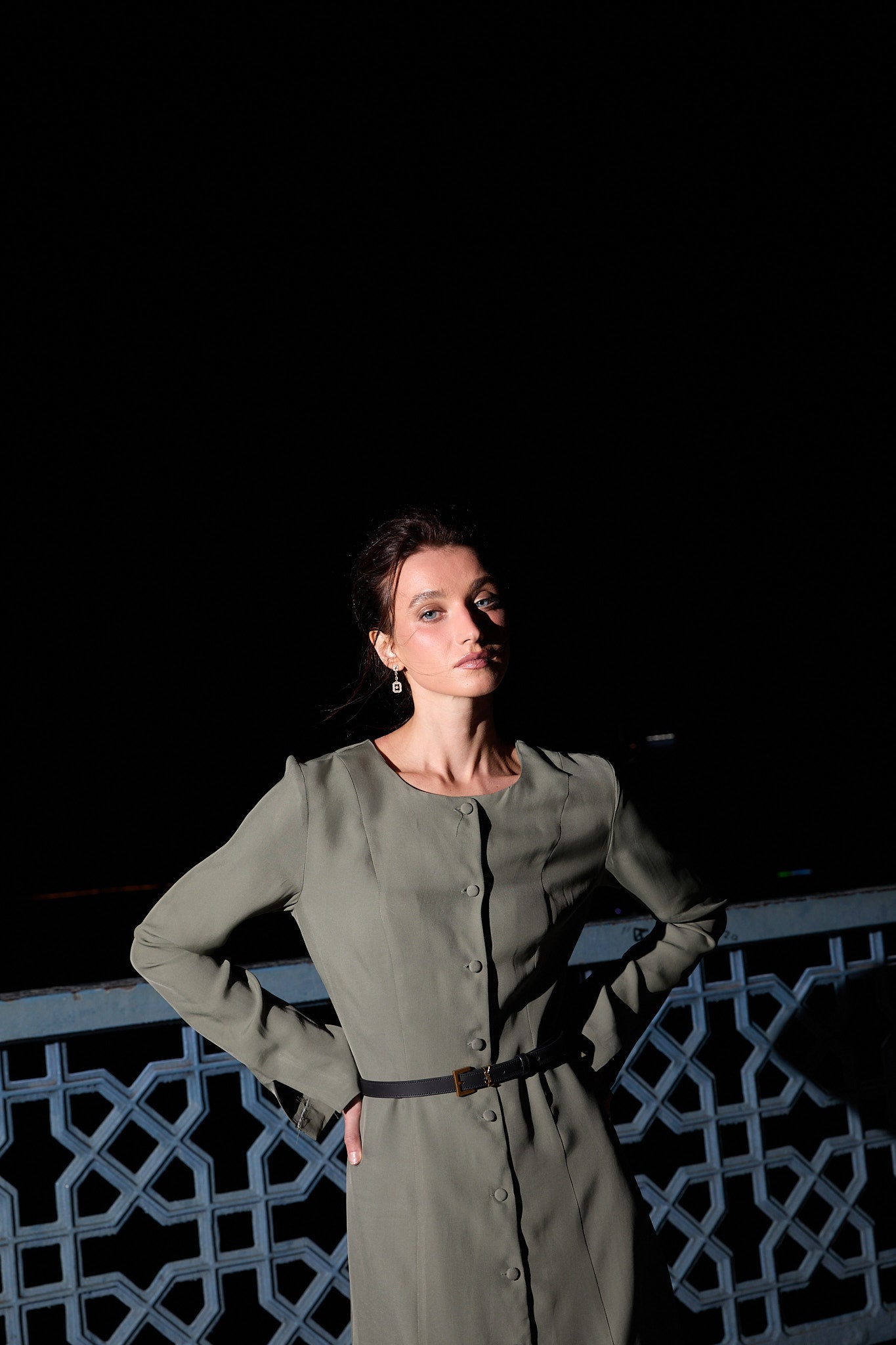 Effortlessly refined, the Tencel Button-Front Long Dress embodies understated elegance with its fluid drape and tailored silhouette. Designed with a fitted waist and front-button detailing, it ensures full coverage without transparency. Long sleeves with slit cuffs and panel seams enhance its sculpted shape, making it ideal for both daytime sophistication and evening grace.