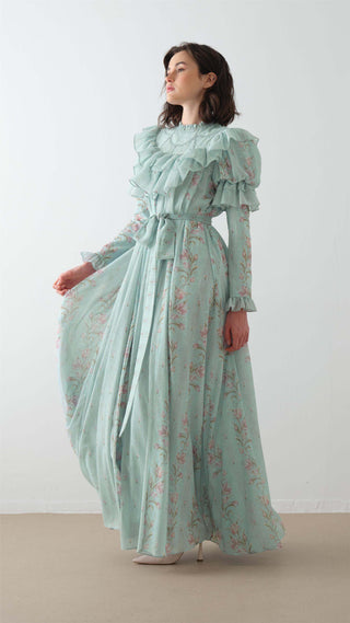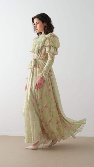 Floral Ruffled Puff-Sleeve Maxi Dress – Light Green