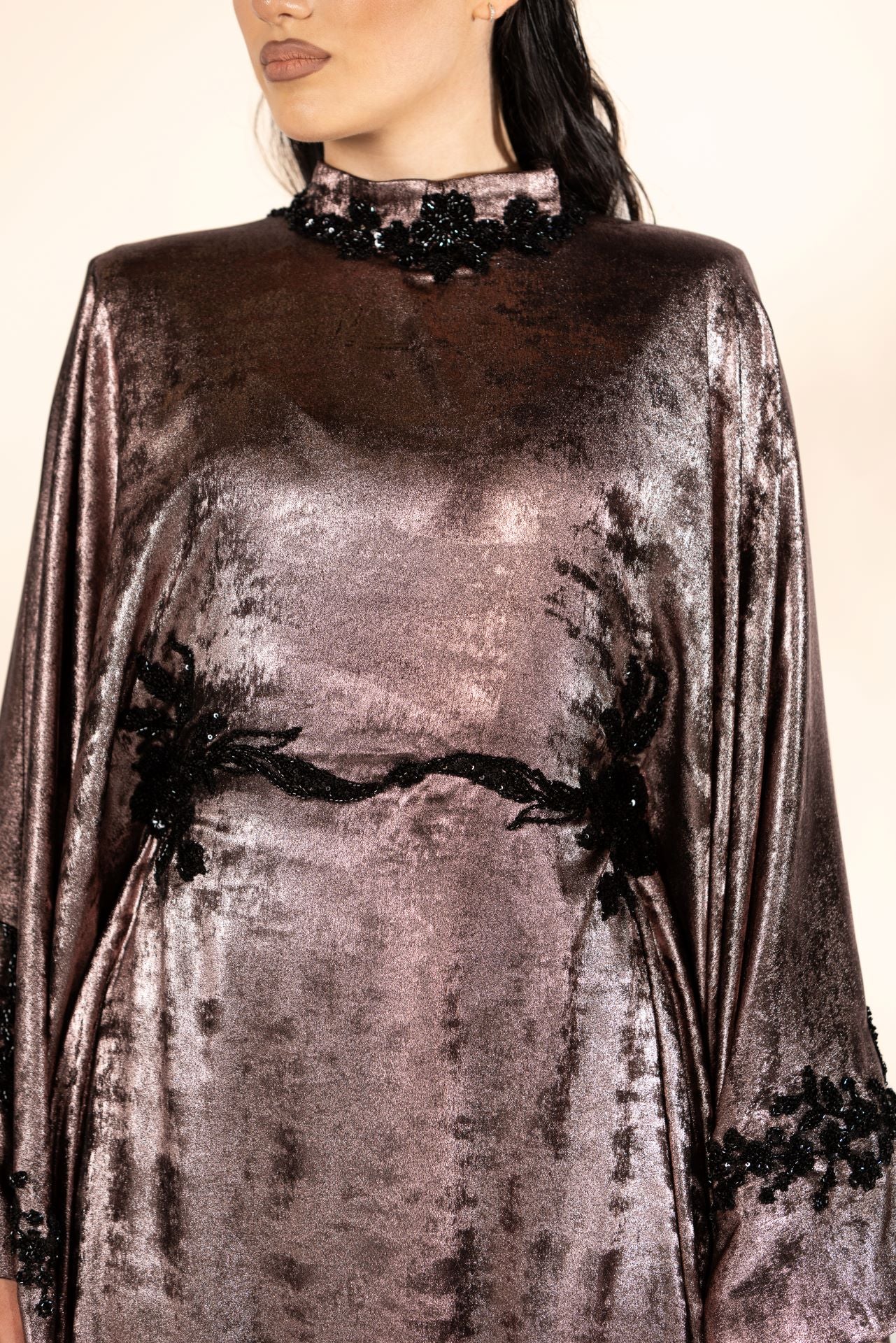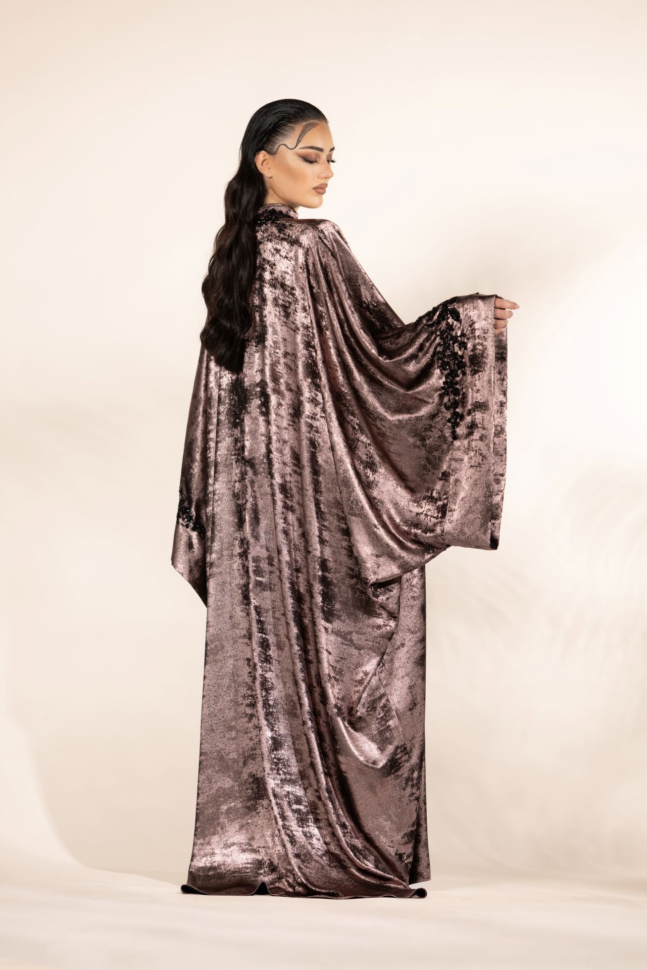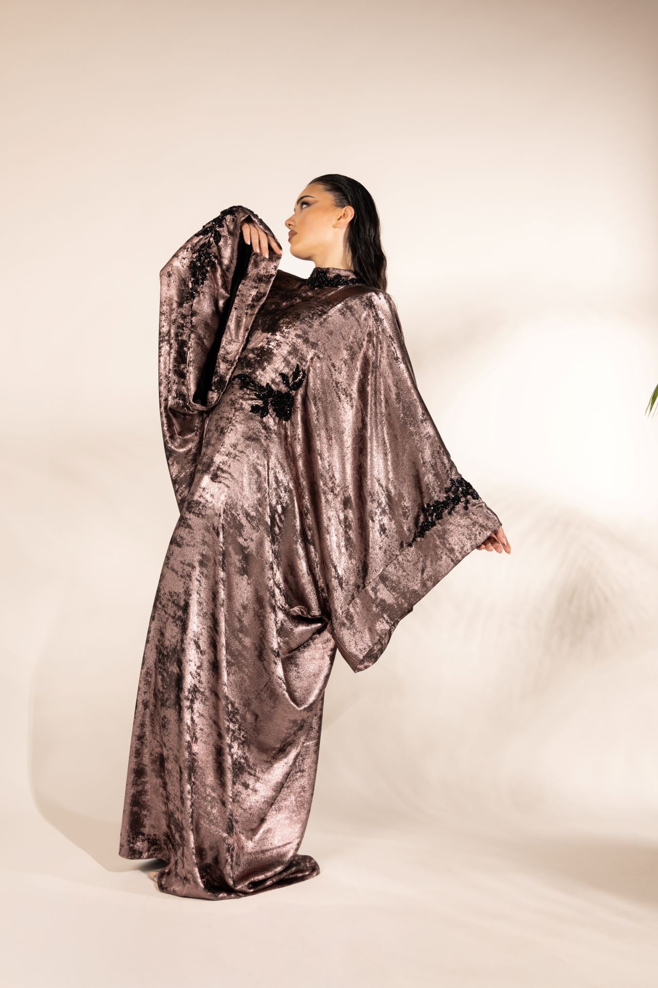 A luminous evening abaya defined by its fluid drape and sculptural silhouette. Crafted from softly shimmering satin, this piece reflects light with every movement, while refined hand embroidery adds depth and quiet drama. The wide, flowing sleeves and elongated form create a powerful yet elegant presence, making this abaya ideal for formal occasions and special evenings where sophistication speaks louder than excess.