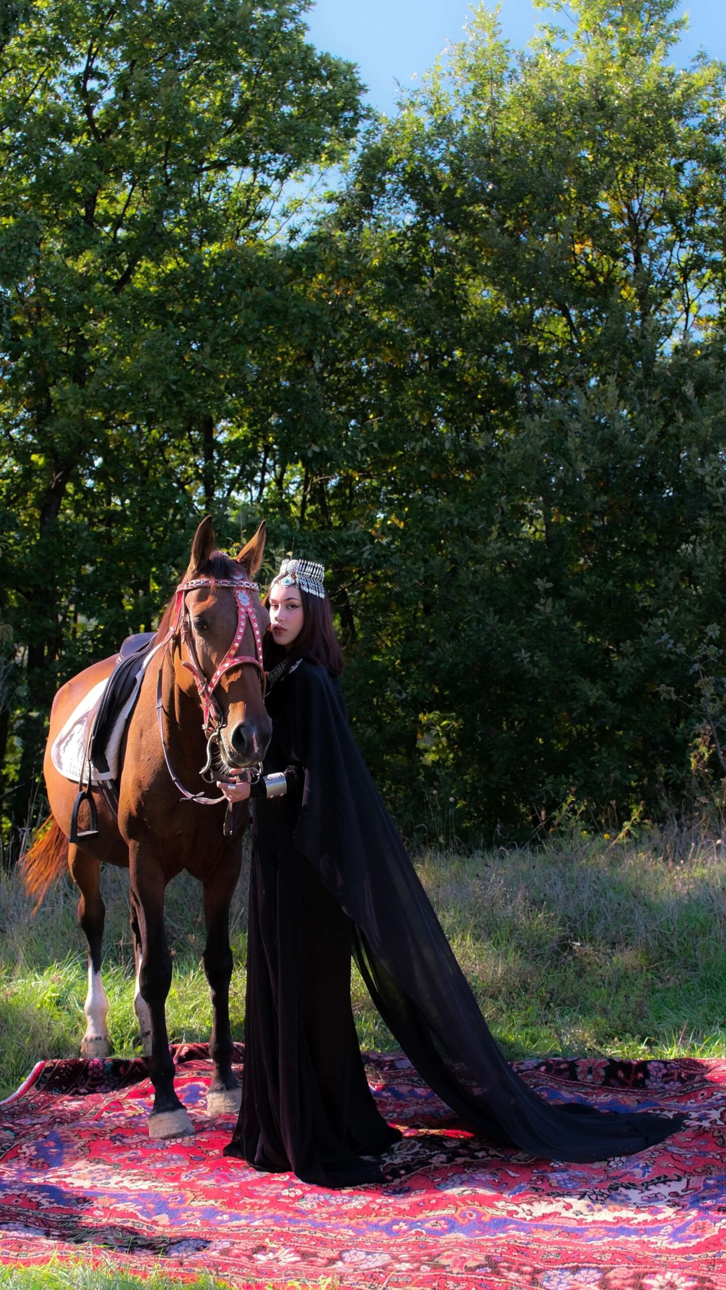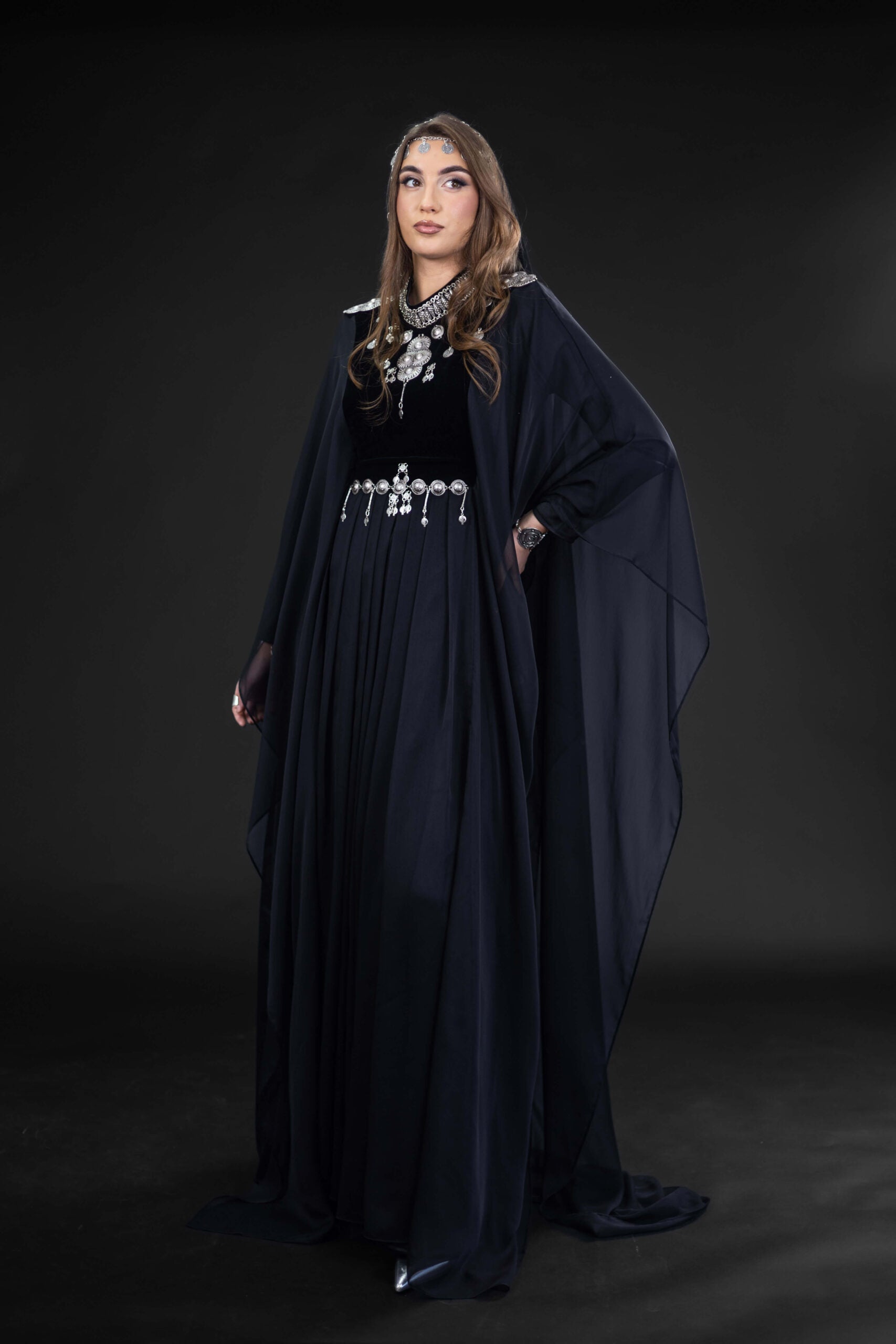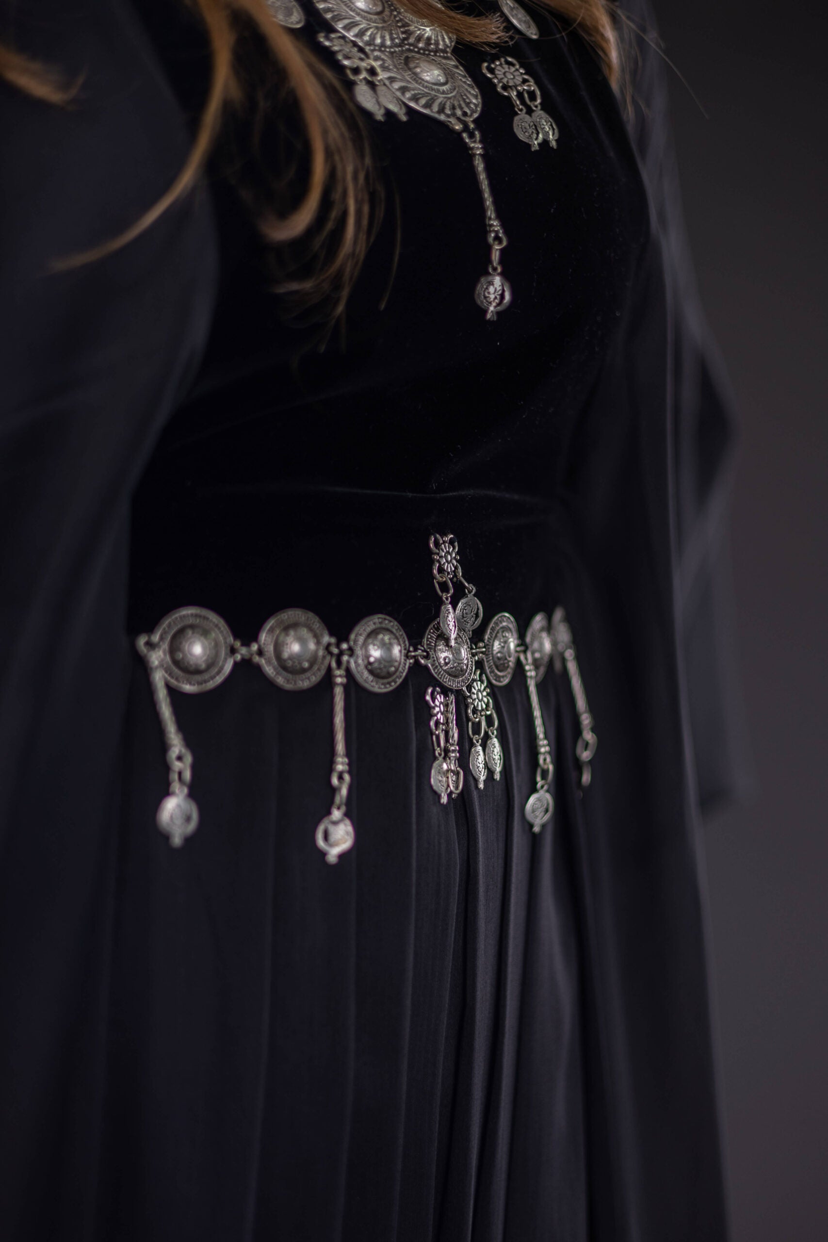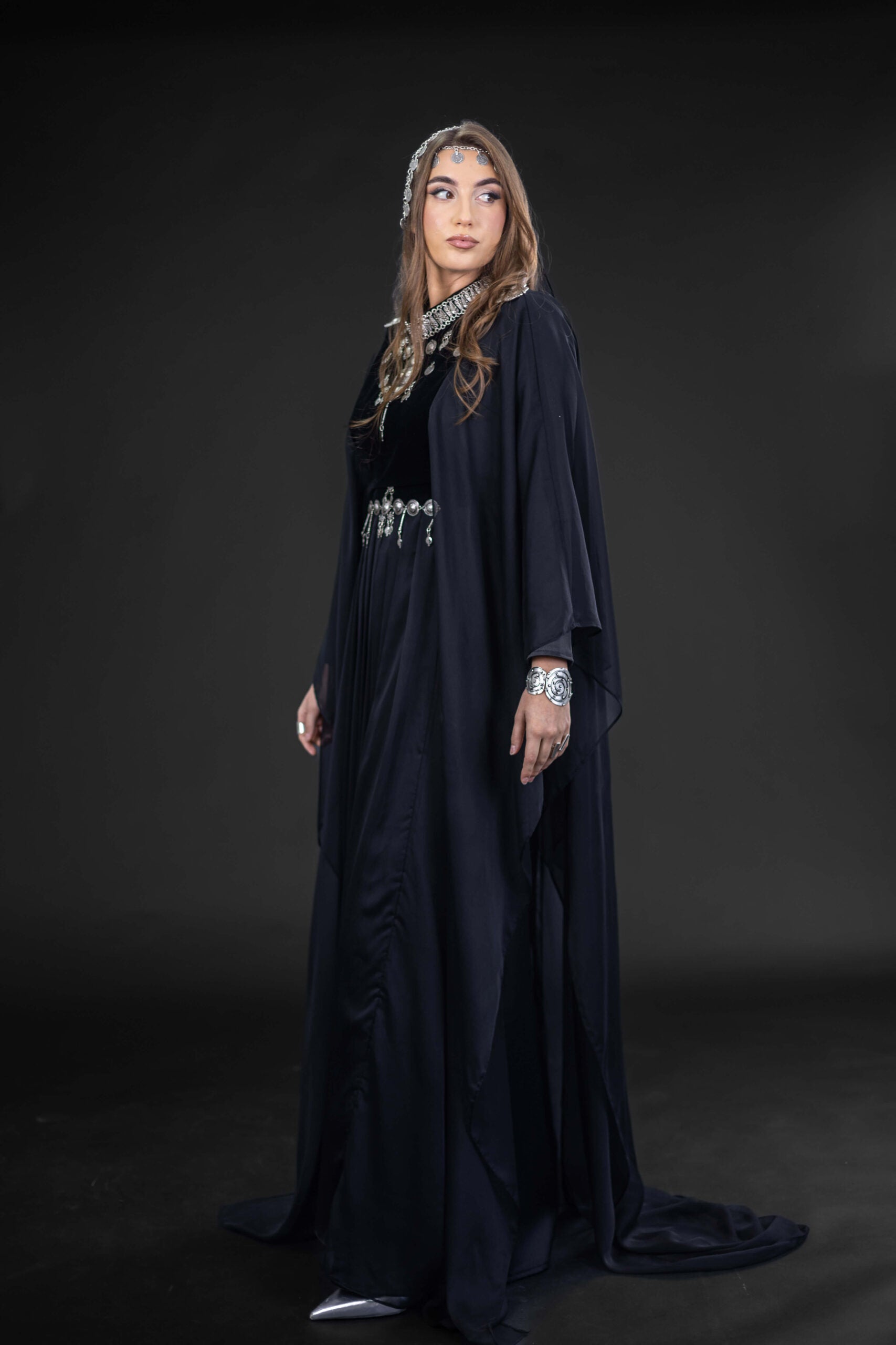 A powerful statement piece inspired by historical heroines and timeless strength. This abaya merges dramatic elegance with symbolic detailing, featuring fluid chiffon layers contrasted by rich velvet accents and distinctive coin embellishments that move with purpose. Designed for the modern woman who embodies courage and presence, it balances heritage aesthetics with contemporary refinement, making it ideal for ceremonial occasions, cultural events, and evening statements.