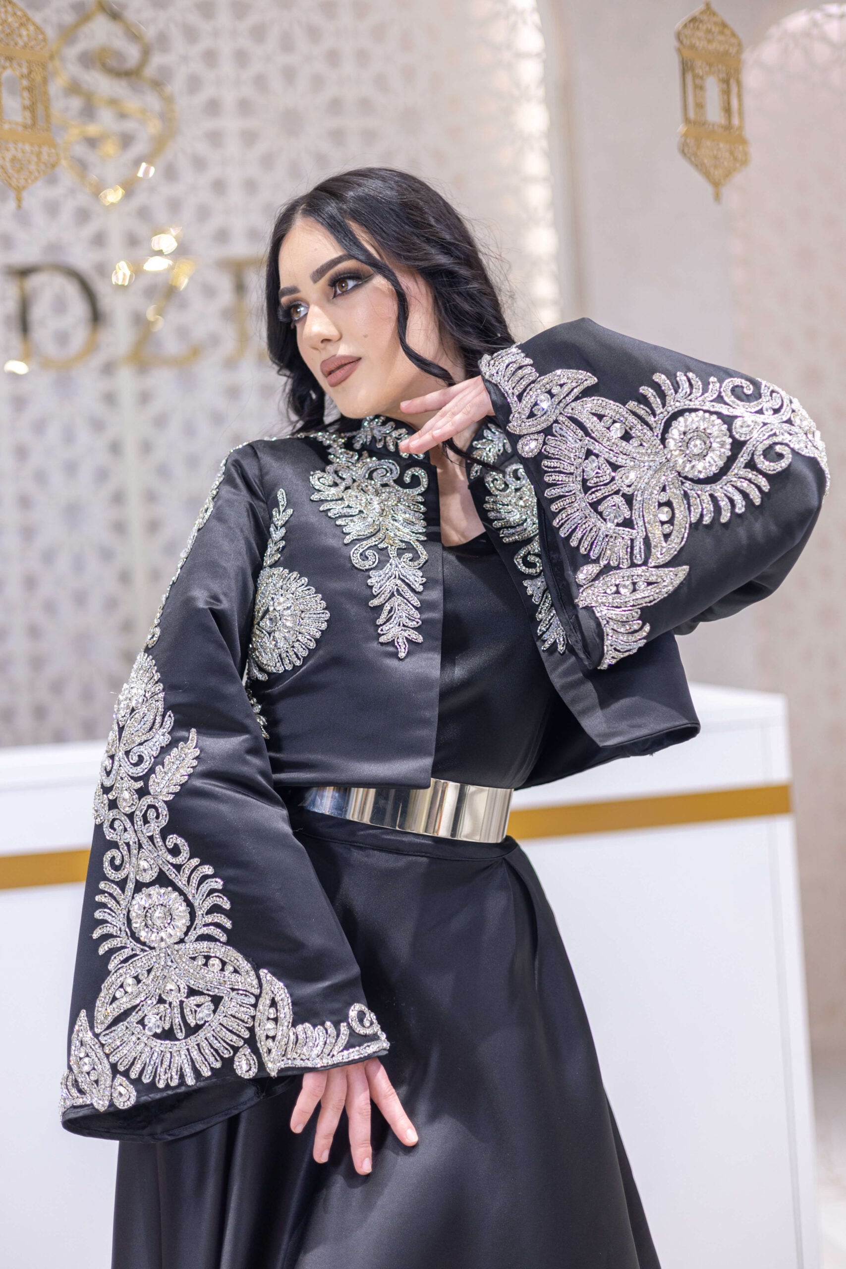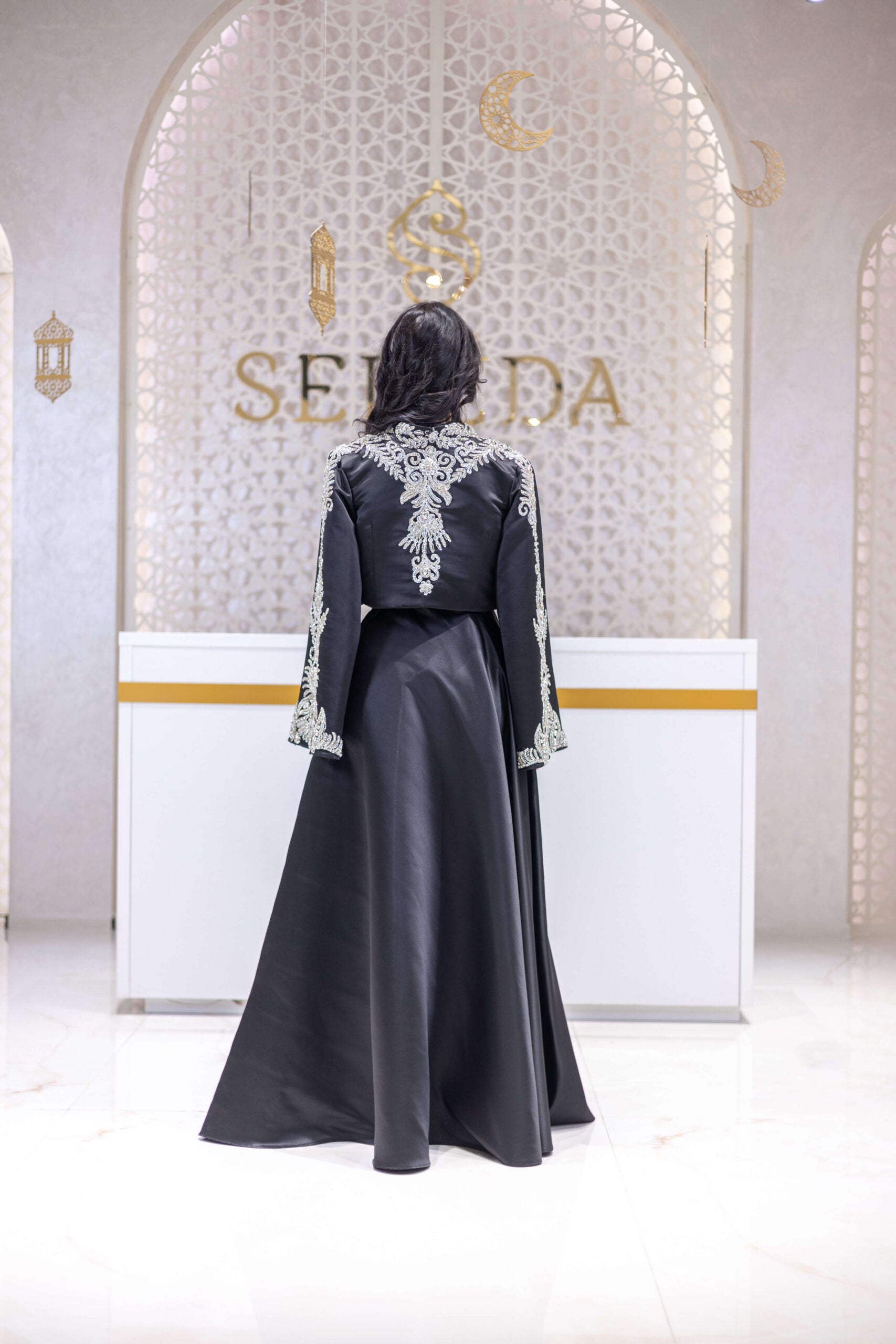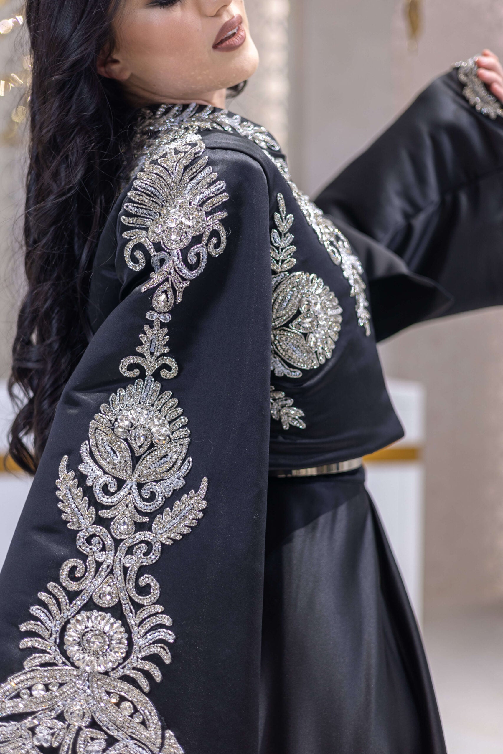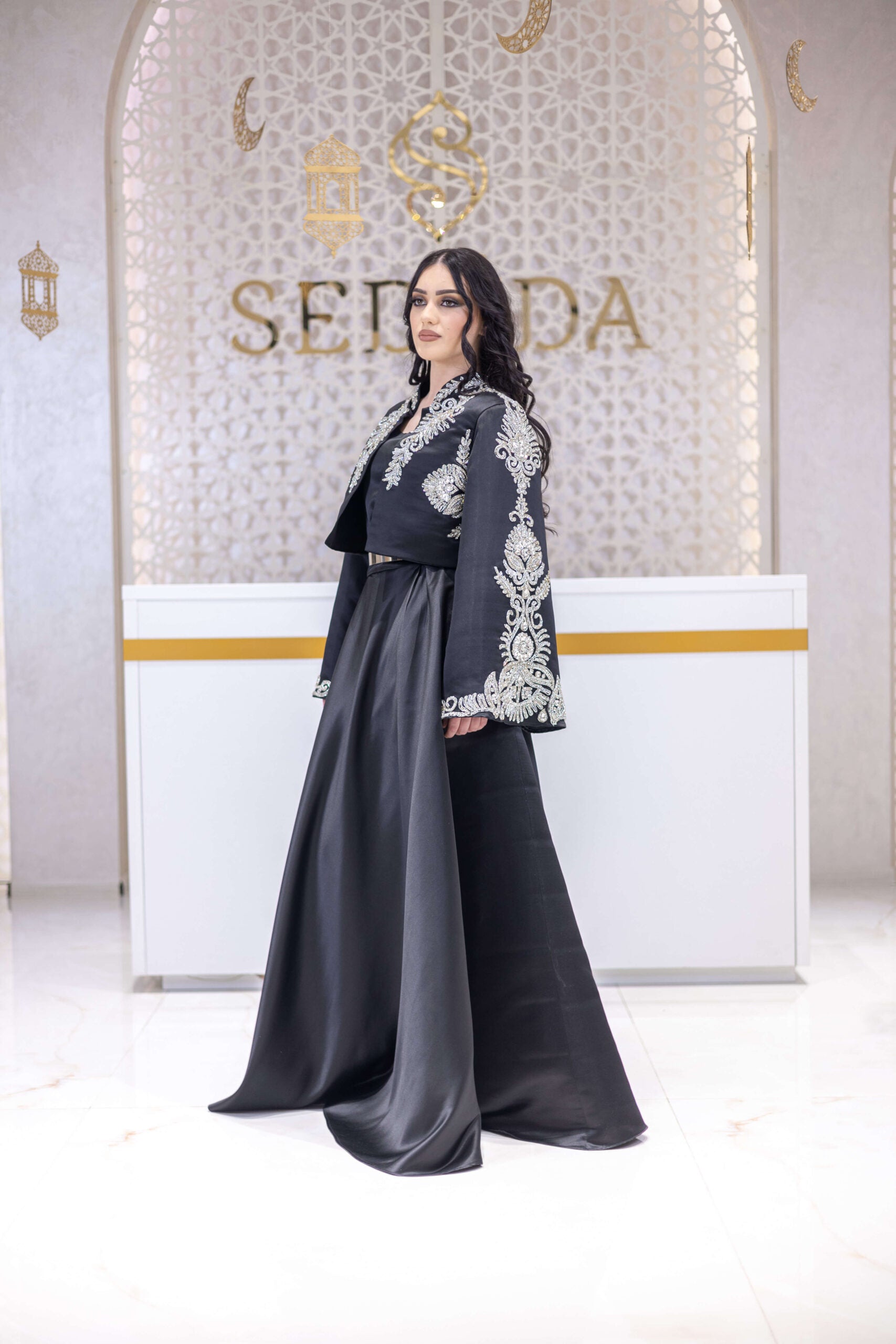 An elegant two-piece satin set designed for formal occasions and refined evenings. The structured vest is richly embellished with intricate crystal embroidery, while the flowing maxi skirt creates a graceful, elongated silhouette. A timeless statement piece that balances strength, elegance, and femininity.