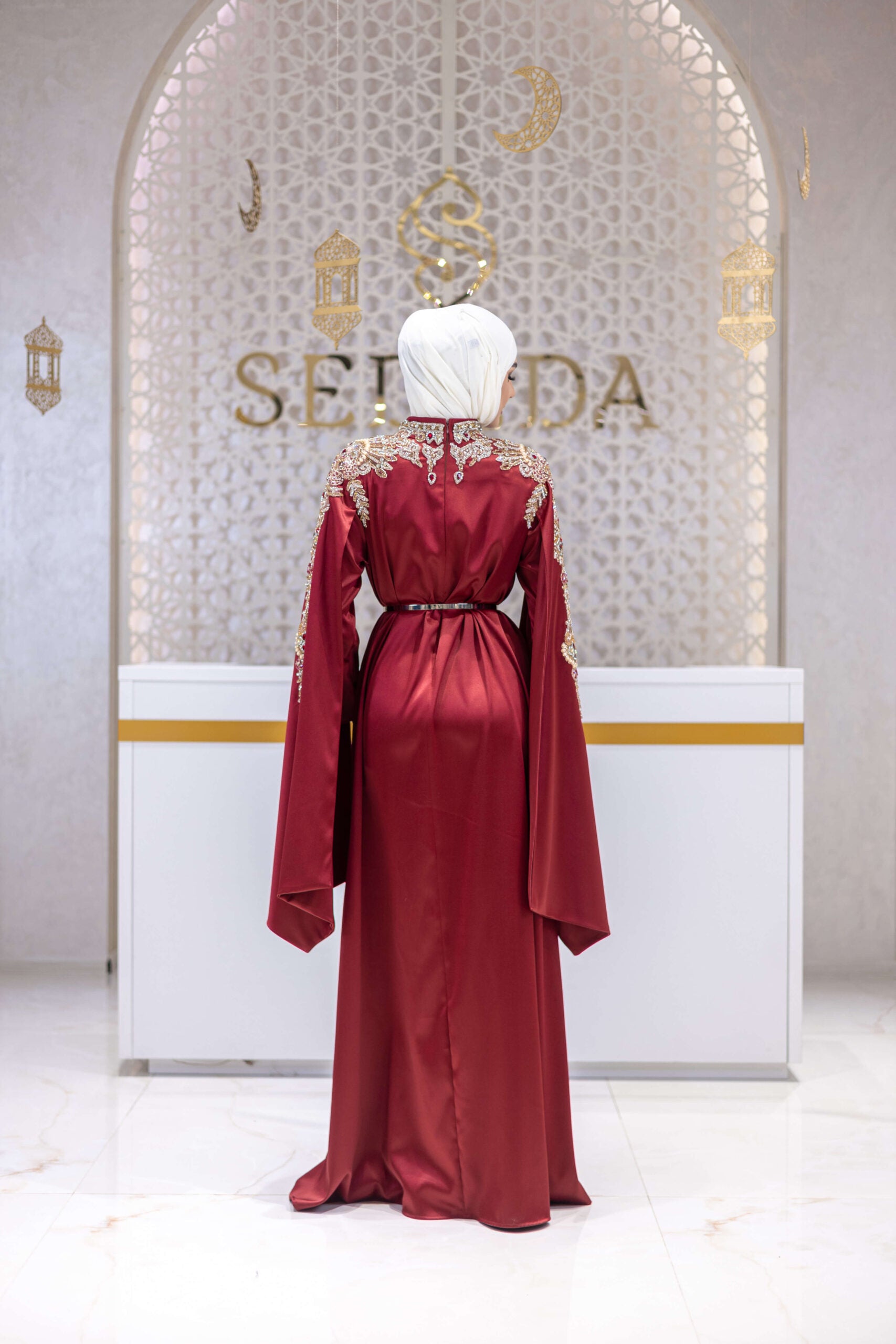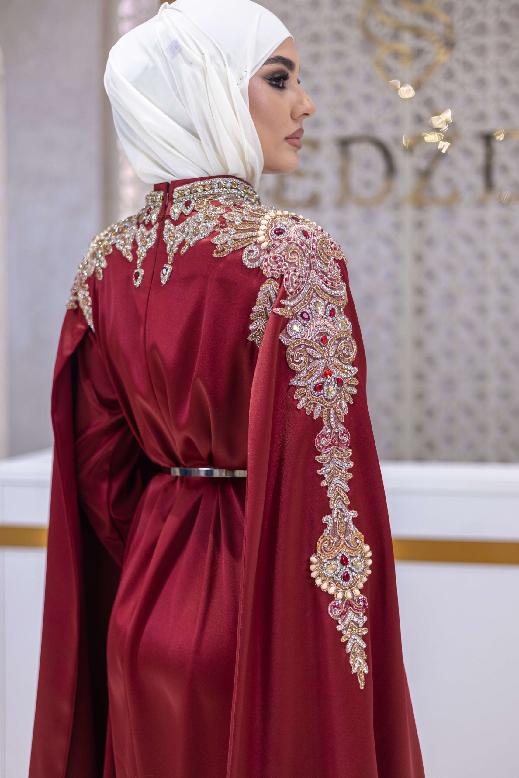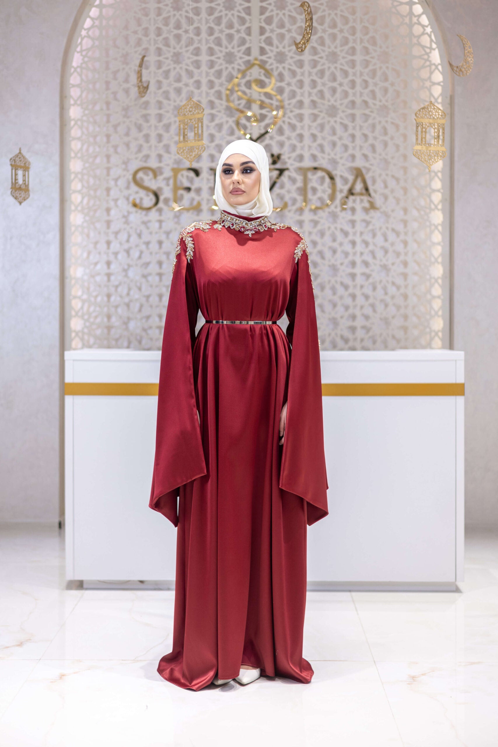 A refined satin gown designed for elegant evenings and formal receptions. The fluid silhouette is elevated by dramatic double sleeves, adding contemporary volume and graceful movement. A slender metallic belt defines the waist, while the lustrous satin fabric catches the light with every step. A timeless piece that balances modern sophistication with classic femininity.