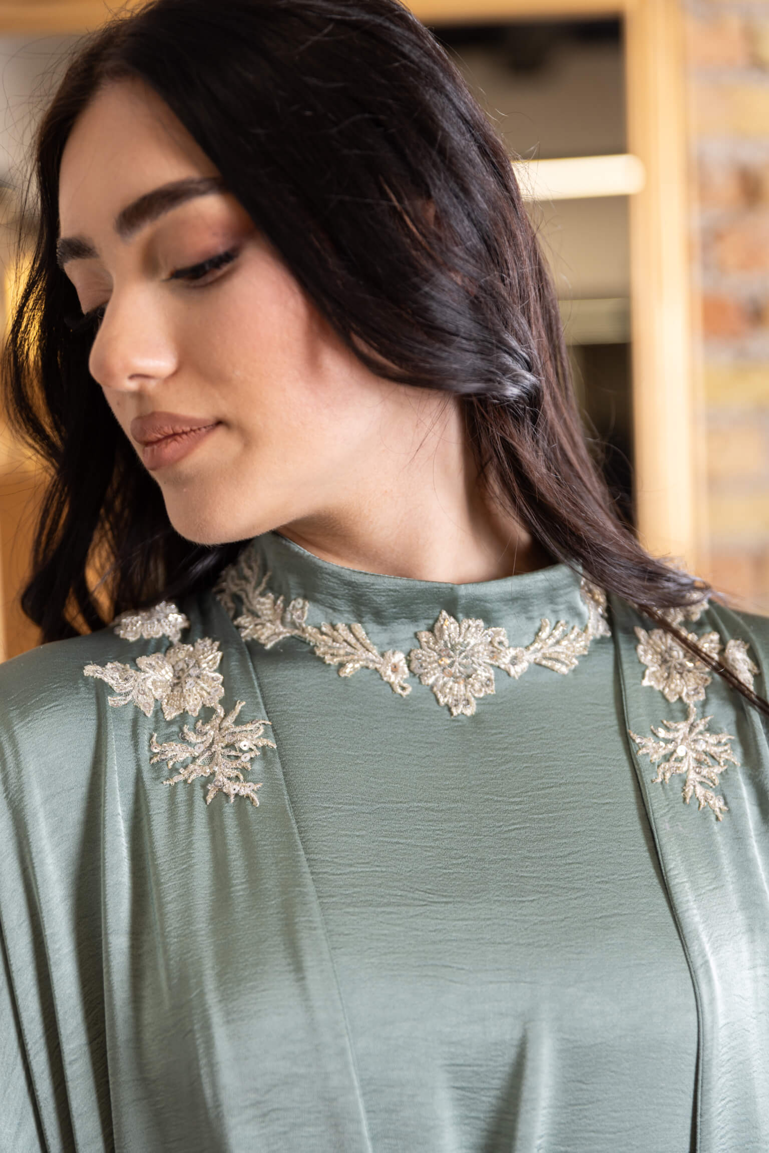 A refined interpretation of modern modest elegance, this abaya is created for the woman who exudes confidence through subtle sophistication. Crafted from fluid crepe satin, it features a softly structured underdress complemented by a flowing outer layer that drapes gracefully with every movement. Hand-embellished details along the neckline and sleeves add a delicate shimmer, balancing ceremonial presence with effortless comfort.