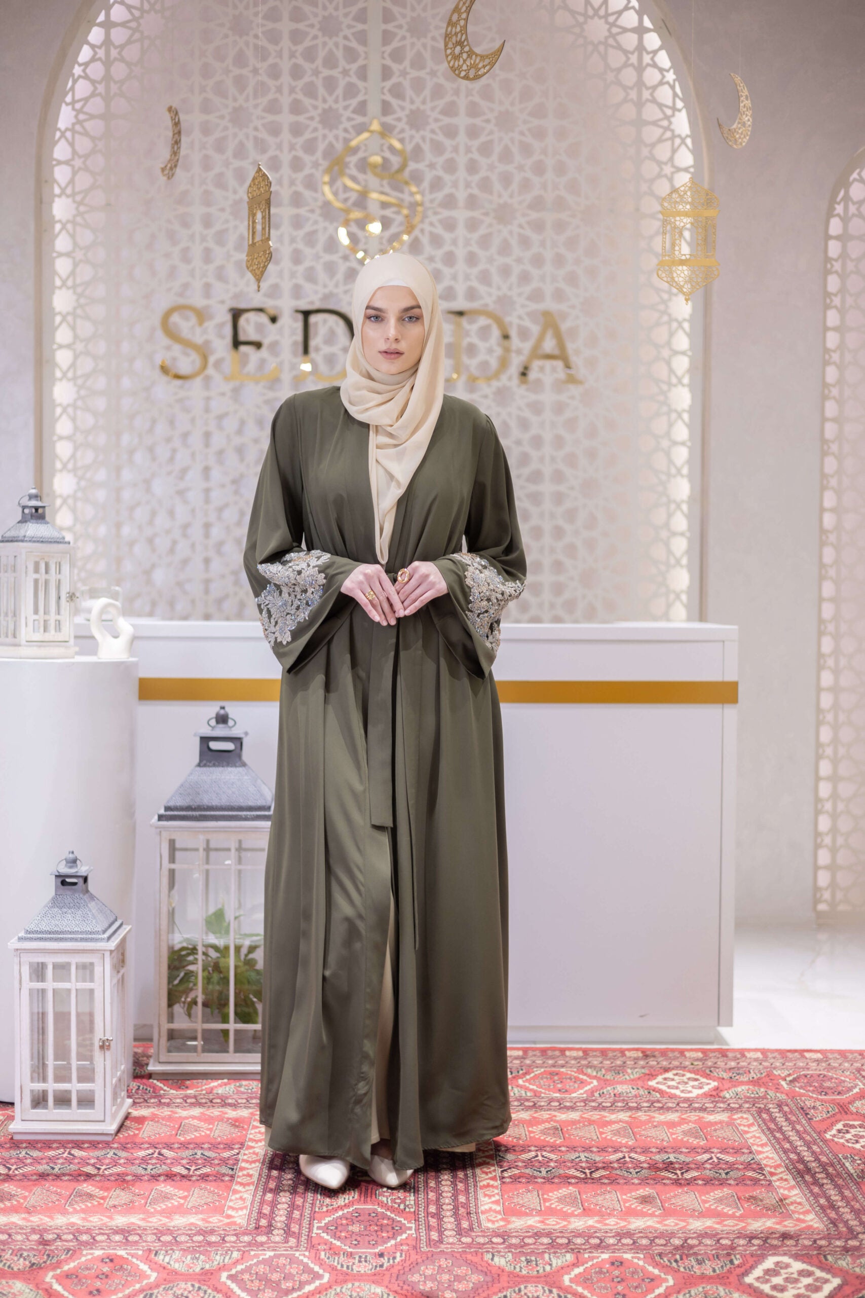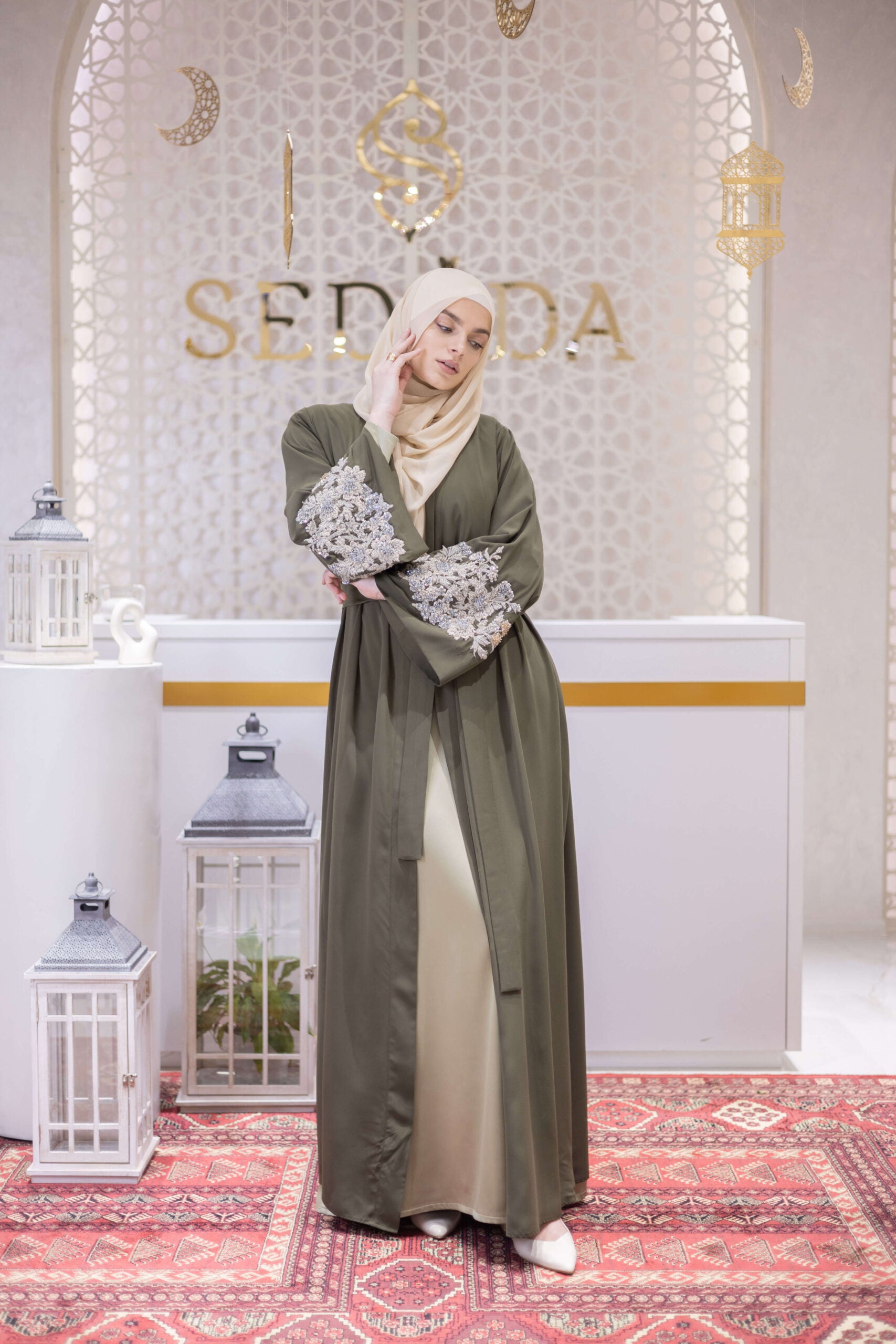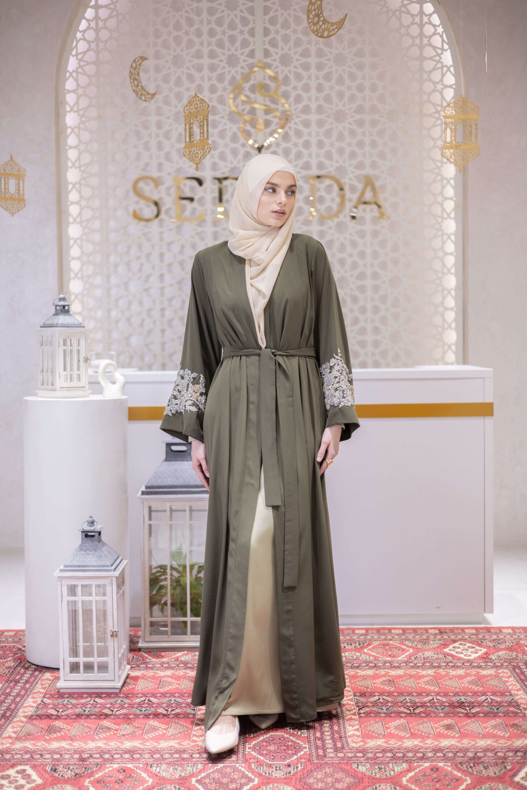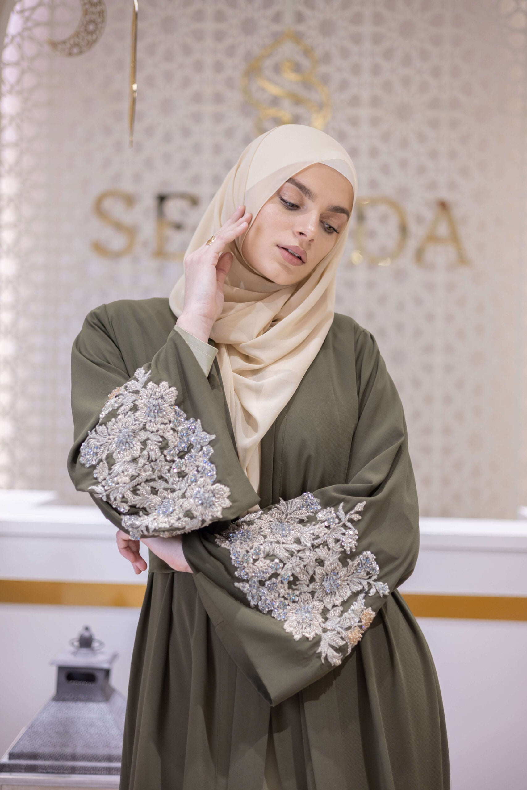 A composed expression of modern modest elegance, this abaya is designed for the woman who values strength in subtlety. Crafted from fluid Medina İpek, it features refined hand-embroidered detailing along the sleeves, forming intricate geometric and botanical motifs that add depth and quiet brilliance. The clean, elongated silhouette is balanced by an adjustable waist tie, creating a graceful drape that moves effortlessly between formal refinement and elevated everyday wear.