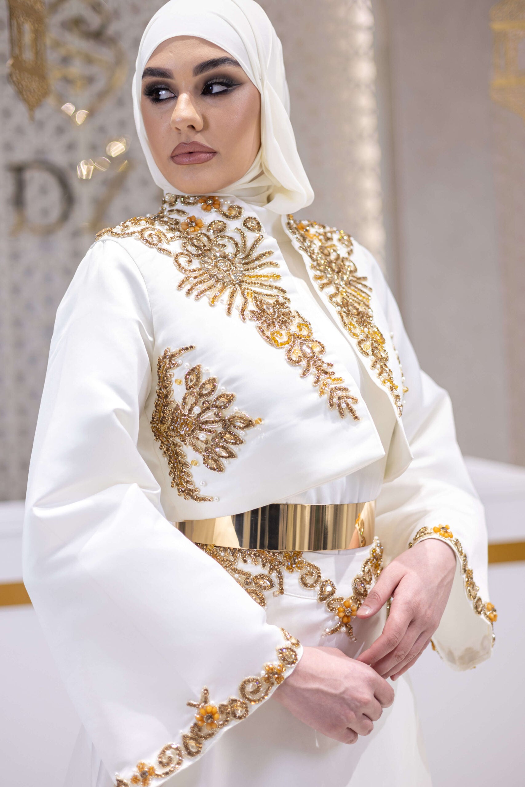 Top: Cropped vest with long sleeves, crystal embellishments, and golden floral embroidery