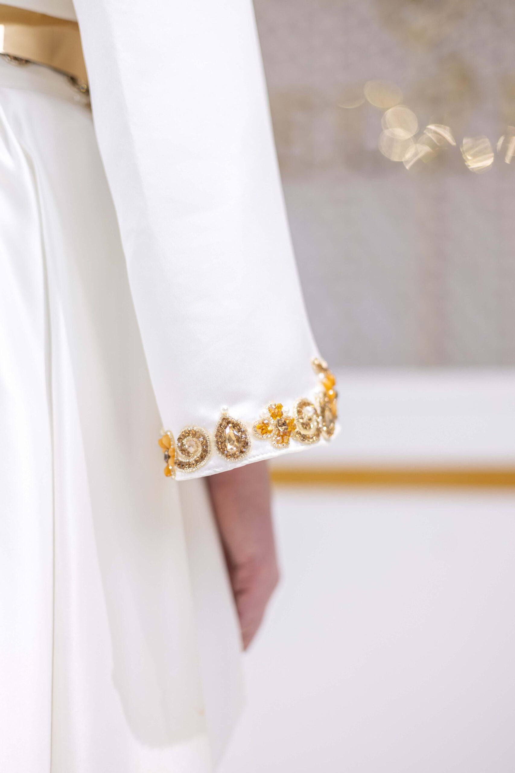 An elegant two-piece satin set conceived as wearable art. The cropped vest is adorned with intricate crystal detailing and golden floral embroidery, while the flowing maxi skirt enhances movement and grace. A refined composition that conveys purity, sophistication, and timeless femininity—designed for ceremonial moments and elevated occasions.