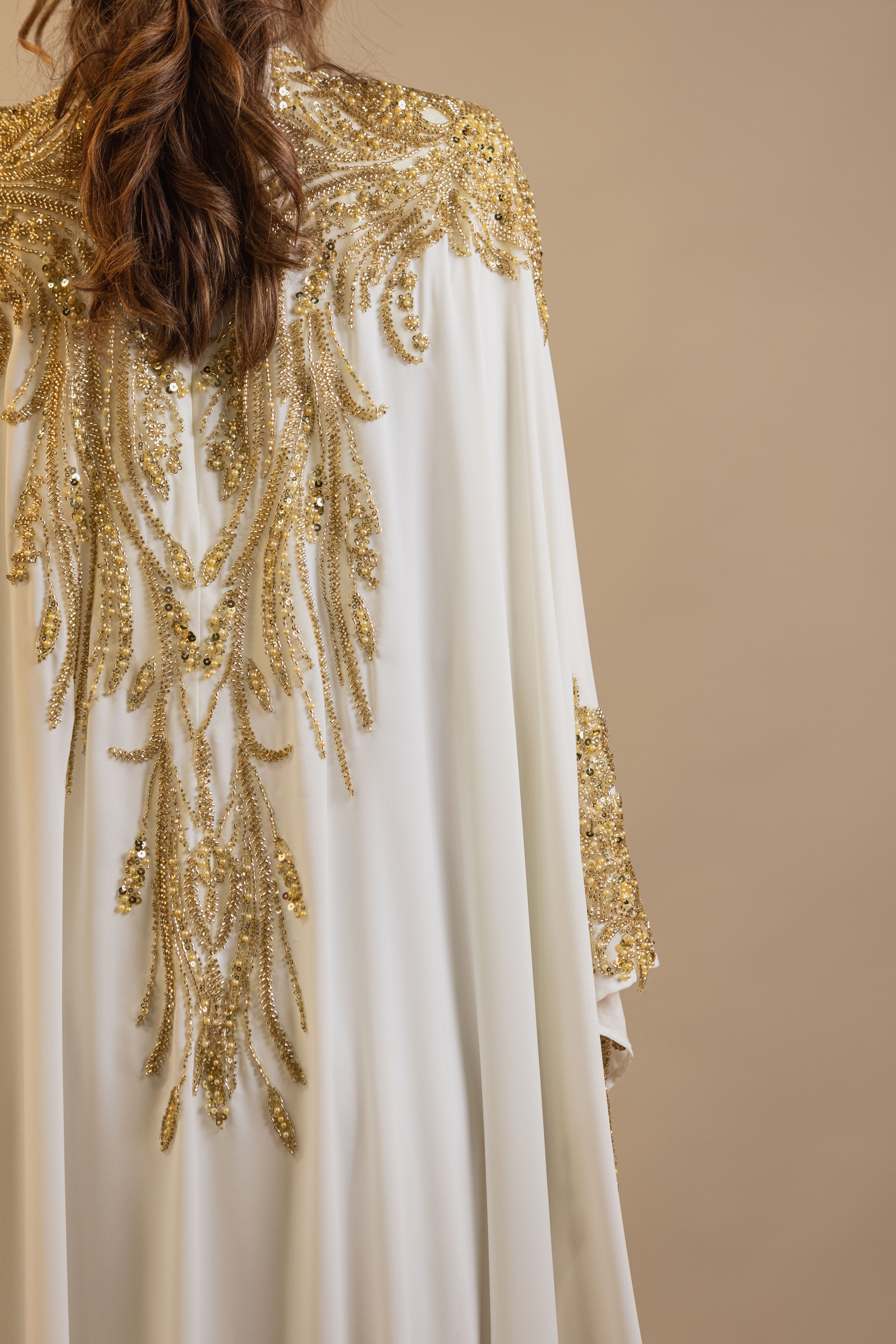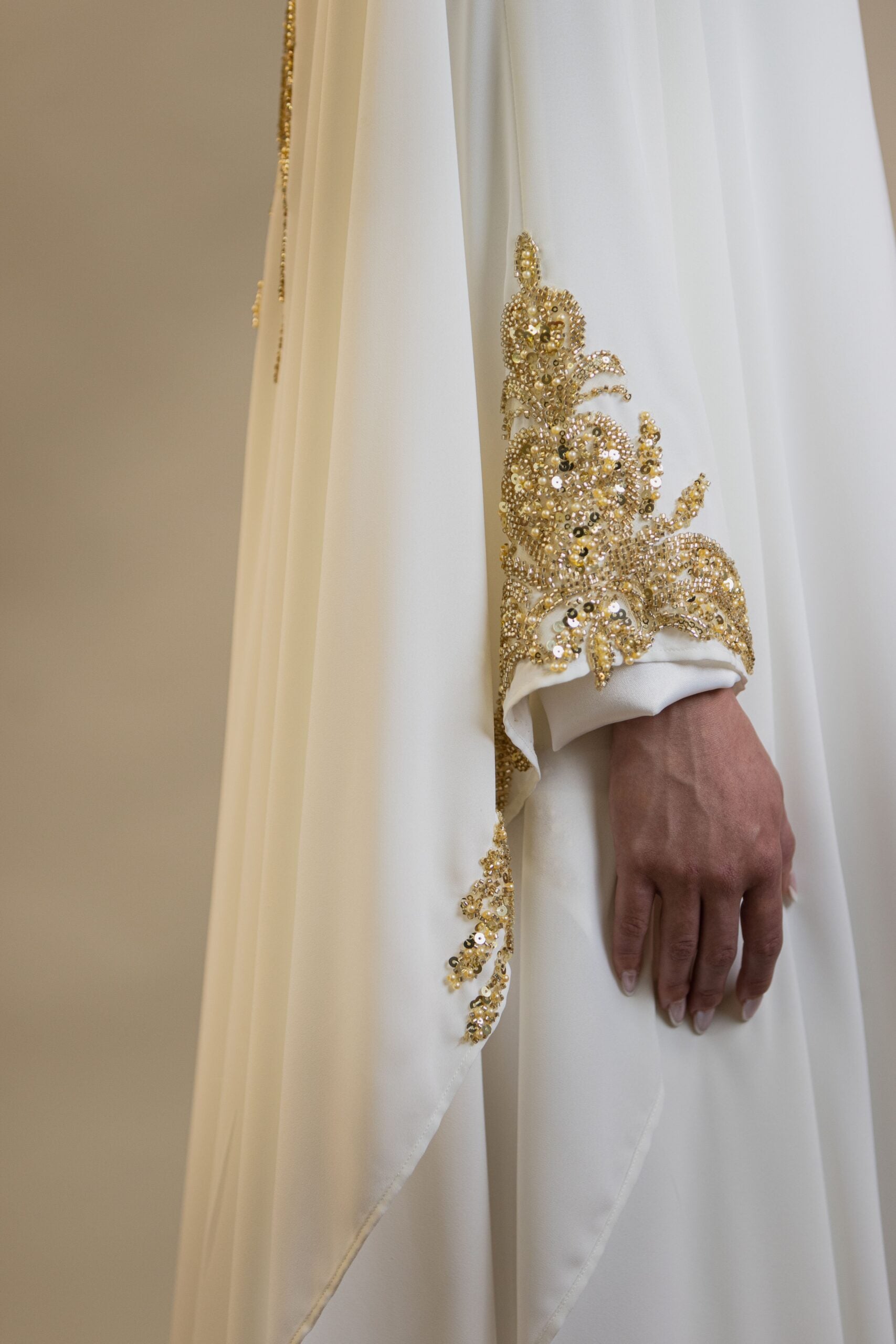 An elegant interpretation of classic craftsmanship, this abaya is defined by its fluid silhouette and refined hand embroidery that radiates from the collar and extends across the back. Crafted in lightweight chiffon layered over a smooth satin underdress, the design creates a graceful, luminous drape. Golden embroidery adds a regal touch while maintaining a balanced sense of modesty and sophistication, making the piece timeless and ceremonial.