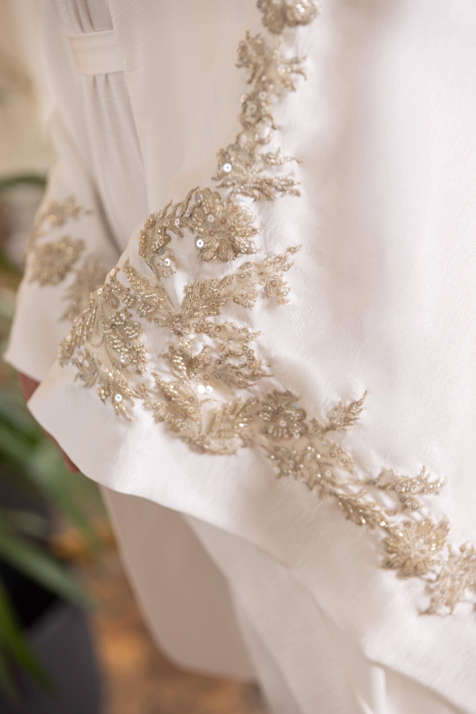 A luminous expression of refined modest elegance, this abaya is designed for the woman who commands attention through quiet opulence. Crafted from fluid crepe satin, it features a softly structured underdress paired with a flowing outer layer that drapes effortlessly. Hand-embellished details add subtle brilliance, creating a harmonious balance between comfort, grace, and ceremonial sophistication.