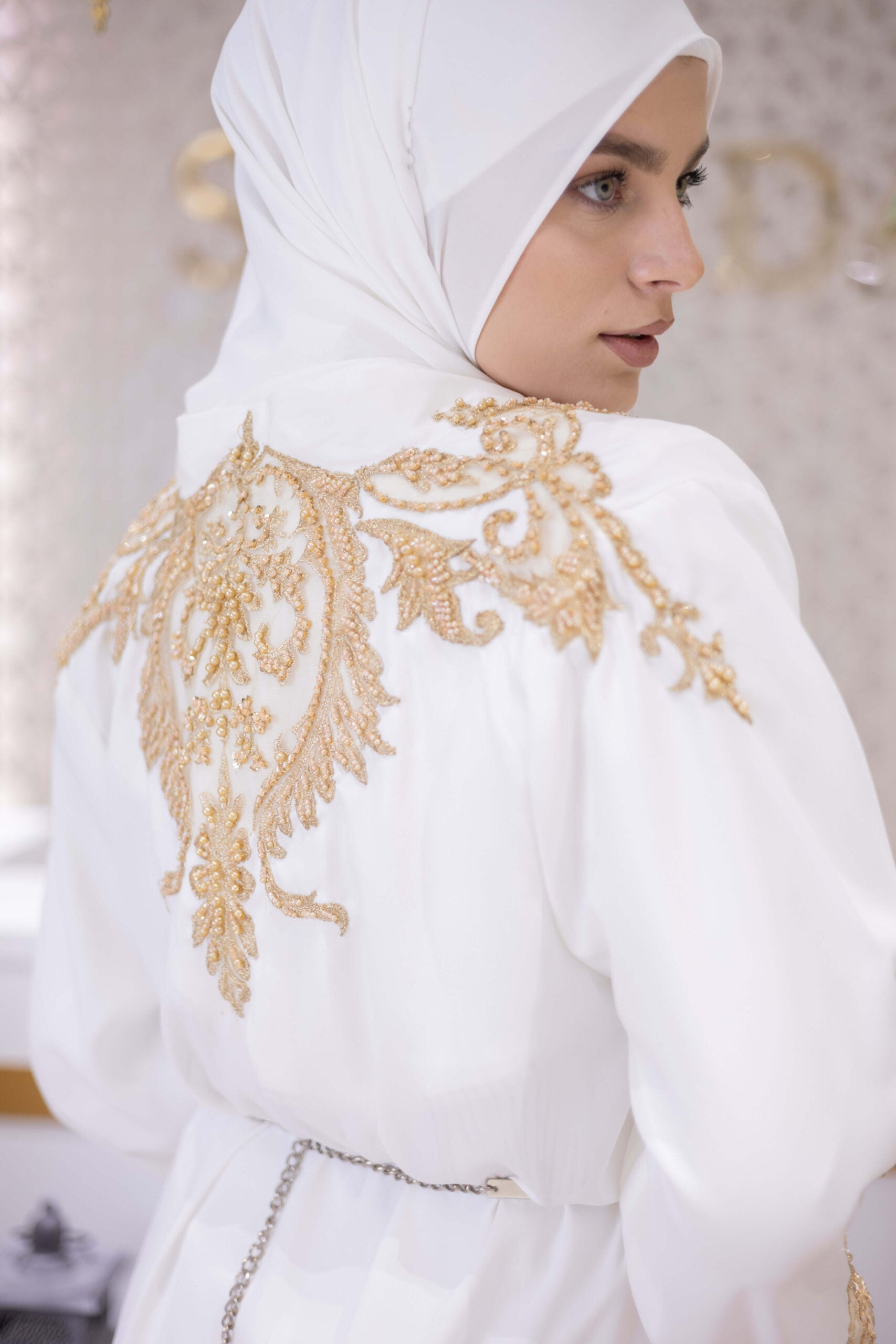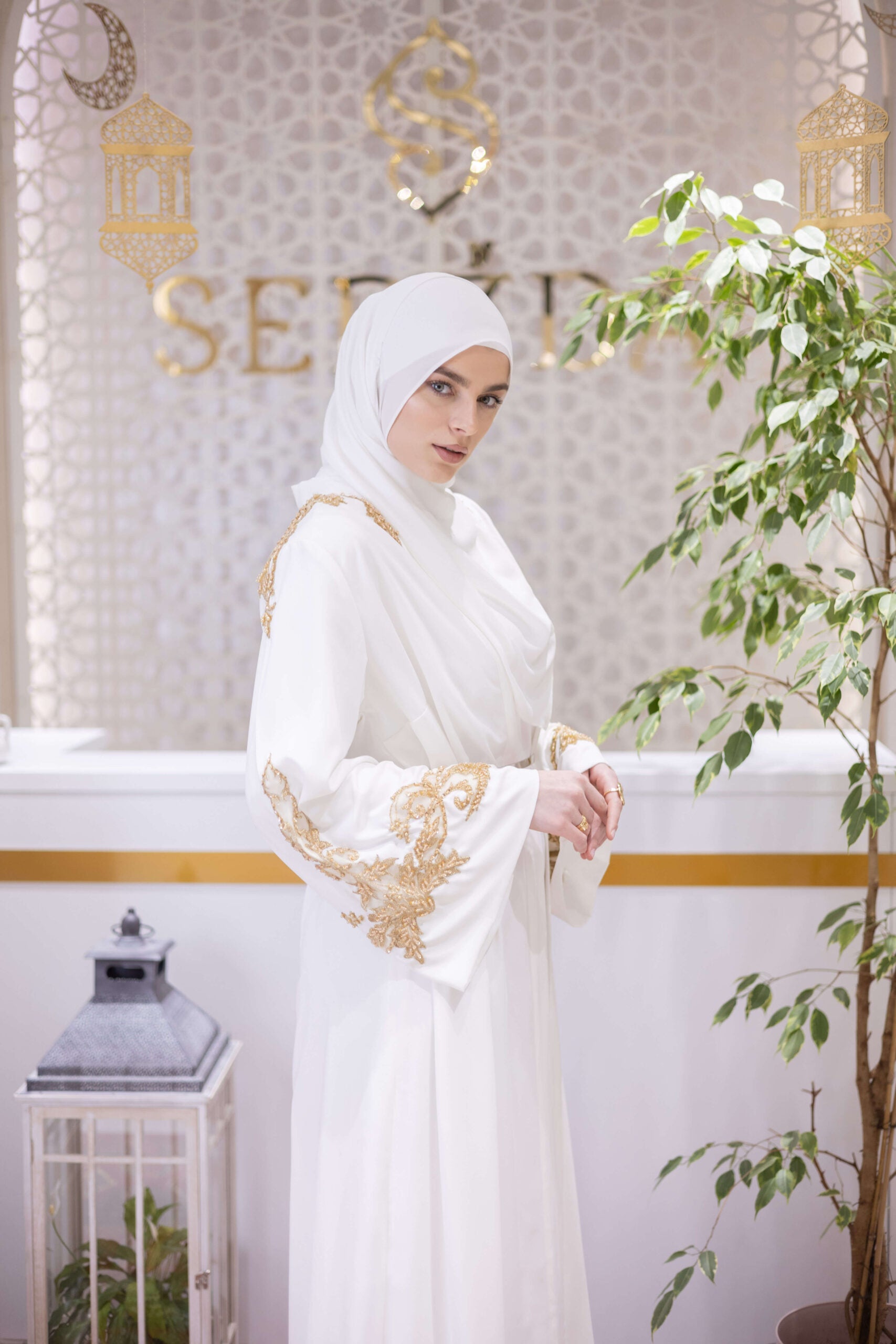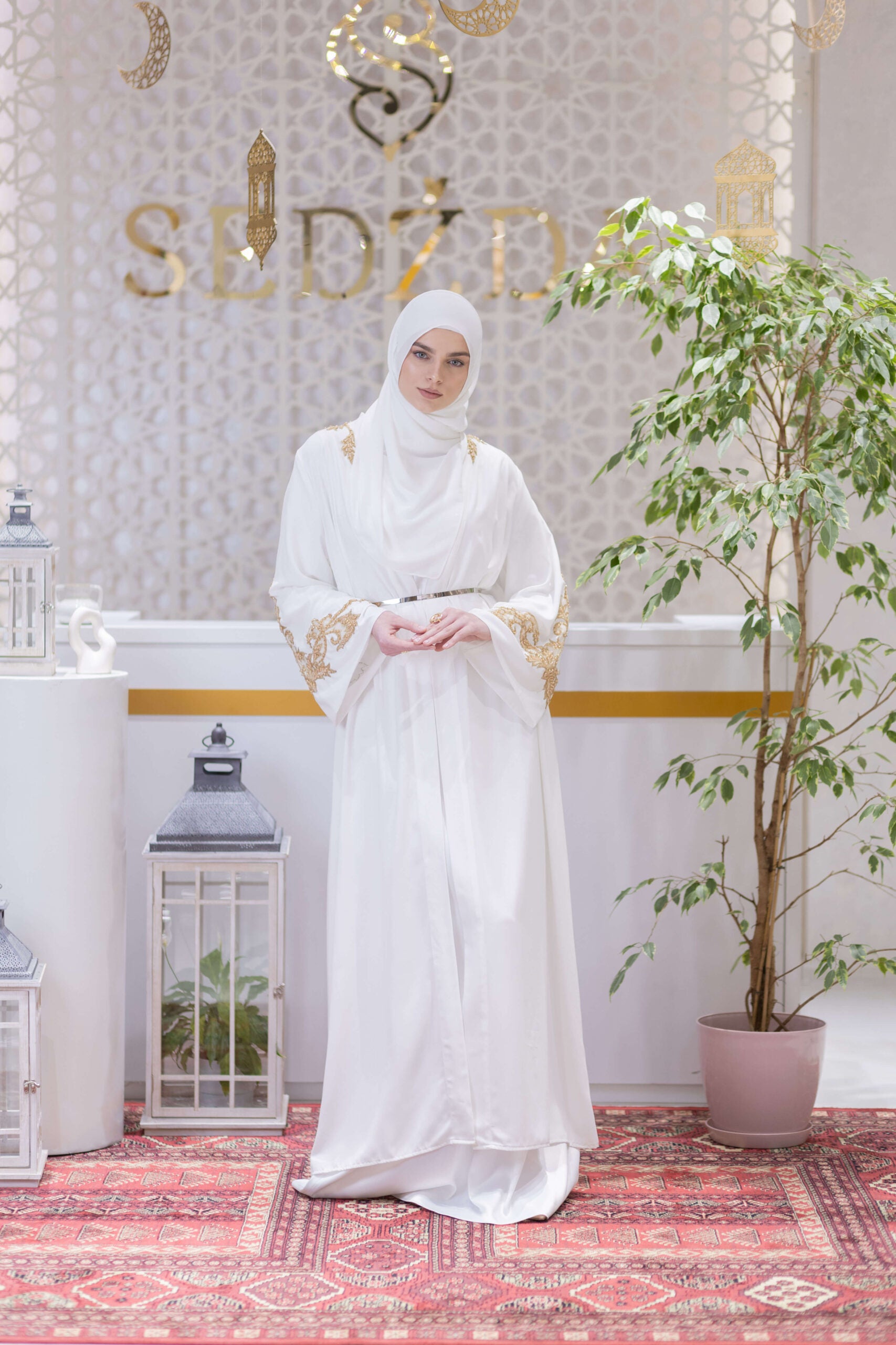 A luminous interpretation of timeless modest elegance, this abaya is crafted from flowing Medina İpek and enriched with intricate hand embroidery in refined gold tones. Ornamental motifs cascade across the shoulders and sleeves, creating a regal yet understated presence. The lightweight fabric drapes effortlessly, while the adjustable waist tie allows for a personalized, elegant silhouette—making it suitable for both intimate family gatherings and formal occasions.
