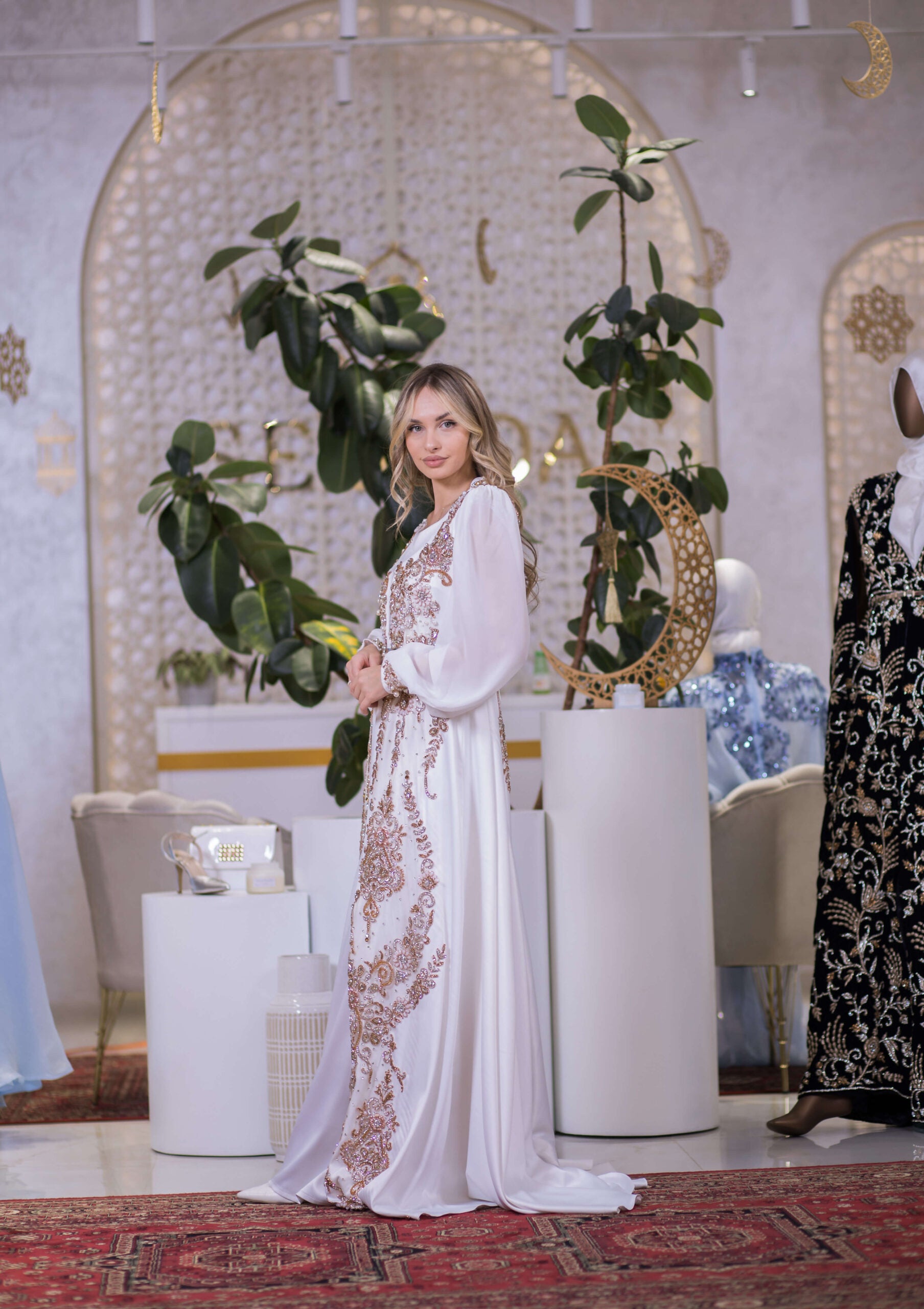 A luminous white satin kaftan designed as a statement piece that blends elegance with symbolic craftsmanship. The fluid satin base is elevated by opulent gold hand embroidery flowing along the bodice and length, creating a refined yet expressive silhouette. Softly voluminous sleeves add lightness and movement, while the structured waistline offers subtle definition without compromising comfort.