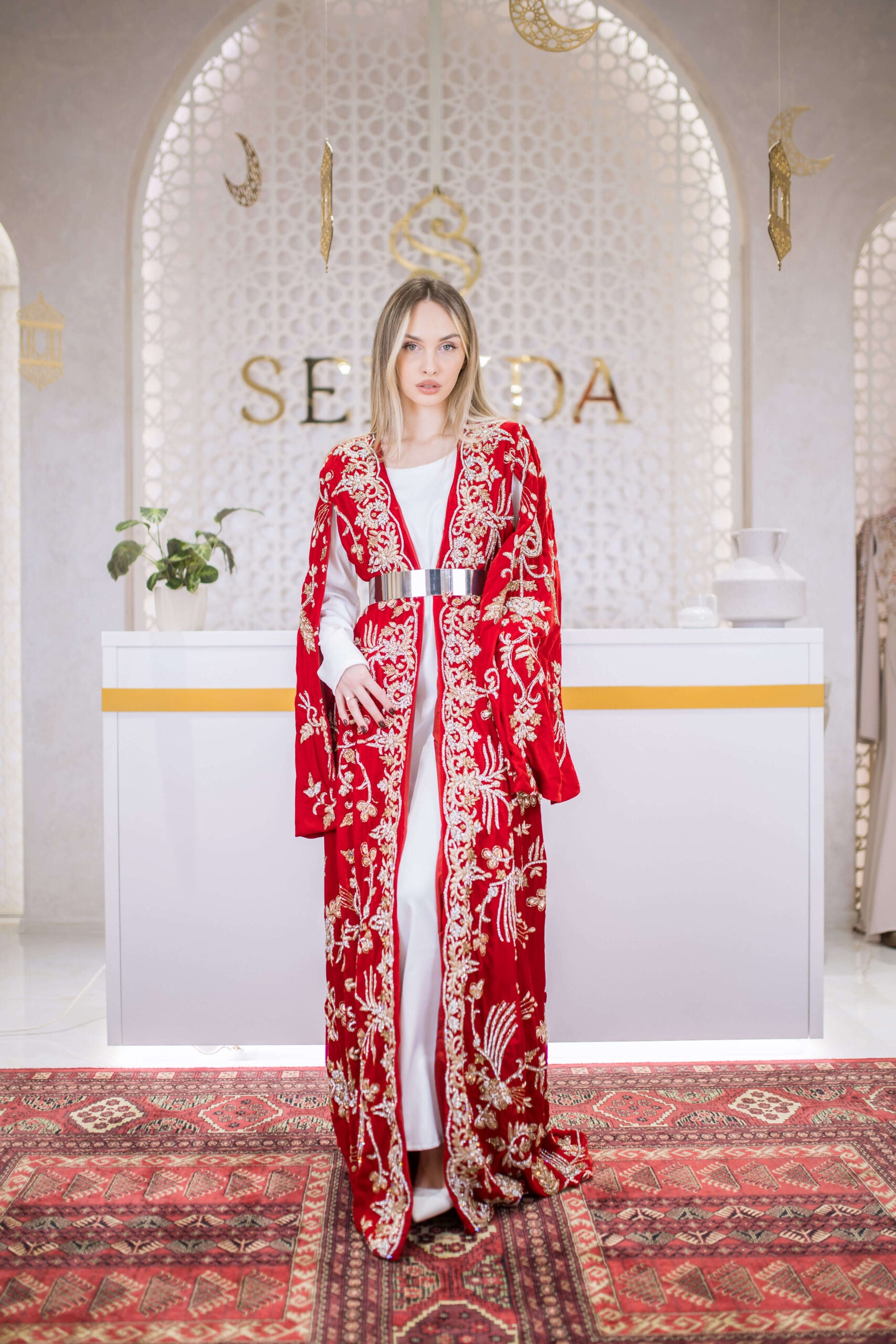 Fit: Designed as an outer ceremonial kaftan with a relaxed yet structured silhouette. The flowing cut allows layering over an inner dress, while the wide sleeves and elongated lines create a dramatic, unforgettable presence—ideal for weddings, formal ceremonies, and statement occasions.
