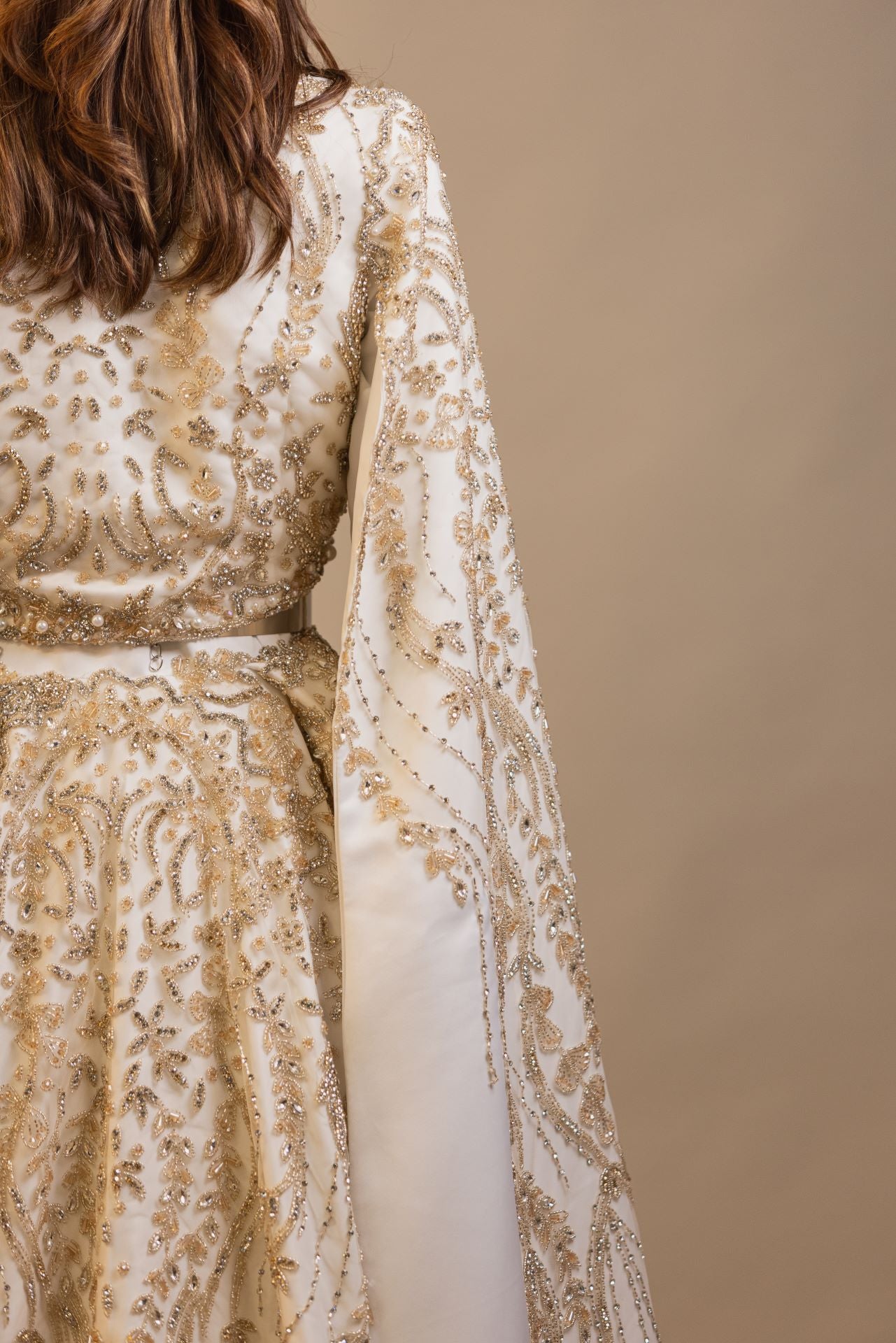 A full-length ceremonial kaftan conceived as a luminous statement piece, designed to captivate through refined structure and exceptional craftsmanship. Crafted from premium ivory satin, the silhouette is enriched with cascading hand embroidery and crystal embellishments that flow gracefully from bodice to hem. Dramatic elongated sleeves enhance the sense of movement, while the fluid drape creates an ethereal presence with every step. A regal design that balances opulence and elegance, ideal for grand celebrations where distinction is essential.