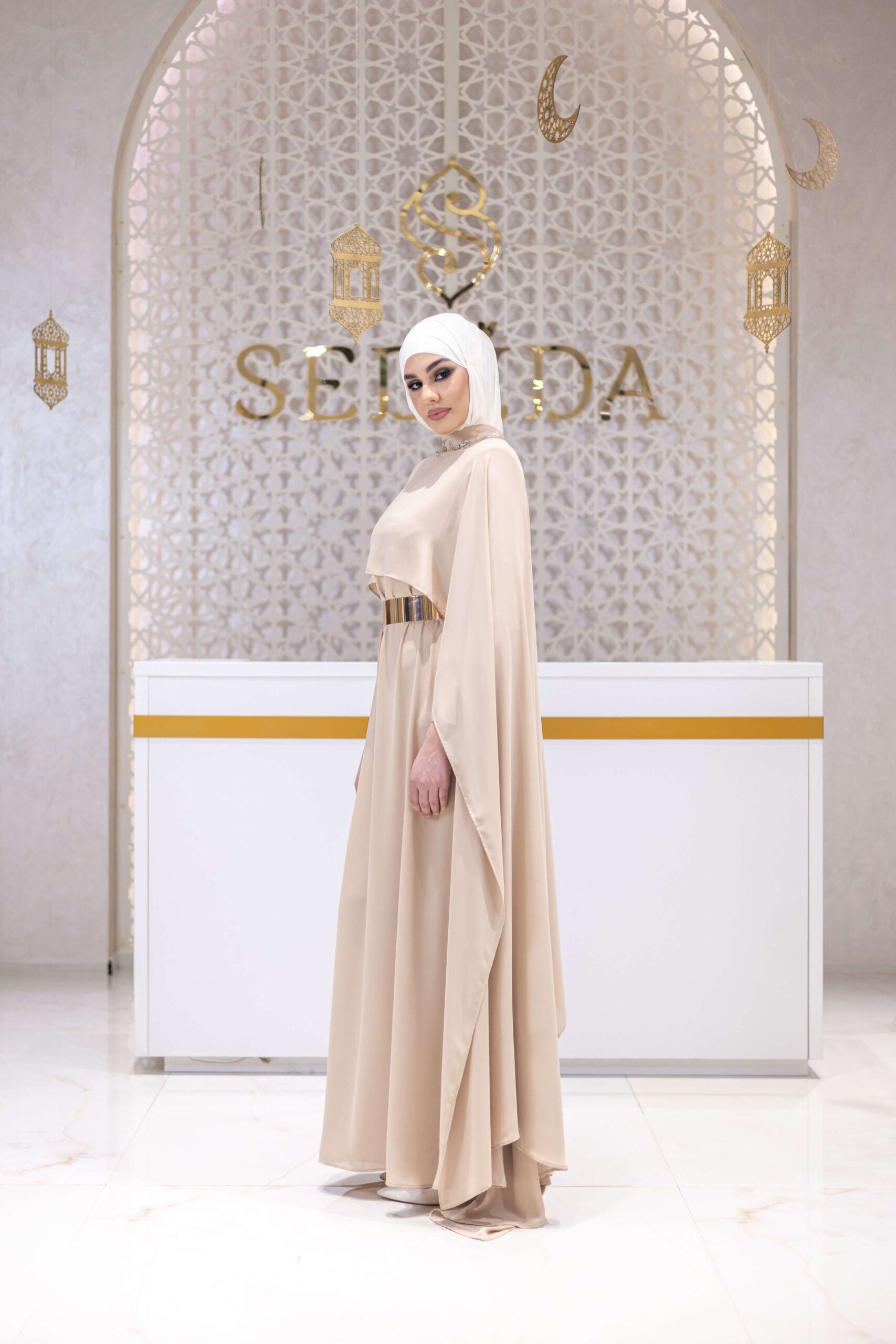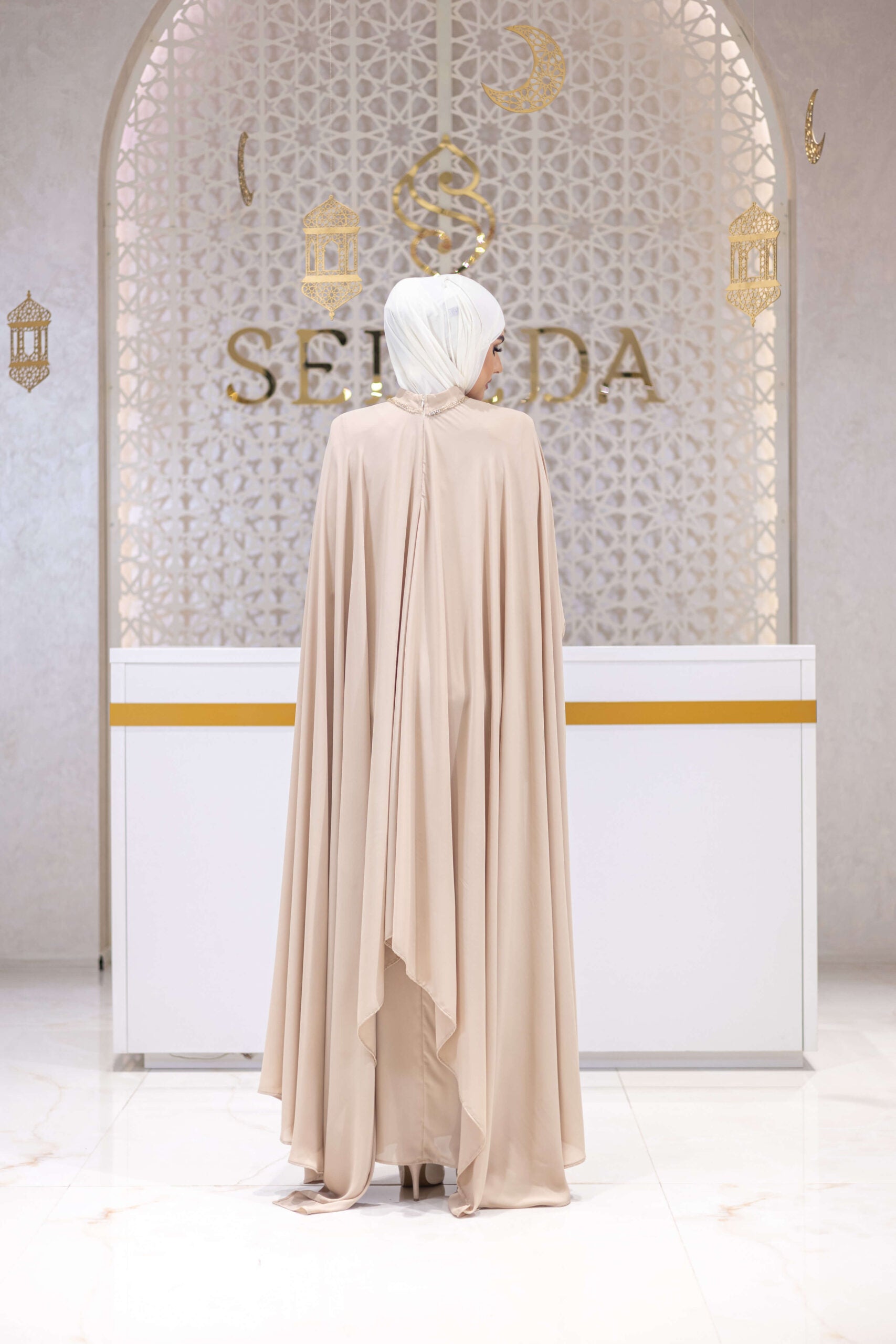 An elegant floor-length gown designed for refined daytime occasions and sophisticated settings. Crafted from fluid chiffon, the silhouette is elevated by subtle hand embroidery along the neckline, forming a delicate collar effect. Dramatic cape-style sleeves flow effortlessly with movement, while a gold metallic belt defines the waist, creating a balanced and graceful presence. A versatile piece that transitions seamlessly from semi-formal gatherings to elevated work and social events.