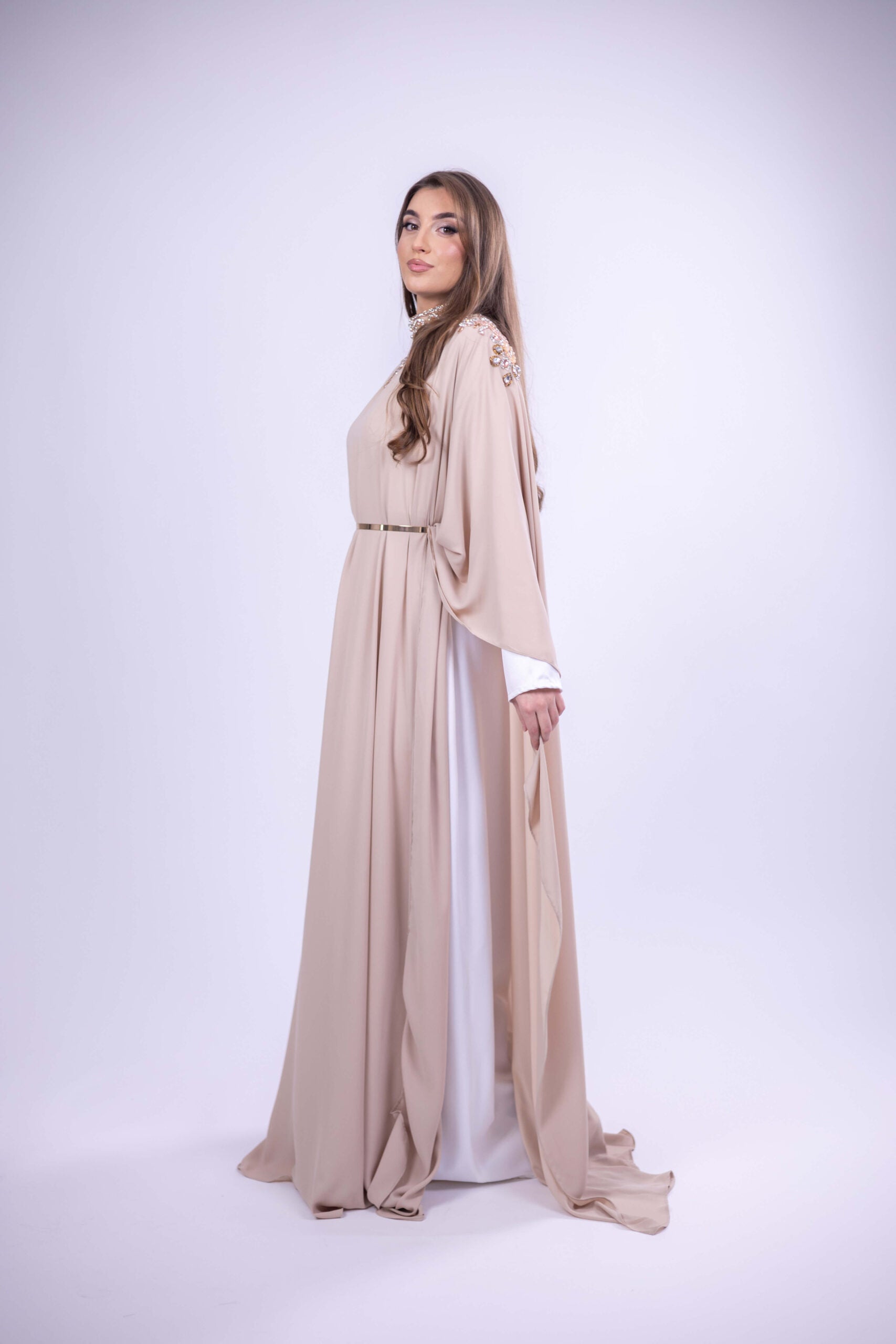 A refined expression of modest elegance, this abaya is designed with a fluid, elongated silhouette that drapes effortlessly over the body. Delicate embellishment along the high neckline and shoulders adds a subtle sense of occasion, while the softly flowing sleeves and optional belt create a balanced harmony between structure and ease.