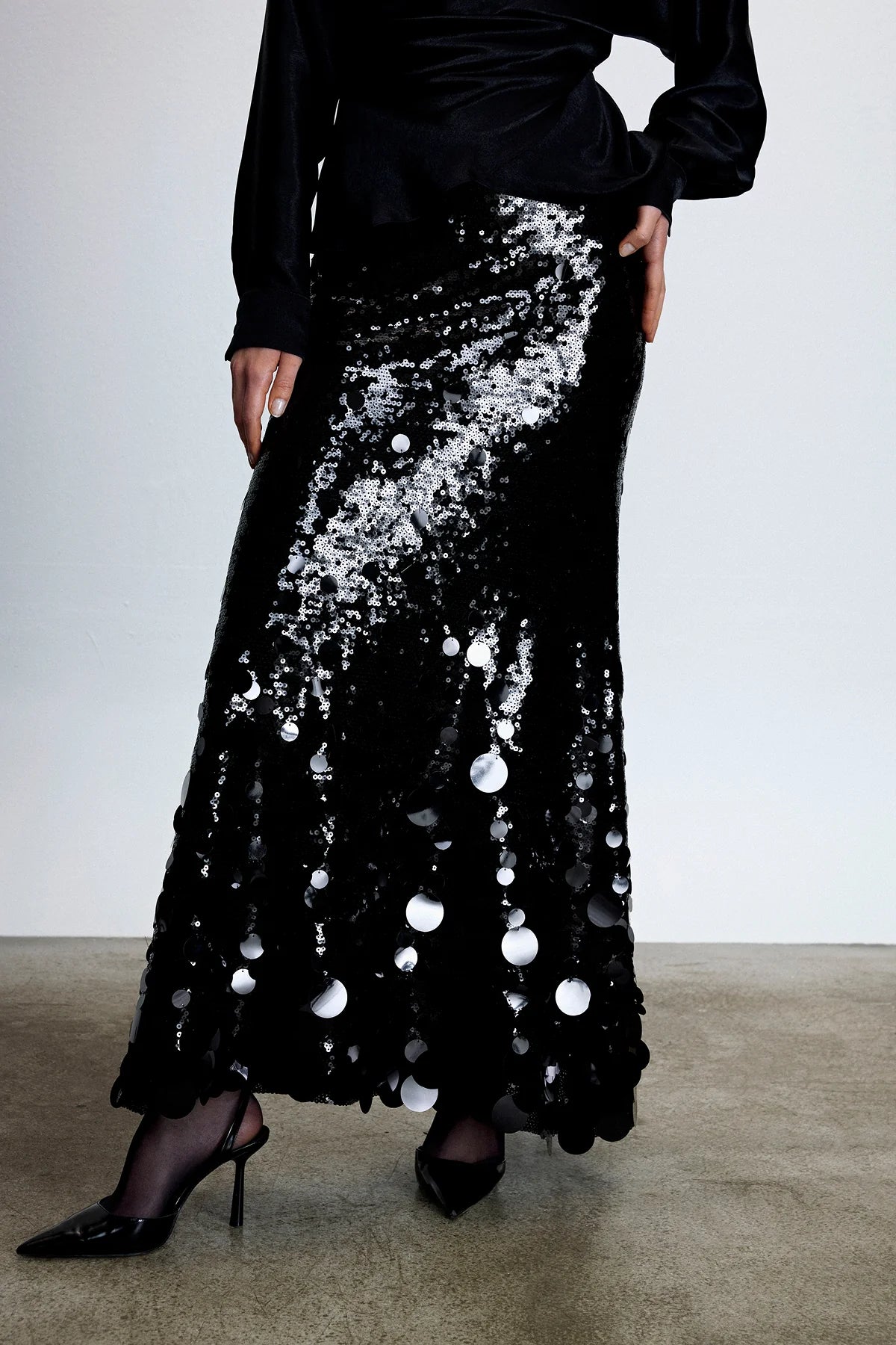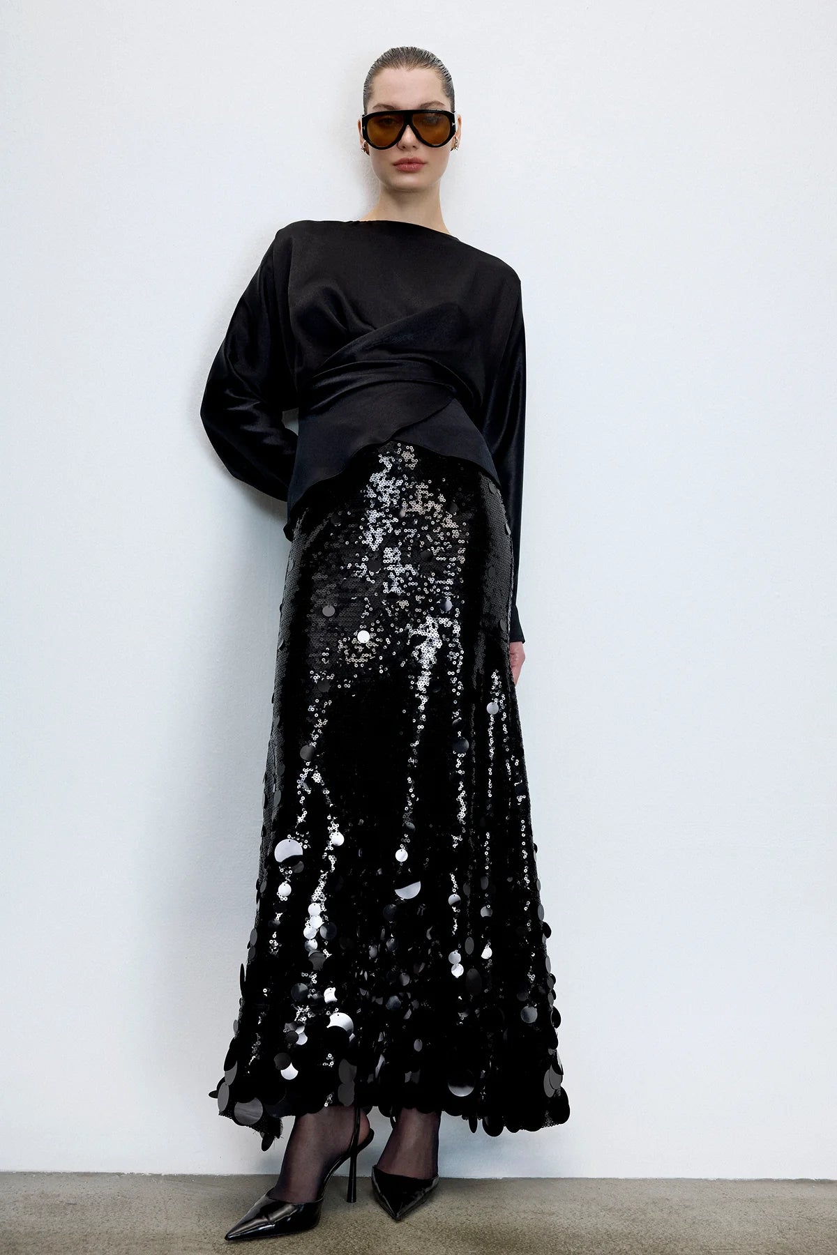 A striking evening skirt crafted with full sequin embroidery that catches the light from every angle. Designed with cascading oversized paillettes toward the hem, it delivers fluid movement and a dramatic, high-shine finish—perfect for refined celebrations and elevated nightwear styling.