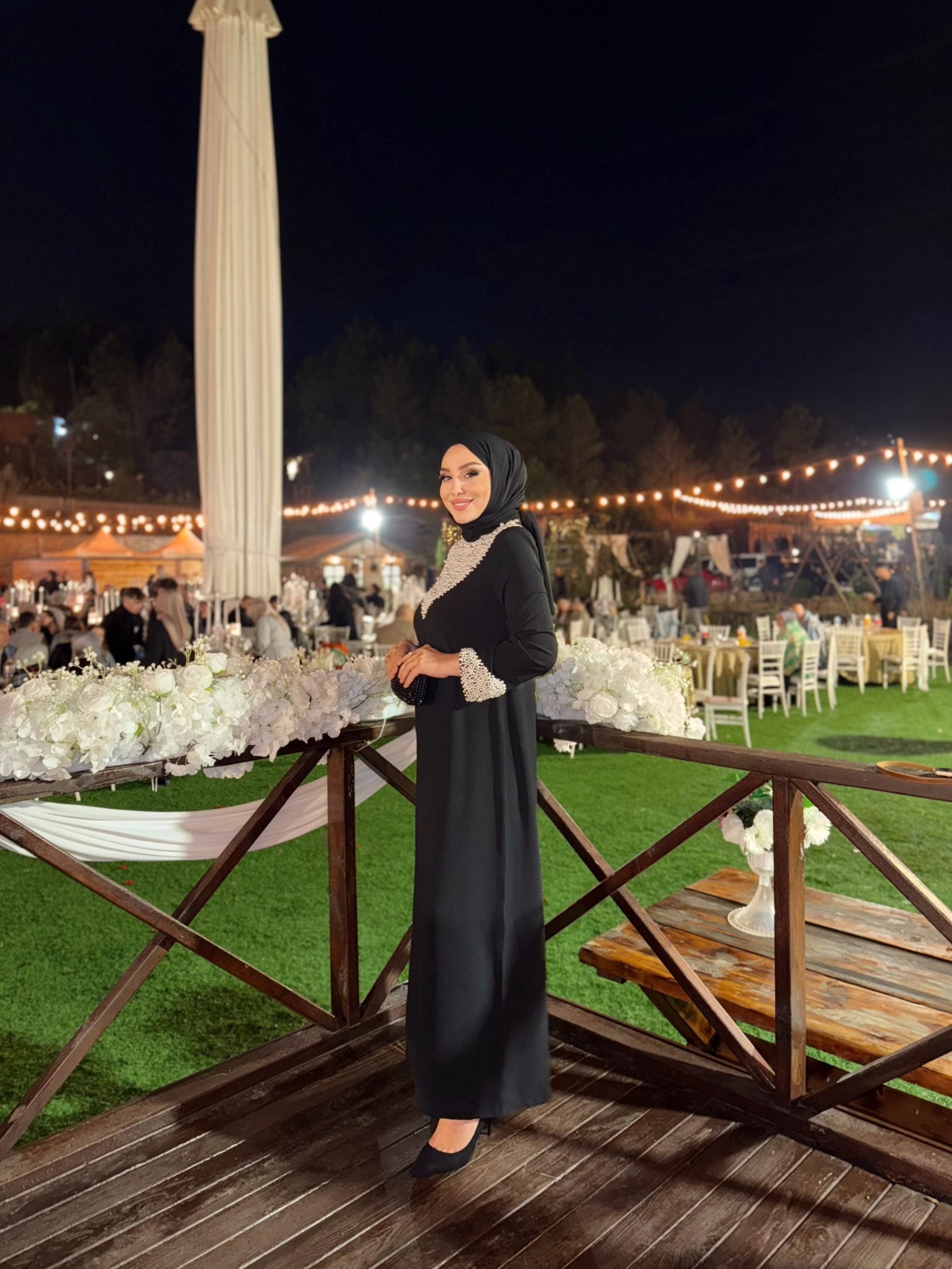 An exquisite statement of grace and craftsmanship, this satin maxi dress features intricate hand-applied pearl embellishments across the high neckline, cuffs, and front yoke. The flowing silhouette falls elegantly to the floor, evoking timeless sophistication for evening or ceremonial occasions. Designed without lining to maintain its lightweight drape, this piece embodies pure refinement with a modern modest sensibility.