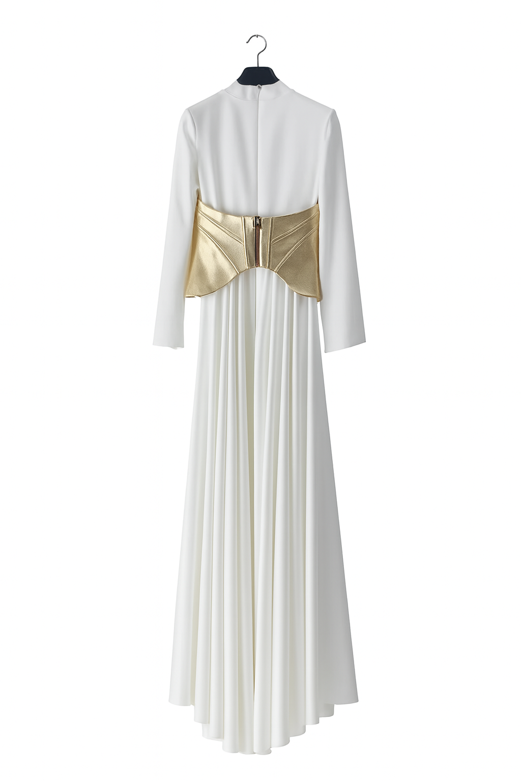 A modern evening silhouette defined by a structured high neckline, elongated sleeves, and a fluid satin skirt. The sculpted metallic corset belt introduces a striking contrast, enhancing the waist and adding architectural definition to the design. With its clean lines and graceful movement, this gown is crafted for contemporary elegance at formal receptions and special events.