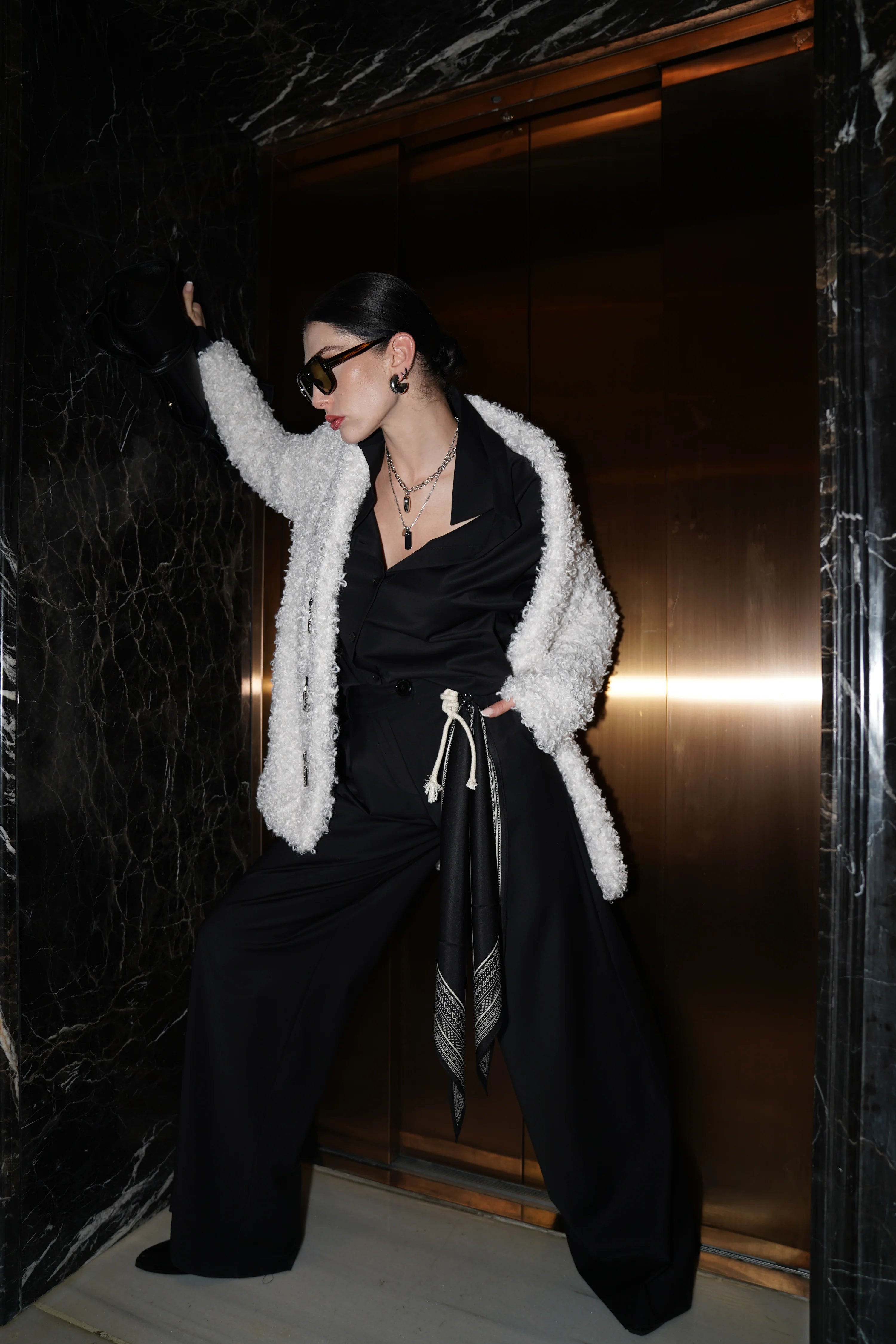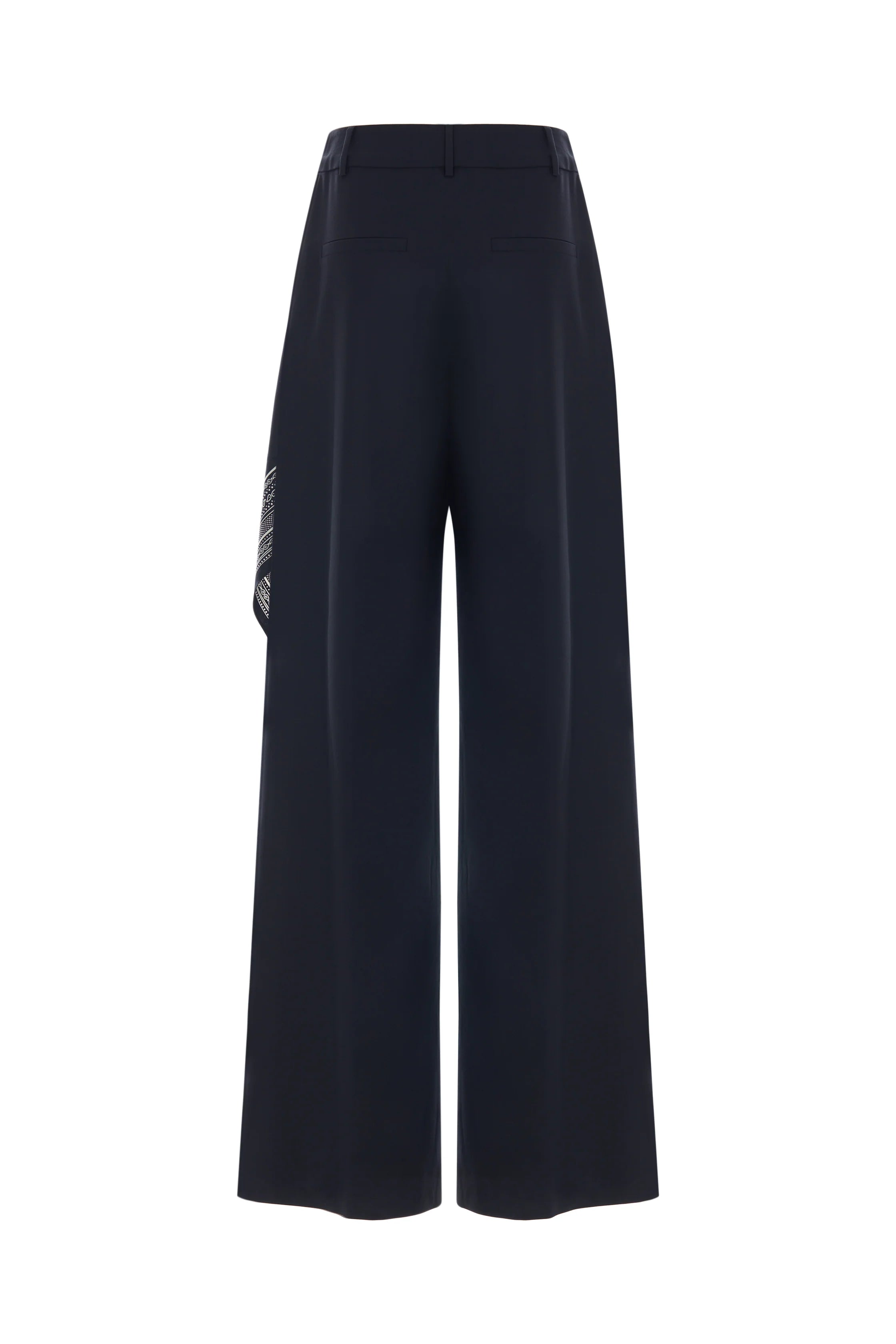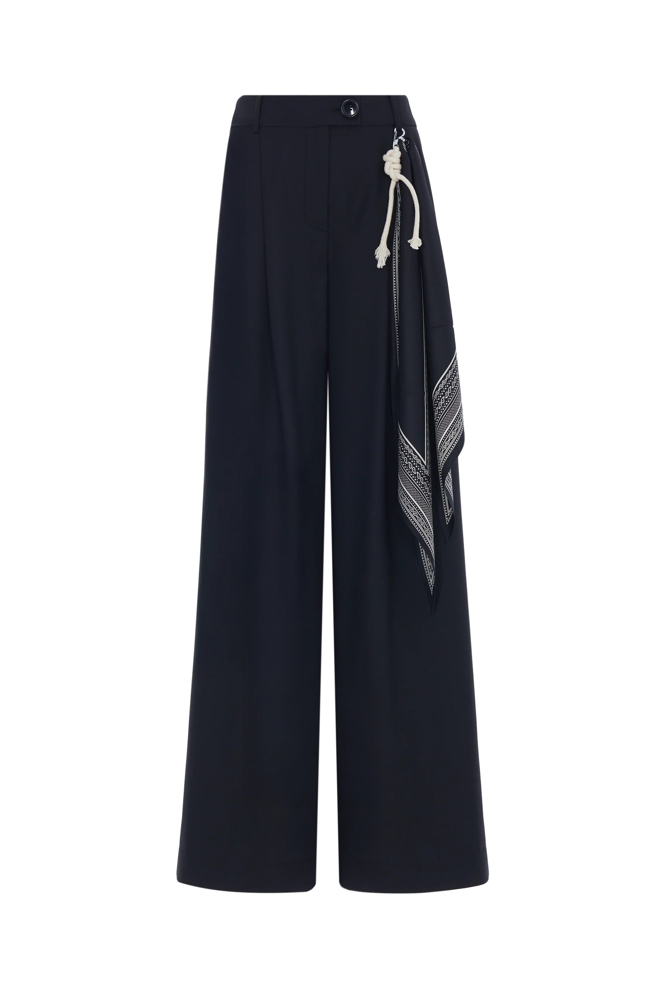 These wide-leg palazzo trousers combine a fluid drape with tailored structure, crafted from a refined wool blend. The removable scarf detail at the waist adds styling versatility — drape it, tie it, or wear the trousers clean for a minimalist look. A sophisticated piece designed to elevate both casual and evening outfits with effortless confidence.