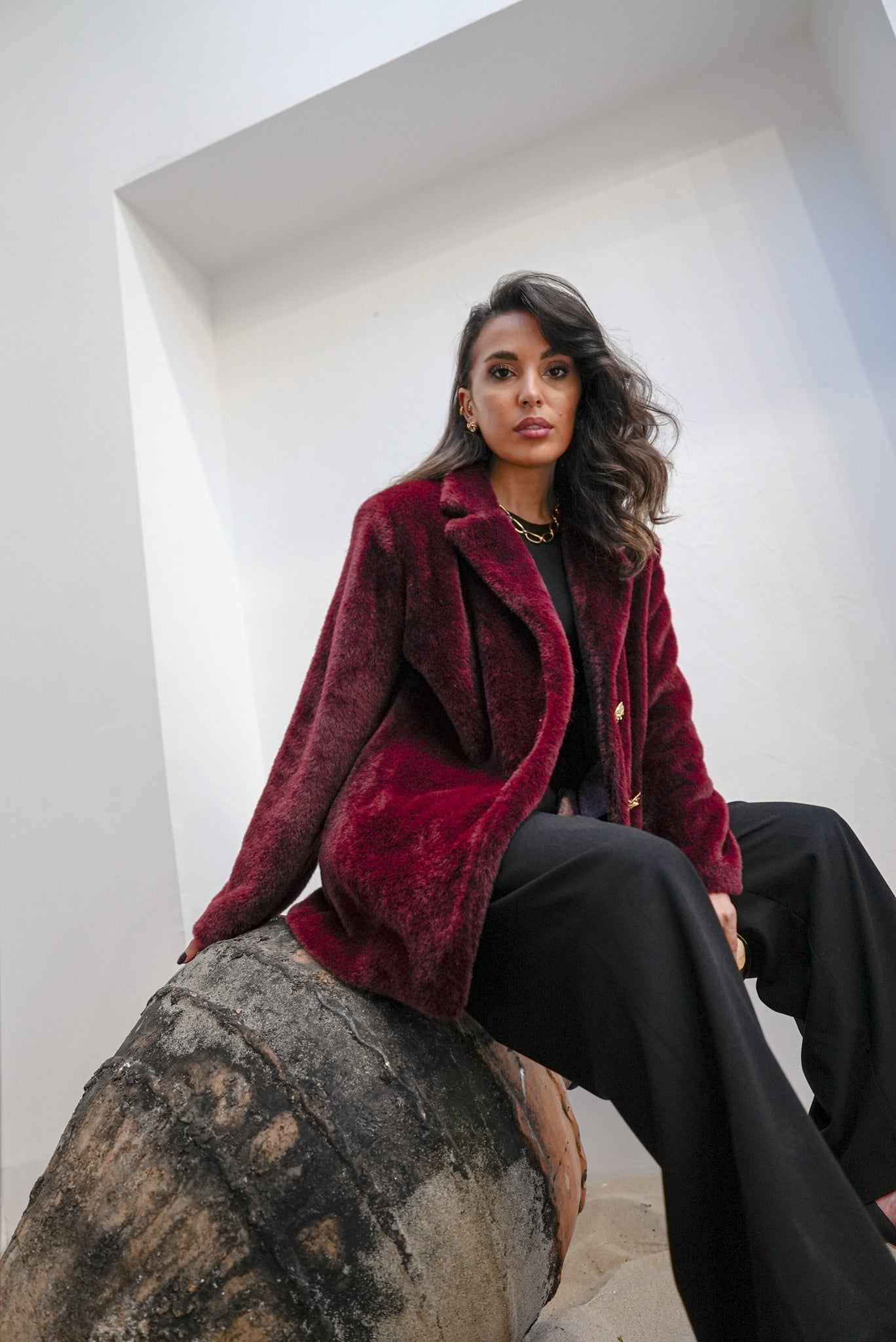 Crafted from a plush, ultra-soft faux-fur texture, this coat blends warmth with timeless sophistication. The structured lapel, gold-tone buttons, and tailored silhouette elevate even the simplest outfit — making it perfect for dinners, events, or luxury daywear.