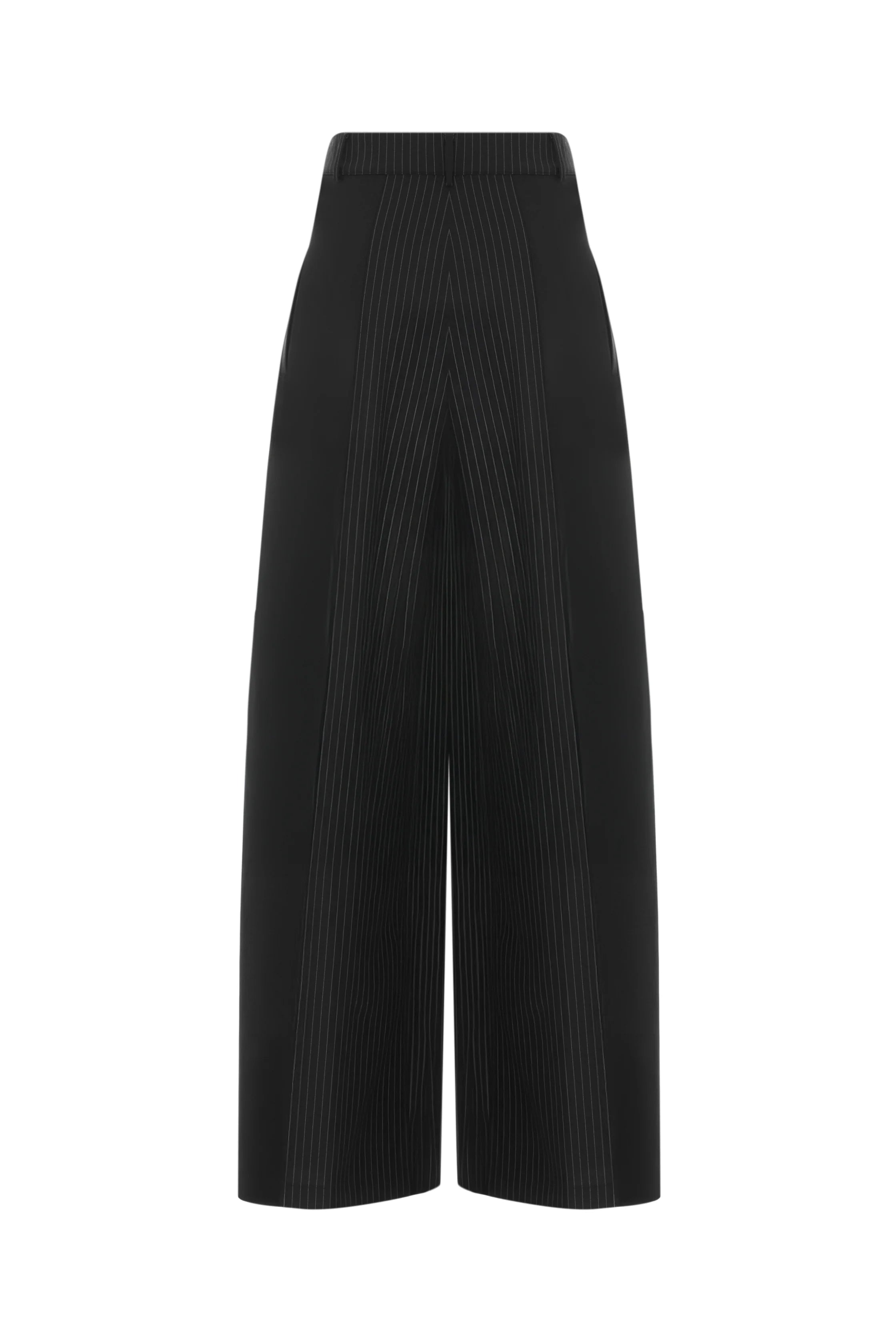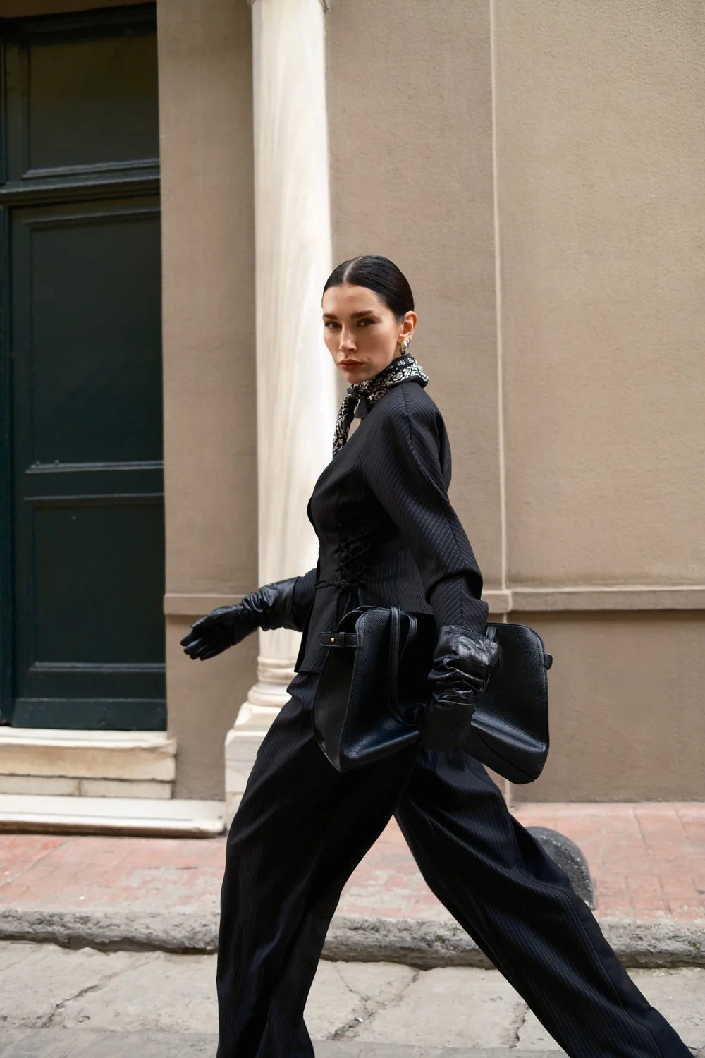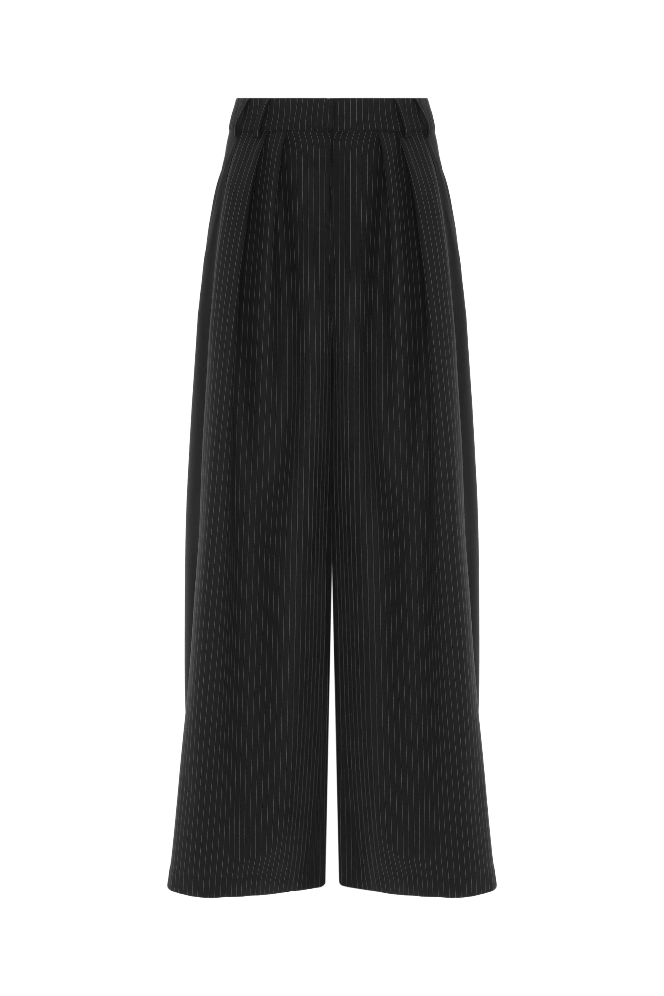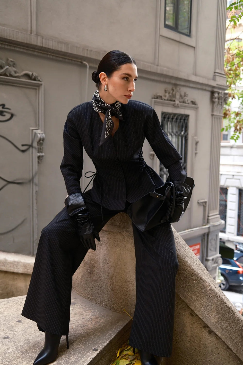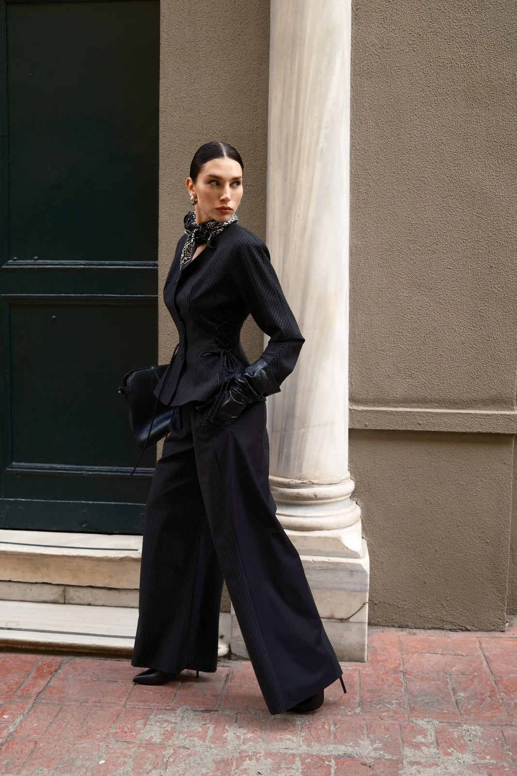 These pleated wool trousers combine the sharpness of suiting with a fluid, feminine movement. The high-waist silhouette elongates the body, while the wide flowing leg creates an elegant architectural line. Subtle pinstripes on the front and back panels contrast with the solid black side inserts — a refined detail that adds dimension and couture character. A powerful wardrobe staple for elevated city looks, business meetings, or evening styling.