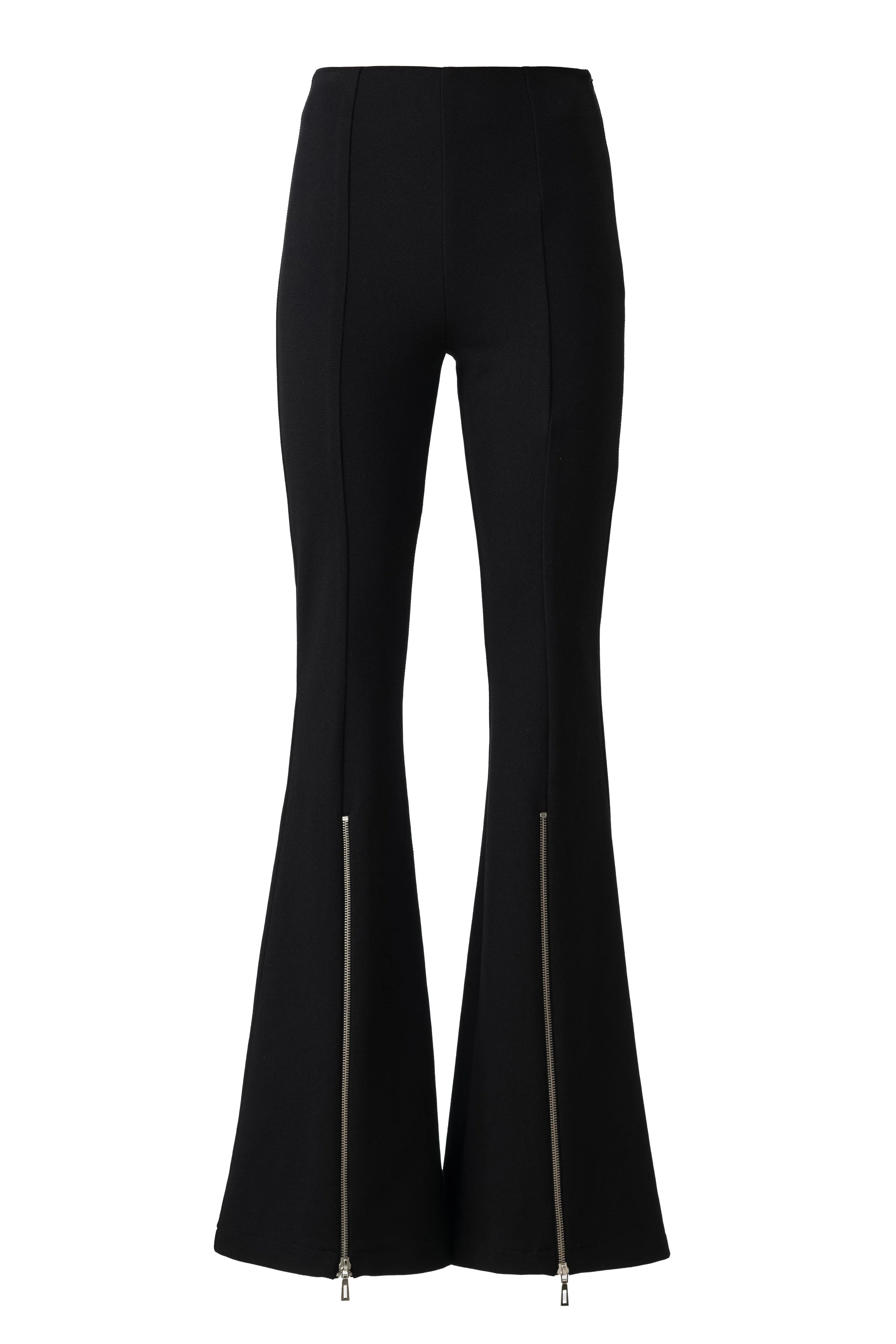 These high-waist flared trousers sculpt the silhouette with a streamlined fit through the hips and thighs, opening into an elegant flare. The front zipper accents at the hem add a contemporary edge — wear them closed for a sharp look or slightly opened for movement and attitude. A versatile essential for elevated everyday dressing or evening sophistication.