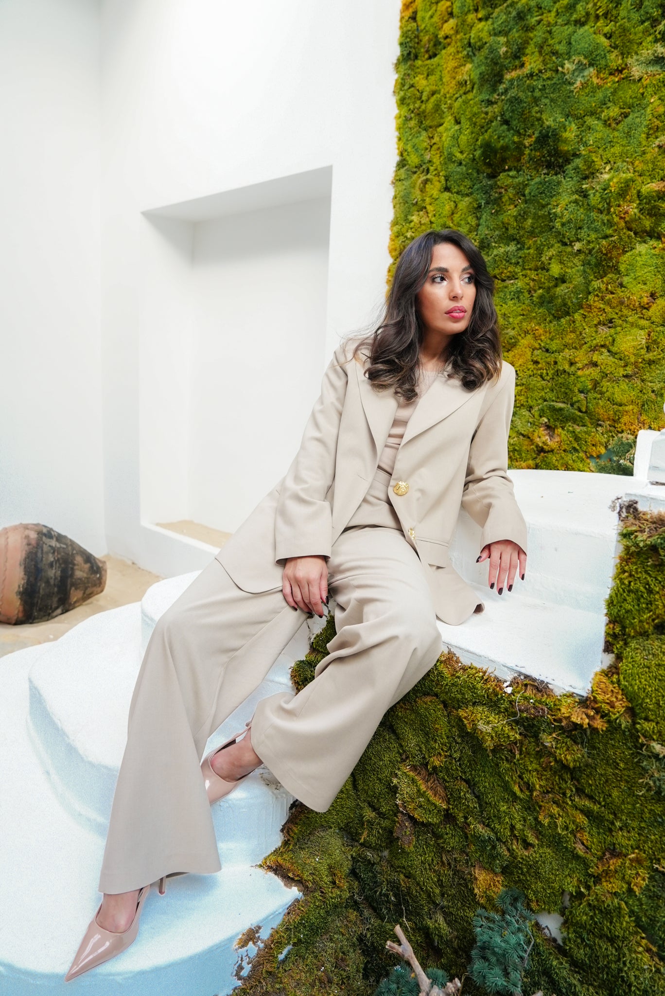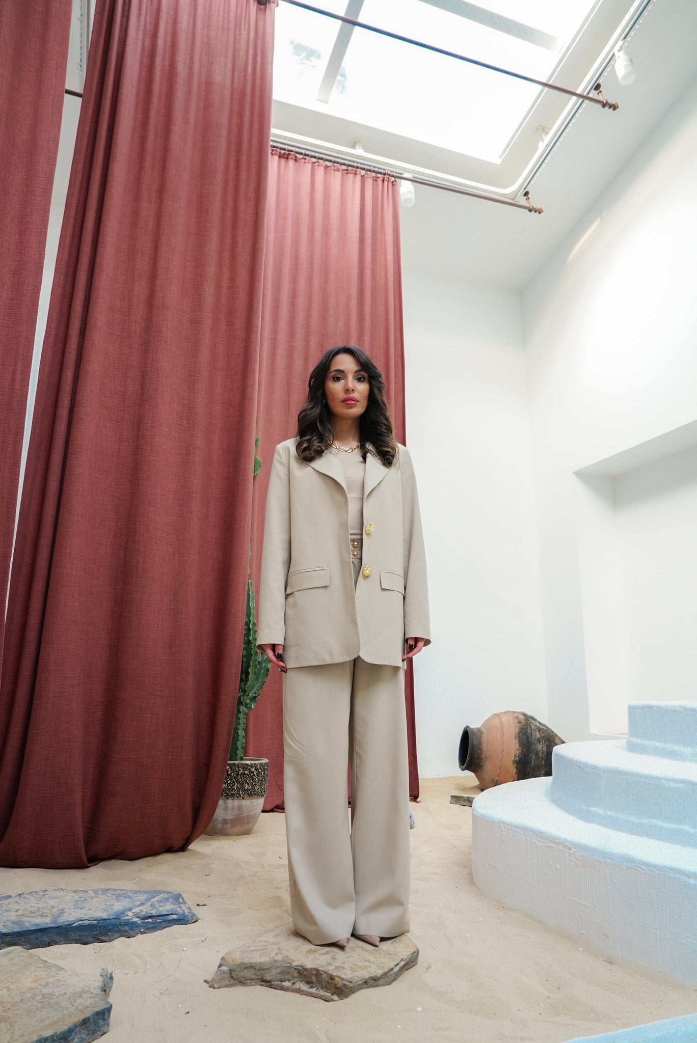 A refined take on minimalist tailoring, this two-piece suit is crafted from a soft modal blend that drapes effortlessly. The blazer features a relaxed straight cut with structured shoulders and polished gold-tone buttons, while the matching wide-leg trousers elongate the silhouette for an elegant, fluid look. A timeless set that moves seamlessly from daytime sophistication to evening understated luxury.