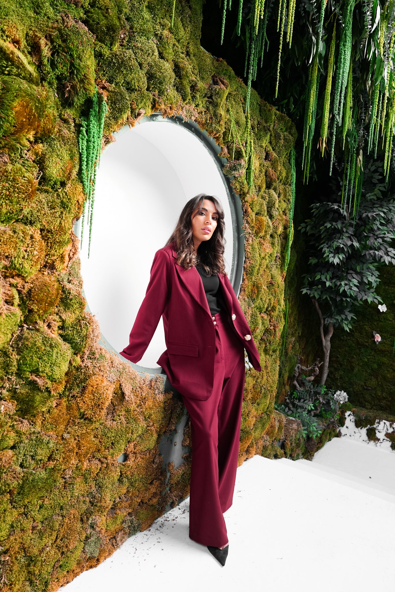 A refined take on minimalist tailoring, this two-piece suit is crafted from a soft modal blend that drapes effortlessly. The blazer features a relaxed straight cut with structured shoulders and polished gold-tone buttons, while the matching wide-leg trousers elongate the silhouette for an elegant, fluid look. A timeless set that moves seamlessly from daytime sophistication to evening understated luxury.