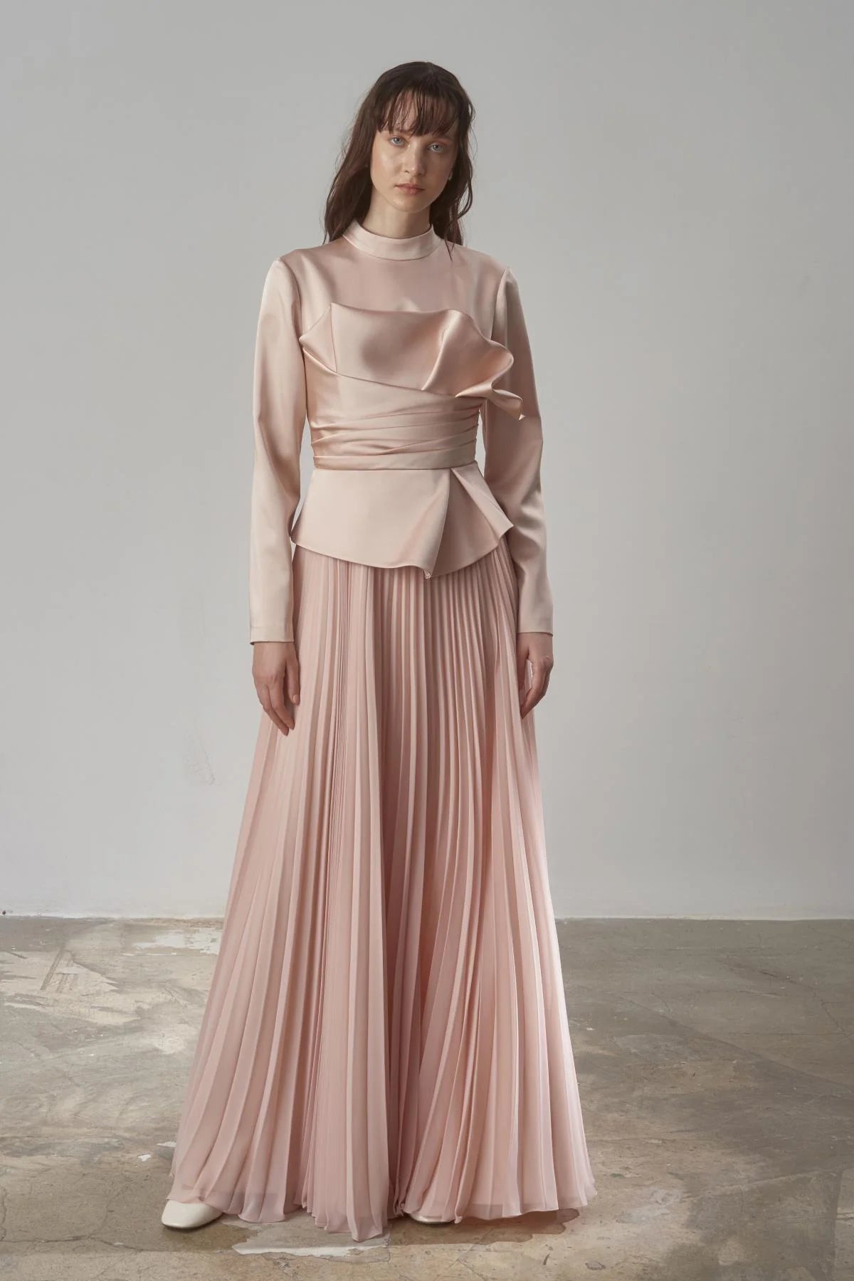 This elegant evening gown is crafted from lustrous satin and designed with a refined, sculptural silhouette. The bodice features soft draped detailing that flows seamlessly into a structured waist, creating a beautifully defined shape while maintaining full modest coverage. The skirt is finished with delicate pleats, adding movement and lightness to the overall design. Timeless, graceful, and striking in its minimalism, this gown is an ideal choice for formal events, celebrations, and special occasions.